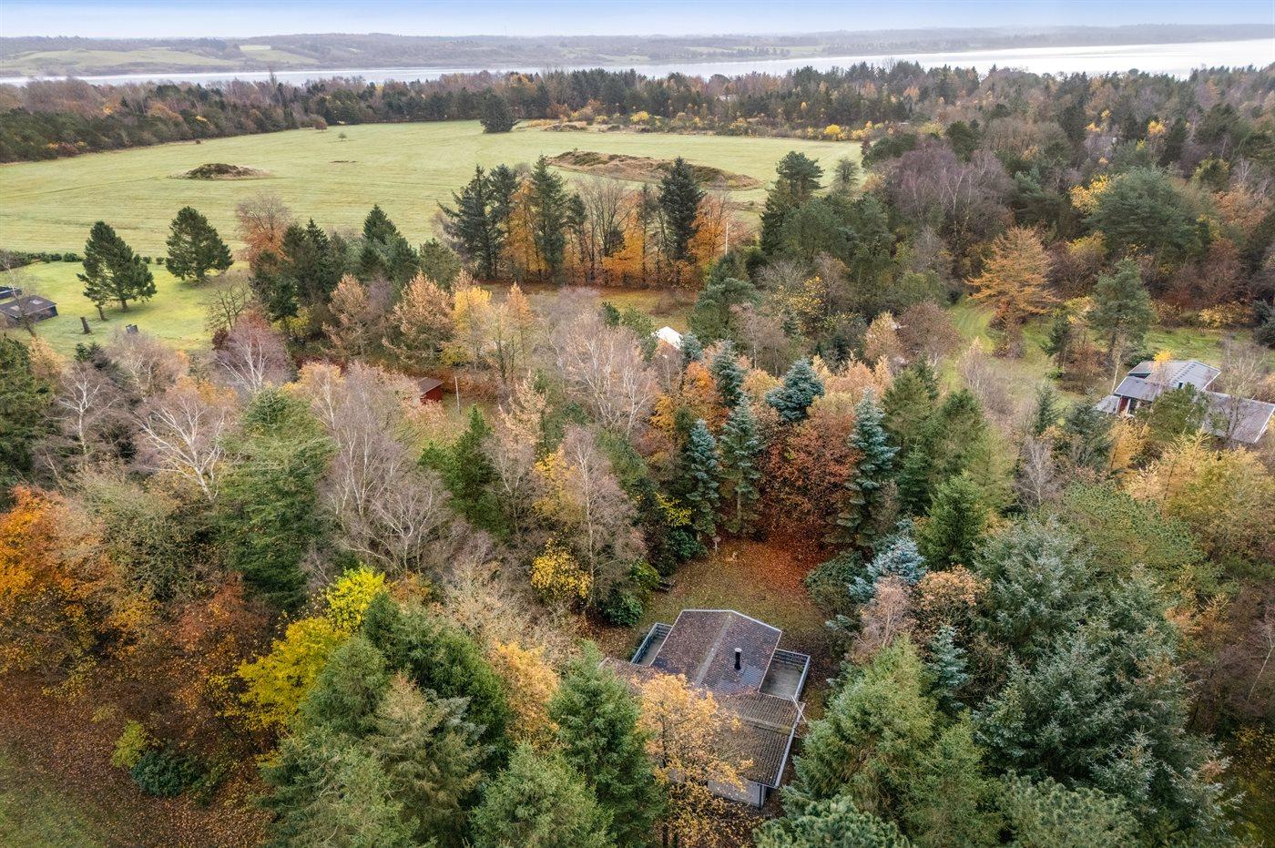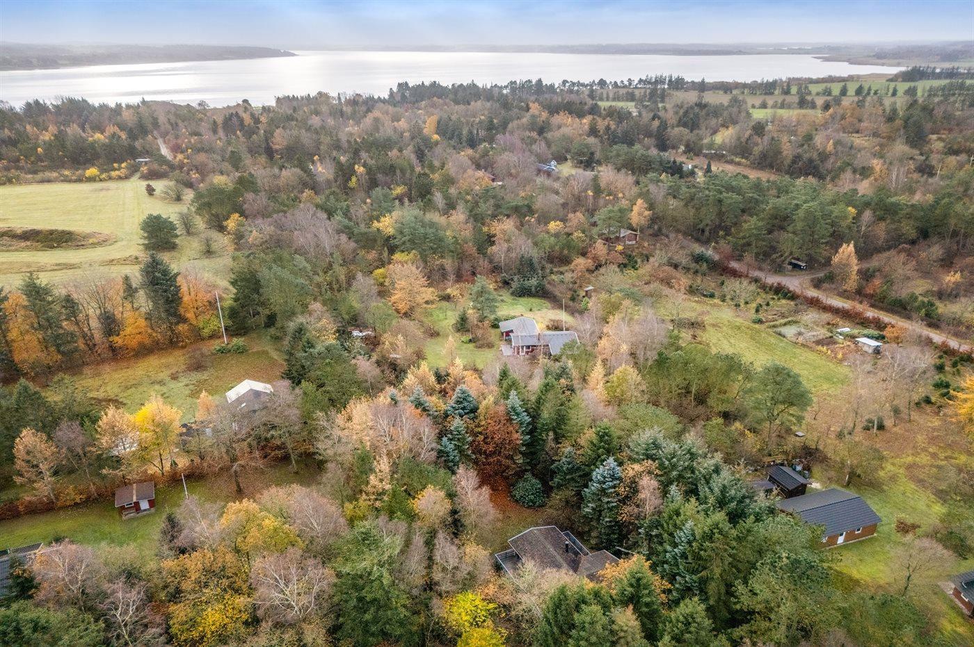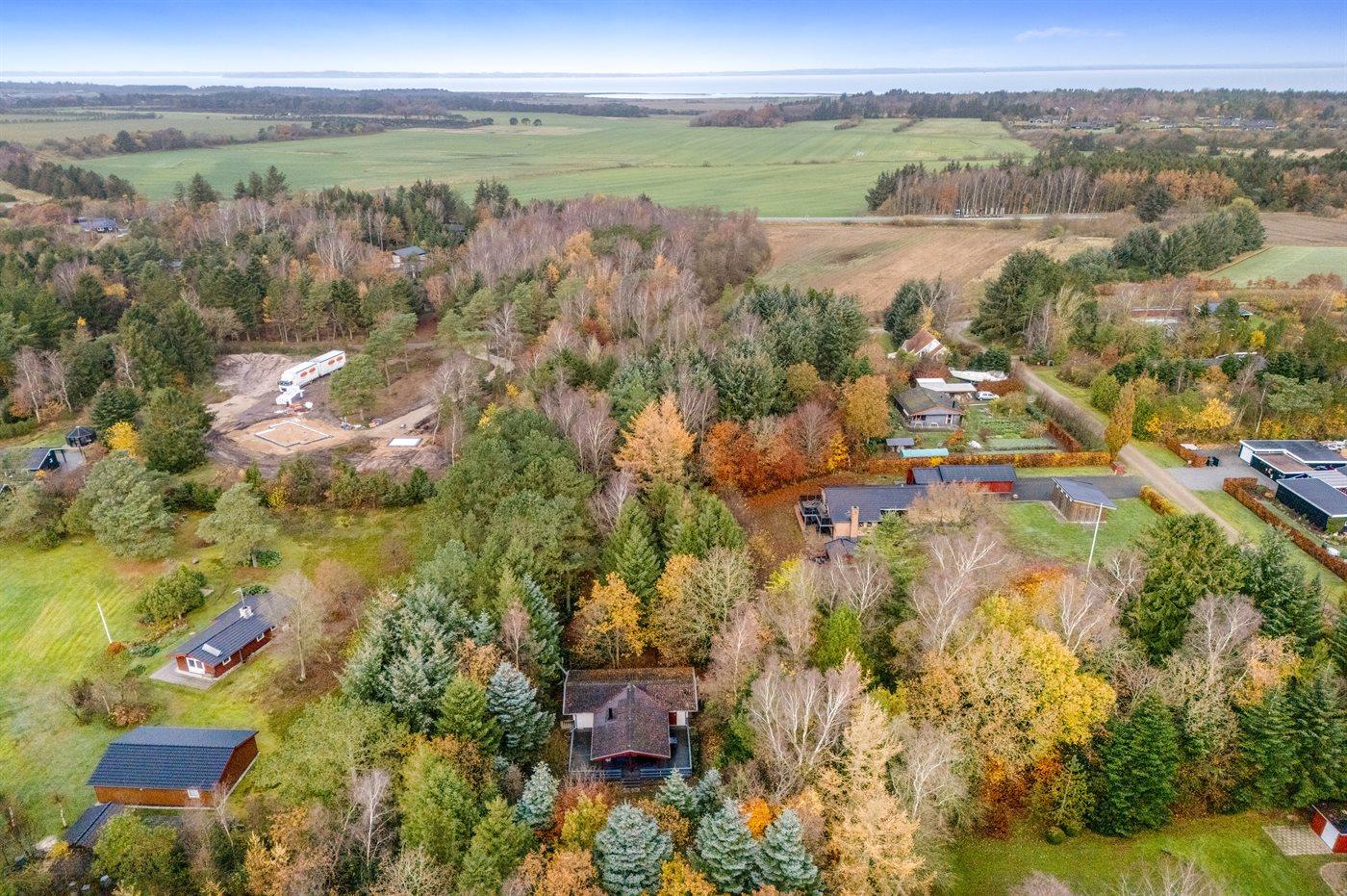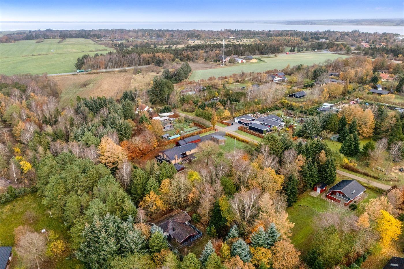 Ferieboligen er beliggende på en 5514 m² stor grund i skov/plantage. Grunden er indhegnet. Der er 600 m til fjorden. Der er en sø i en afstand af 300 m. Nærmeste forretning er beliggende i en afstand af 5000 m. Til ferieboligen hører åbent terrasseareal. Desuden er der overdækket terrasse. Parkering ved ferieboligen.