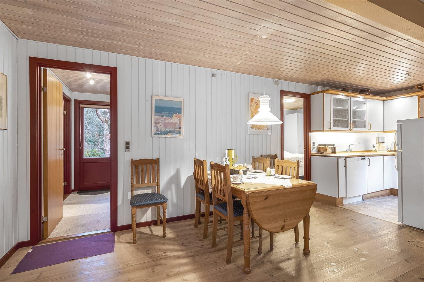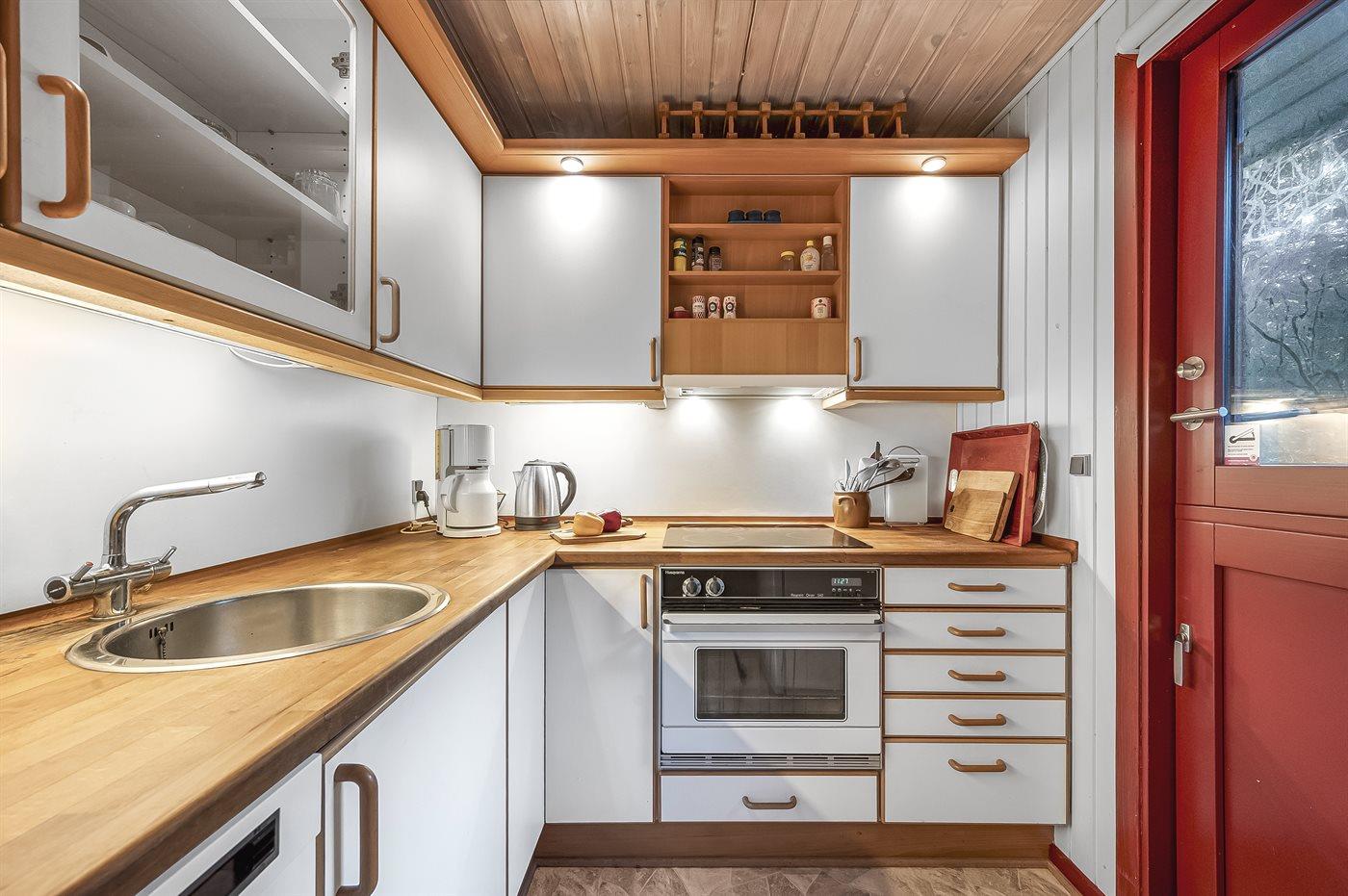 Køkkenet er udstyret med 1 køleskab. Der er 4 keramiske kogeplader, varmluftovn, mikrobølgeovn samt opvaskemaskine.