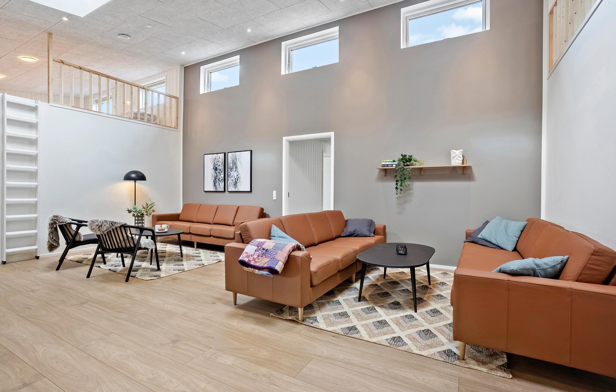 Oplev en behagelig pause med familien eller en større gruppe i dette eksklusivt indrettede feriehus. Her finder I ideelle betingelser for afslapning, leg og hygge sammen. Gå ind i den lyse stue med højt til loftet og moderne møbler. Find jer godt til rette i et af de hyggelige sofahjørner eller træk jer tilbage på hemsen med en bog. Brug det åbne, moderne køkken med en rummelig kogeø og nyd måltiderne sammen ved det lange spisebord. Dyk ned i den rummelige indendørs pool med vandrutsjebane og afslut dagen i spabadet. Der tilbydes underholdning i aktivitetsrummet med bordtennis, billard og dart.