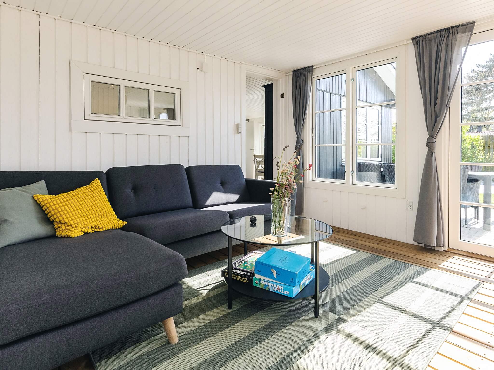 Indvendigt flyder det åbne køkken og spiseplads naturligt over i stuen og skaber et lyst og indbydende rum. Stuen har en hyggelig brændeovn, et tv med Chromecast og en komfortabel sofa med chaiselong. De tre soveværelser har dobbeltsenge, og for familier, der rejser med små børn, kan der arrangeres en barneseng og en højstol efter anmodning. Badeværelset er udstyret med brusebad, toilet, håndvask og håndklædetørrer, og bryggerset har en vaskemaskine for ekstra bekvemmelighed.