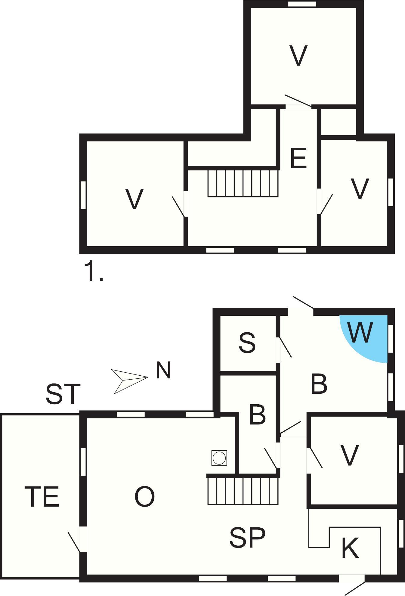 1 Opholdsstue: Brændeovn, tv, video, parabol, høj stol