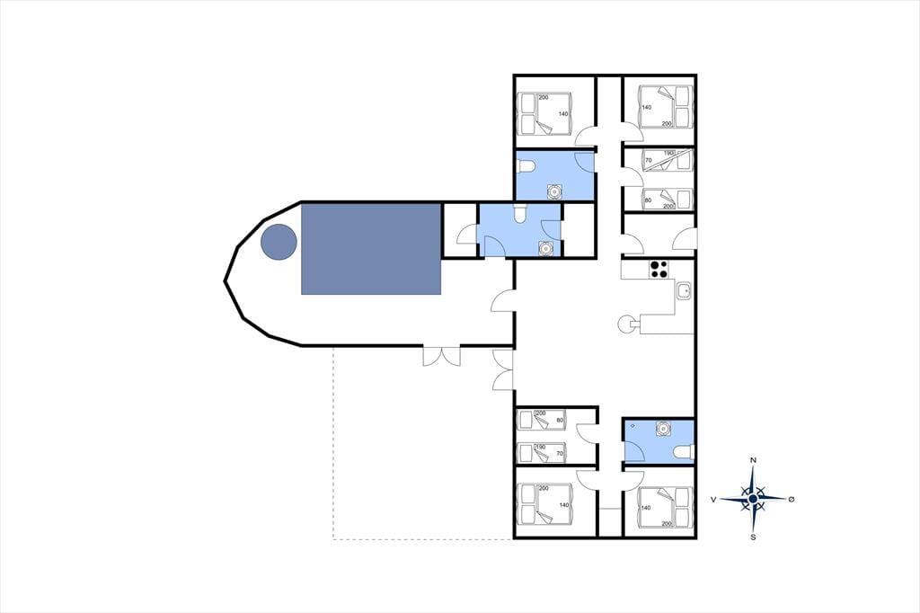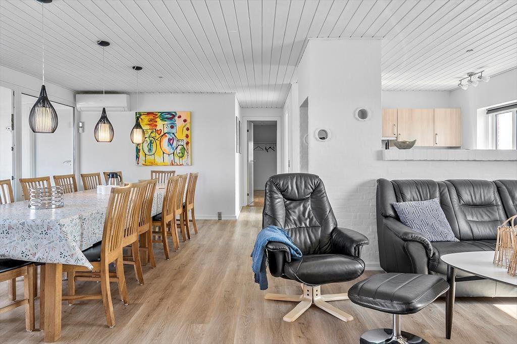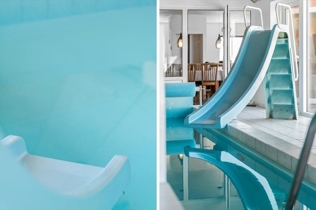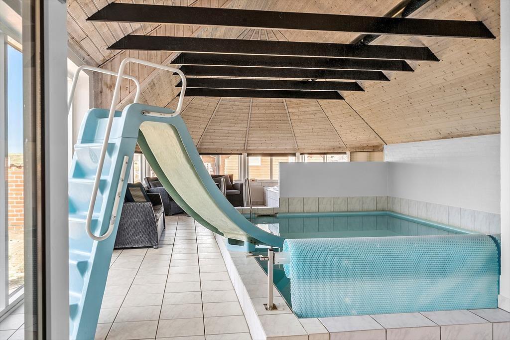 Når du træder ind i dette indbydende sommerhus, mødes du af en rummelig stue, hvor store vinduespartier leder dagslyset ind og giver udsigt til det omkringliggende klitlandskab. Den åbne planløsning forbinder stuen med køkkenet, hvilket skaber en hyggelig atmosfære for fælles madlavning og samvær. Husets hjerte er det imponerende poolområde, hvor børnene kan plaske rundt på vandrutsjebanen, mens de voksne slapper af i spabadet. Efter en dag fuld af aktiviteter kan du trække dig tilbage til et af de seks komfortable soveværelser, der alle er indrettet med henblik på en god nats søvn.