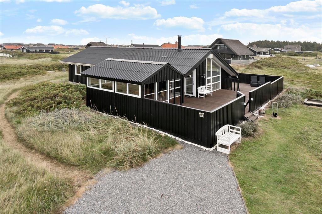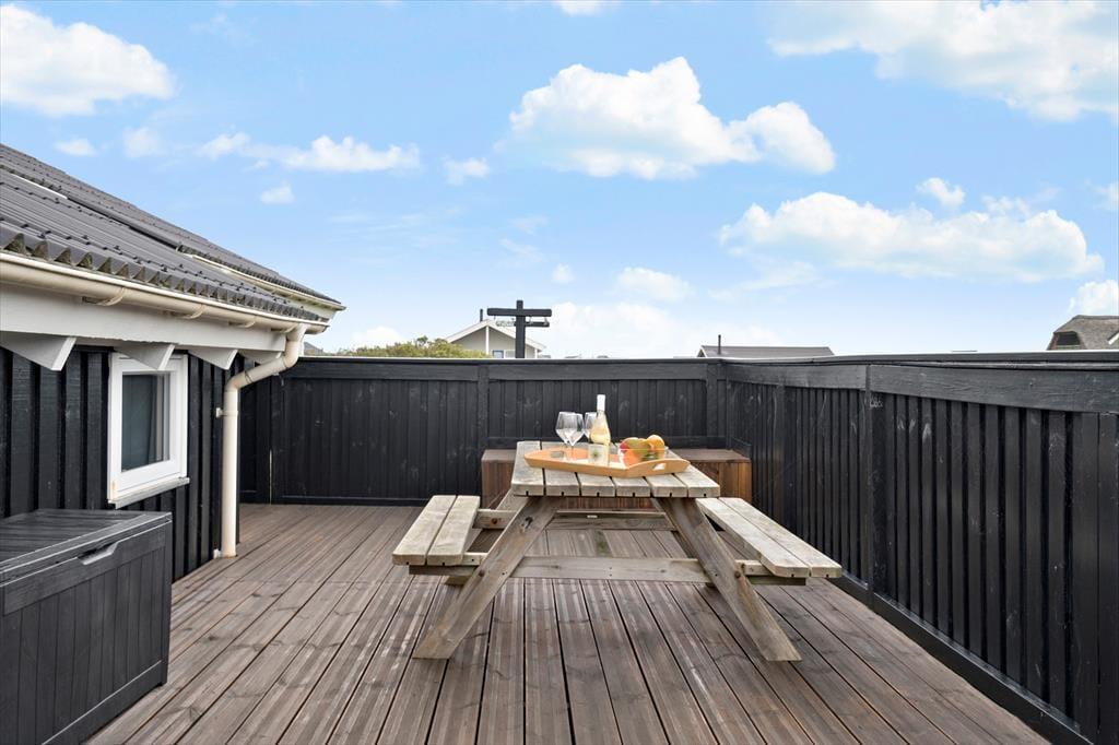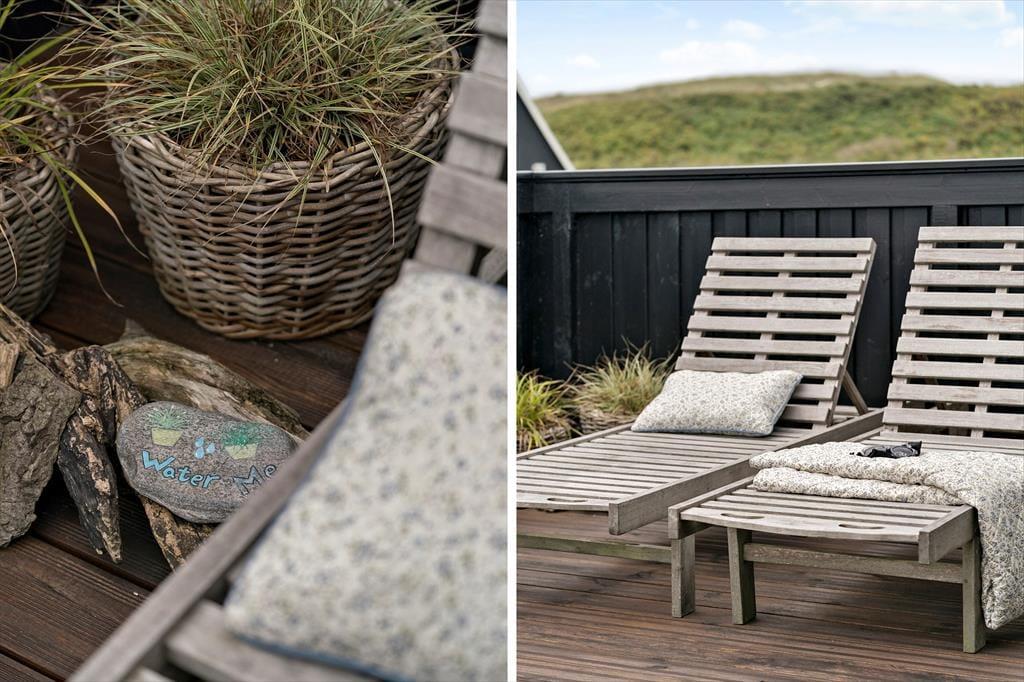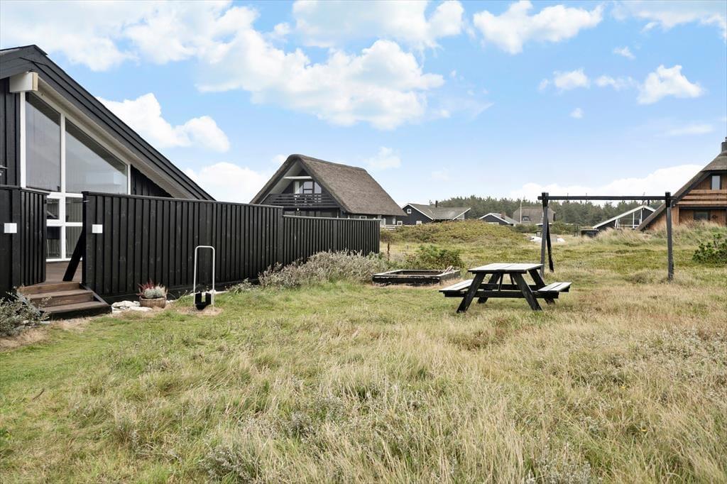 Den store terrasse, som delvist er overdækket, gør det muligt at nyde udelivet uanset vejret. Her kan du drikke morgenkaffen i solen, dække op til frokost i læ eller grille på de lange, lyse sommeraftener. I haven finder børnene hurtigt hen til gyngen og sandkassen, mens de voksne måske finder en rolig krog med udsigt til himmel og klitter. Duften af hav minder dig hele tiden om, hvor tæt du er på stranden – og skulle du få lyst til en aftendukkert eller en tur langs vandkanten, er der blot 100 meter at gå.