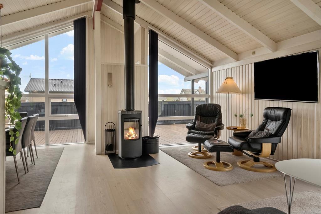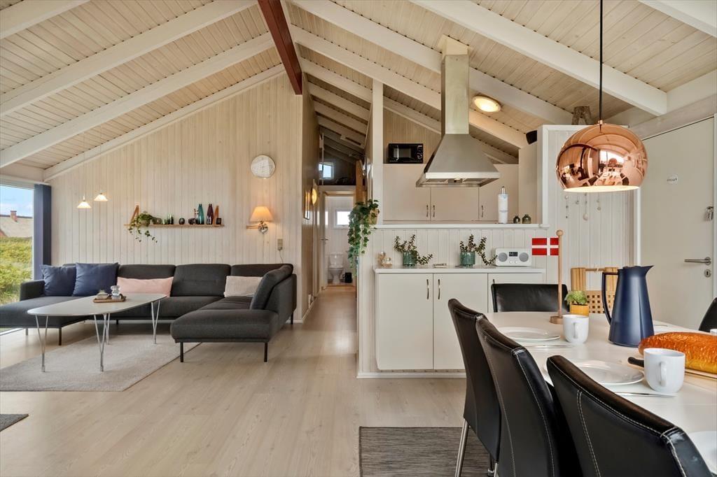 Det første, du lægger mærke til, når du træder ind i sommerhuset på Fourmivej 68, er den lyse og indbydende atmosfære. Her er det nemt at slappe af og komme ned i gear, for indretningen er både smagfuld og hyggelig, med store vinduer, der trækker lyset og naturen med ind i stuen. Køkken, spiseplads og opholdsområde ligger i åben forbindelse, så du hele tiden er tæt på hinanden – hvad enten du laver mad, spiller spil eller hygger dig med en god film. Når det er tid til forkælelse og afslapning, kan du læne dig tilbage i den indendørs spa eller nyde varmen i husets sauna. Det er ferie med komfort og velvære i højsædet.