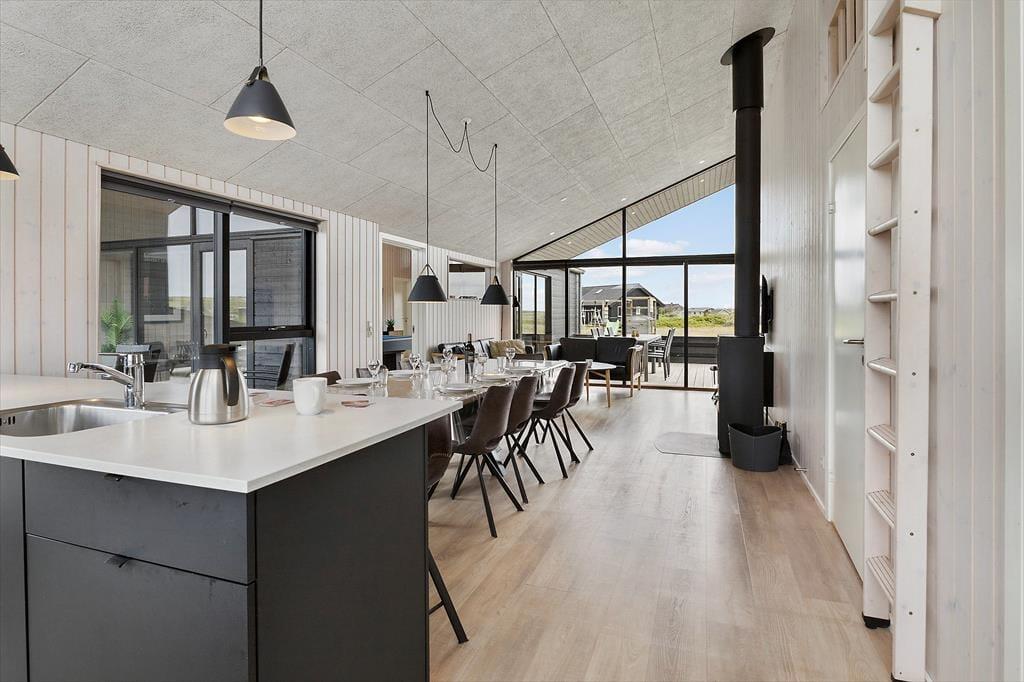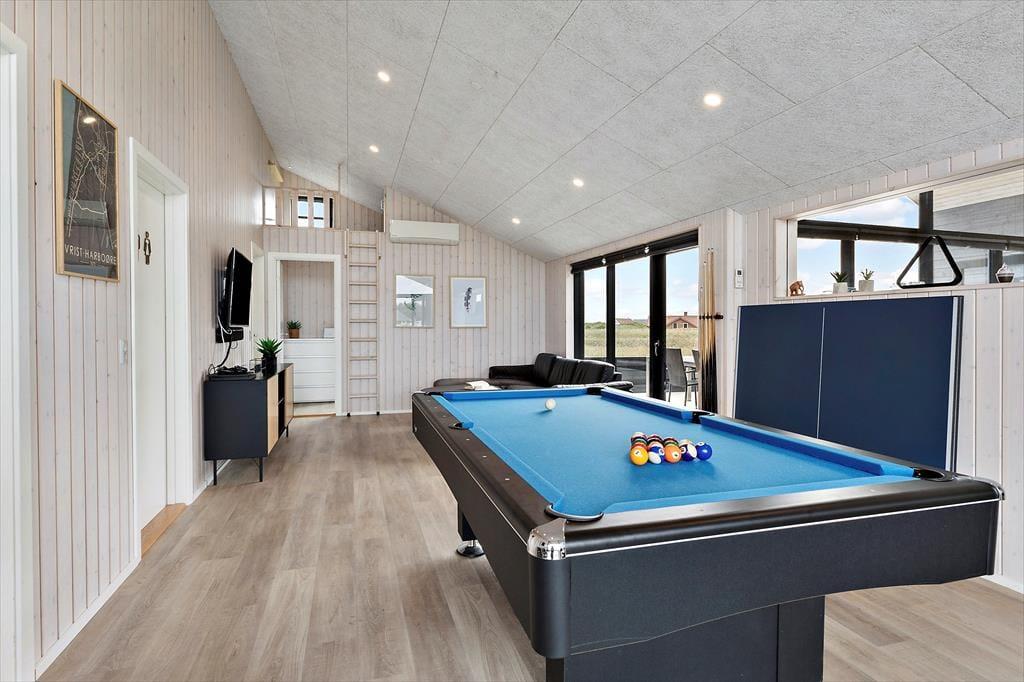 Når I træder indenfor i dette dejlige sommerhus, mødes I af en lys og luftig indretning, der emmer af afslapning og ferie. Køkken og stue ligger i åben forbindelse og fungerer som det naturlige samlingspunkt for hyggelige måltider og samtaler i afslappede rammer. Når der skal være lidt mere gang i den, er aktivitetsrummet klar med både billardbord og bordtennis – ideelt til familiens egne turneringer og fælles grin. To hemse giver ekstra opholdsrum til både børn og voksne, der ønsker en stille stund. Efter en lang dag i den friske havluft er det oplagt at finde ro i husets wellnessområde, hvor både spa og sauna står klar til at give kroppen ny energi og sindet fuld afslapning.