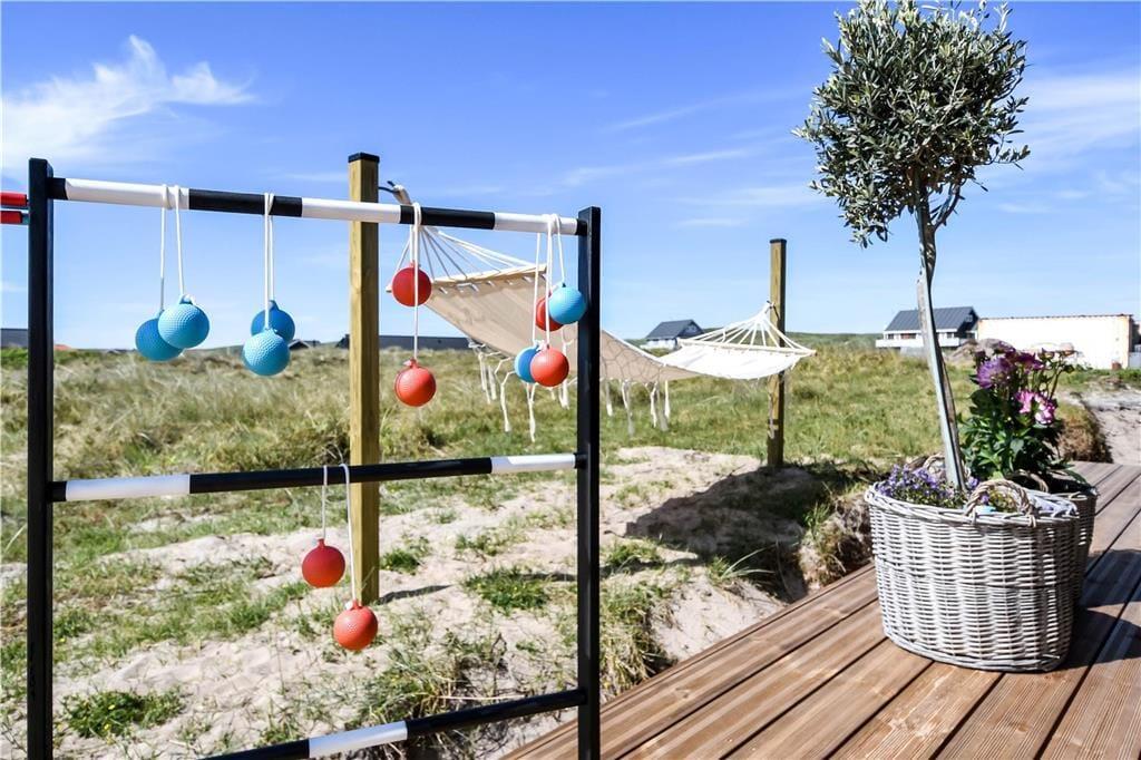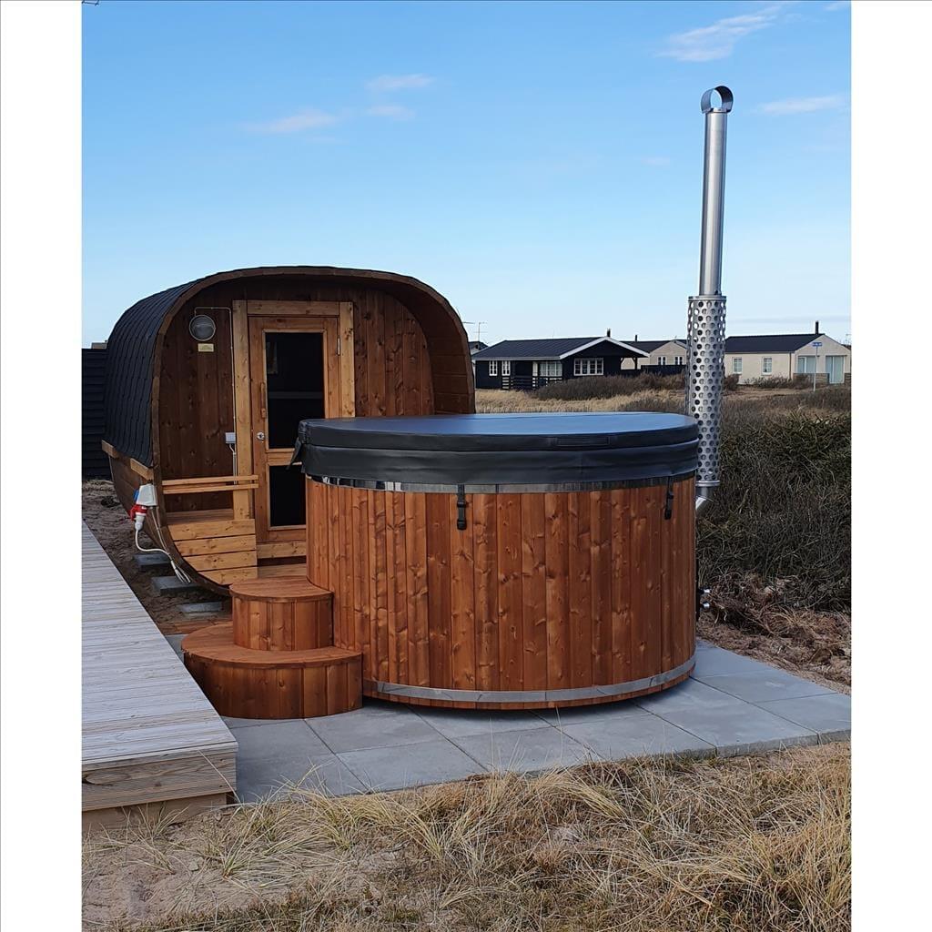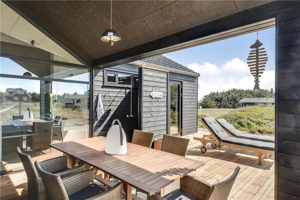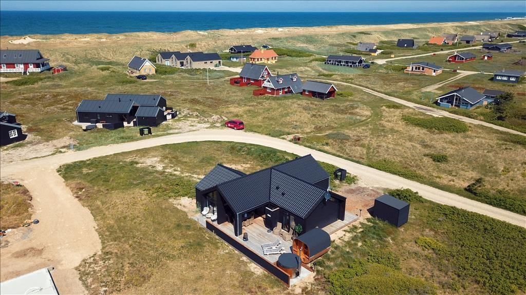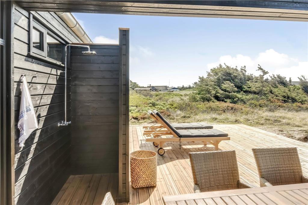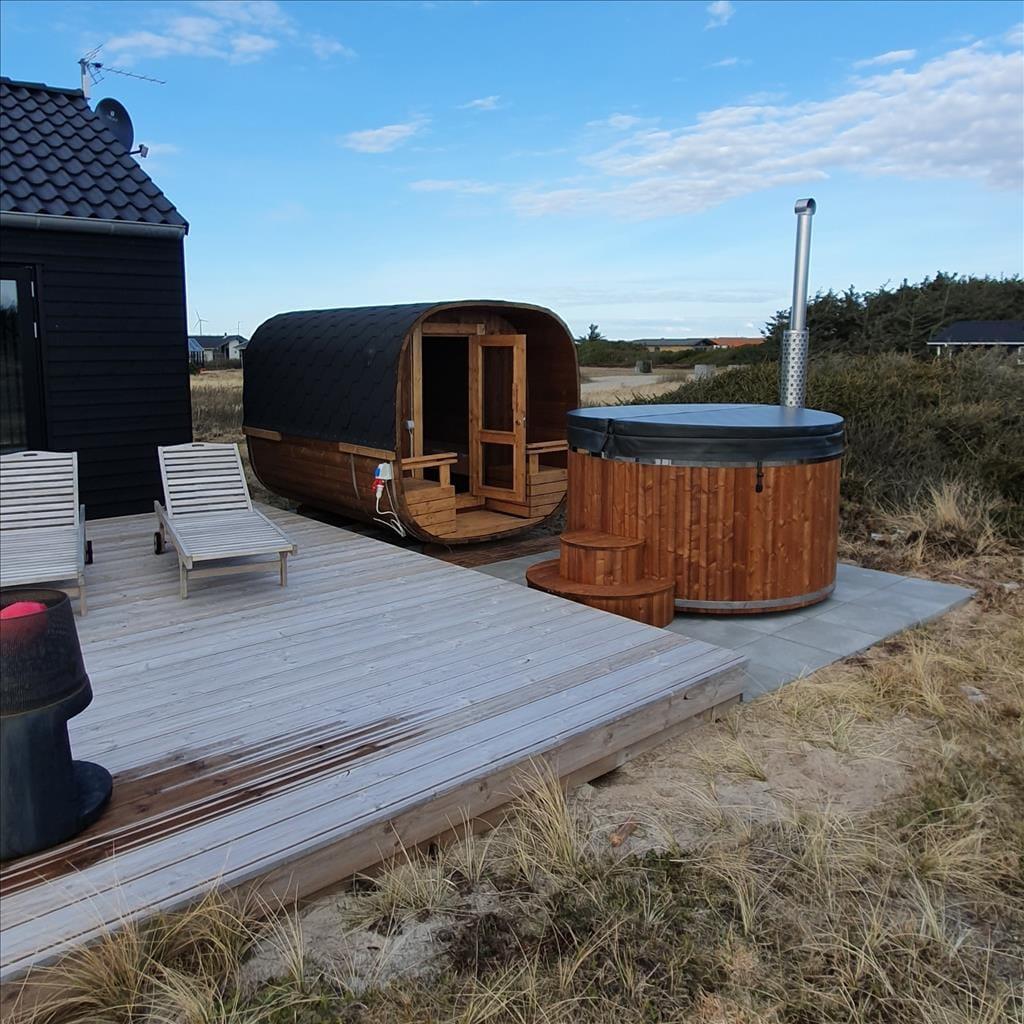 Udelivet får optimale vilkår her – ikke mindst takket være husets to terrasser, hvoraf den ene er delvist overdækket. Her kan I sidde i læ med et tæppe om benene og nyde solnedgangen eller sætte jer til bords med friskfanget fisk på grillen. Og så er der vildmarksbadet – det står klar i haven og bliver hurtigt et samlingspunkt, når mørket falder på. Den tilhørende udebruser og sauna fuldender wellness-oplevelsen under åben himmel. Der er god plads omkring huset, og med klitterne som bagtæppe får haven en helt særlig stemning af fred og nærhed til naturen. Her kan I lægge hverdagen bag jer og bare være – i solen, i dampen, i boblerne eller på vej til endnu en tur til stranden.