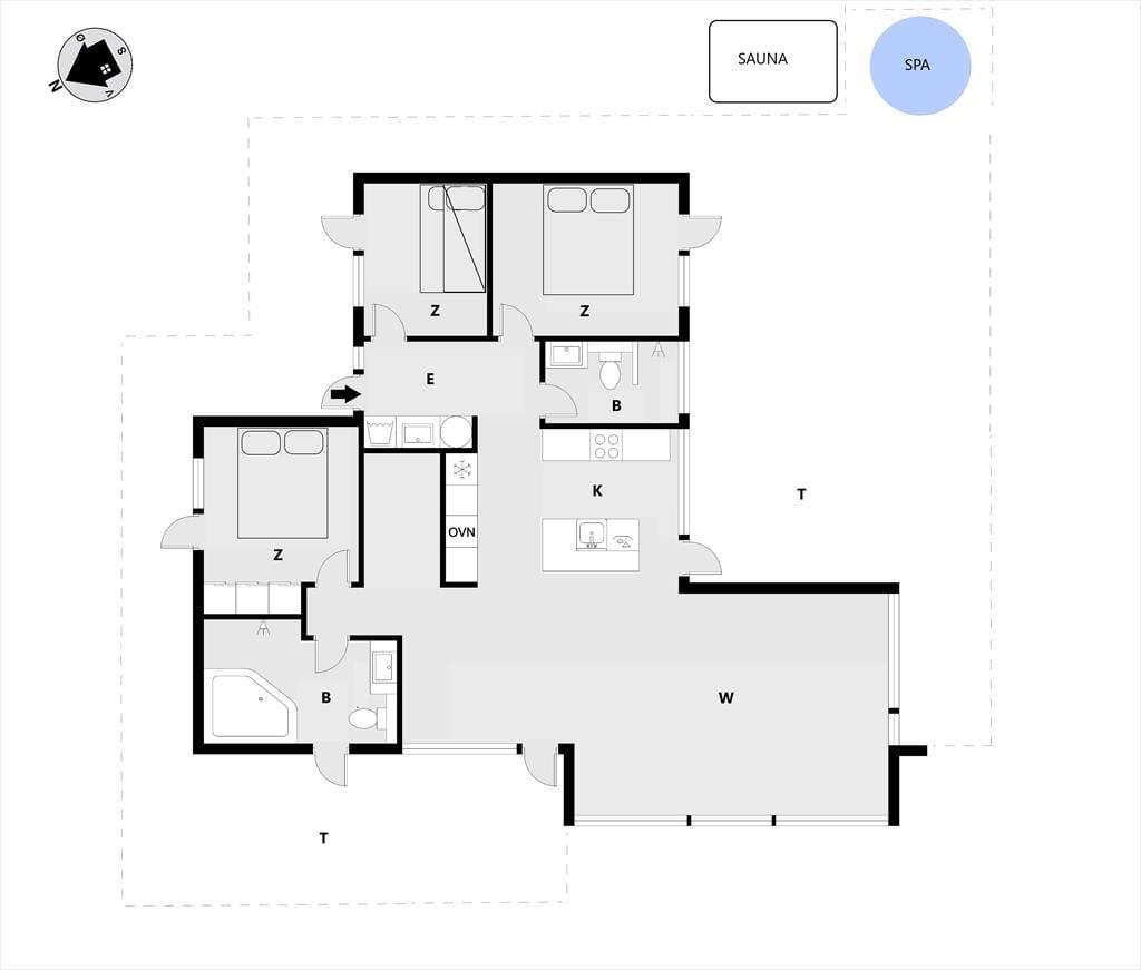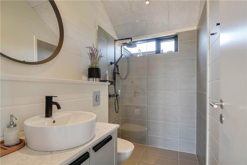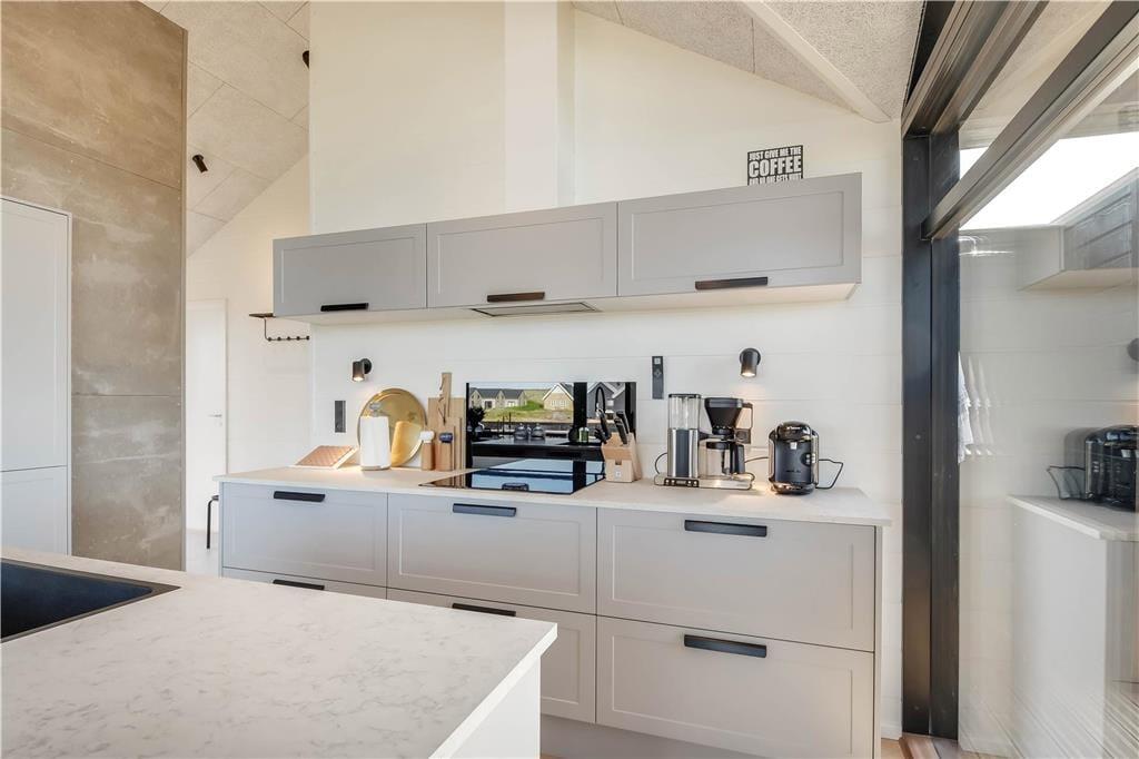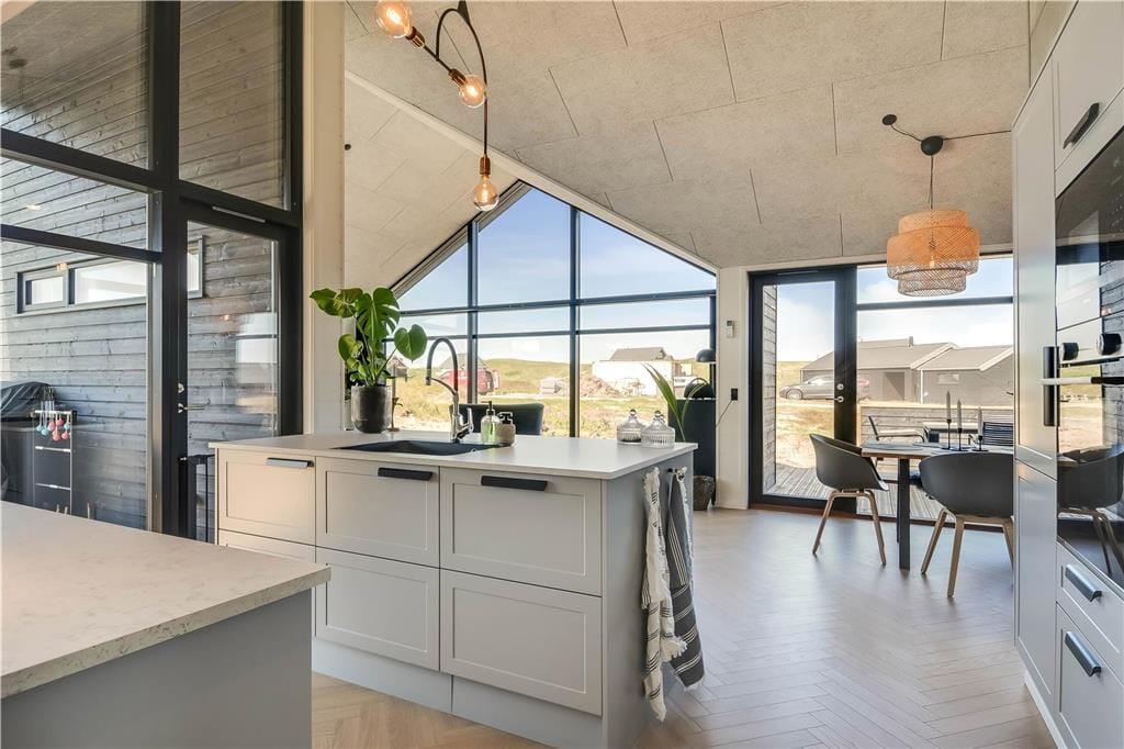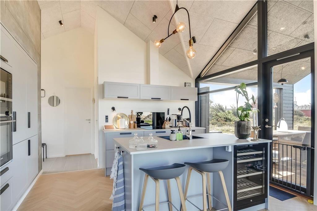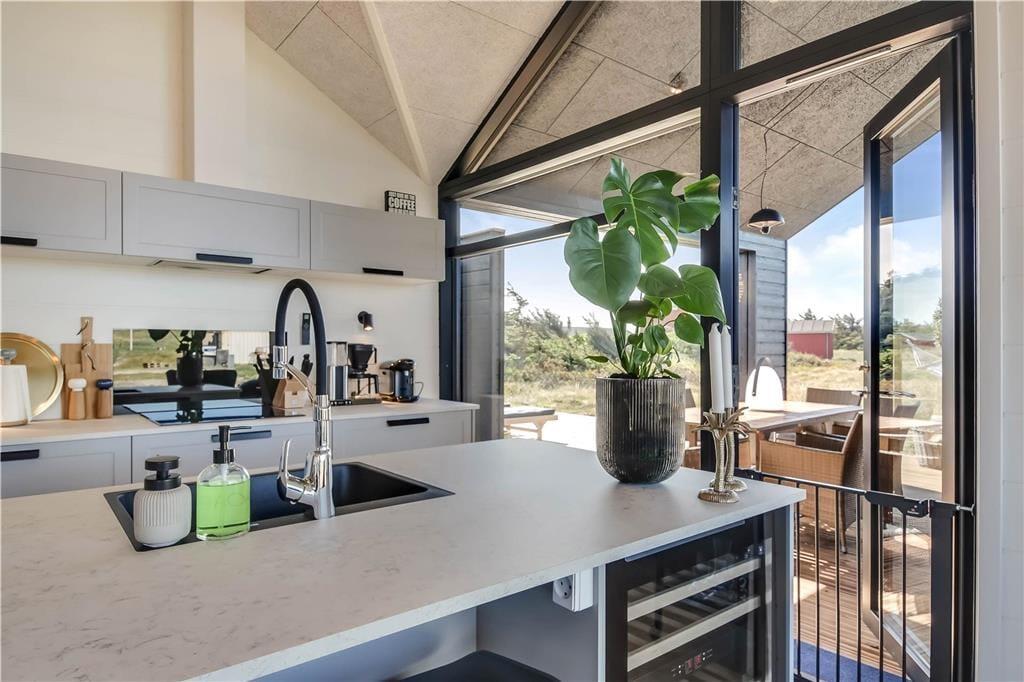 Det første, man lægger mærke til, når man træder ind i sommerhuset på Hvilehjemsvej 17, er den gennemførte stil og de mange fine detaljer – ikke mindst biopejsen i stuen, der skaber hygge på kølige aftener og giver et roligt skær til de fælles stunder. Stue og køkken ligger i åben forbindelse, så det er nemt at være sammen om både madlavning, kortspil og kaffepauser. Husets hems giver ekstra plads og er perfekt som hyggeligt læsehjørne eller gemmested for børn med feriefantasien i fuldt flor. Når I har været ude i den friske vestenvind, er det oplagt at finde ro i husets indendørs spa – eller lade skuldrene sænke sig i saunaens varme.