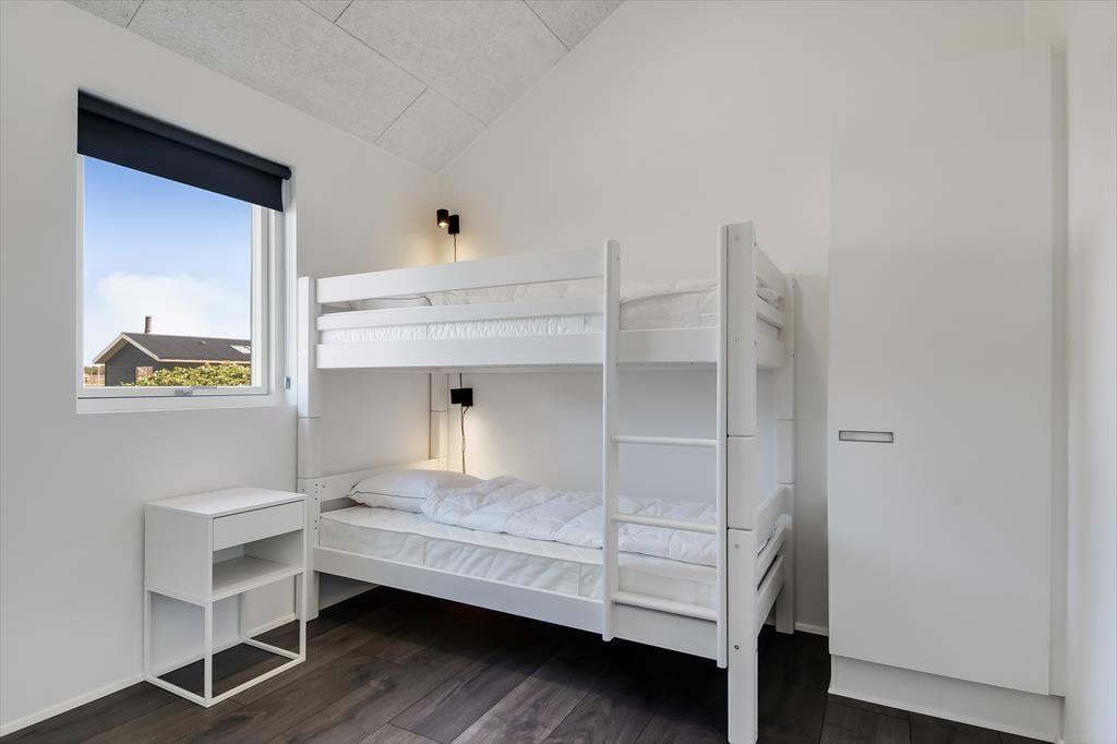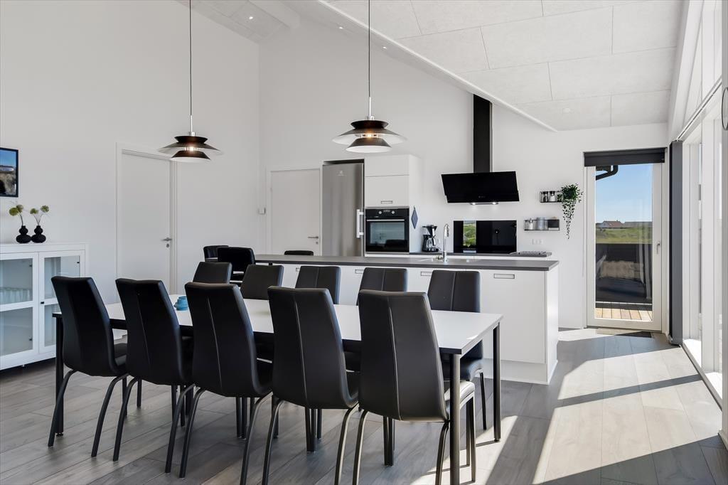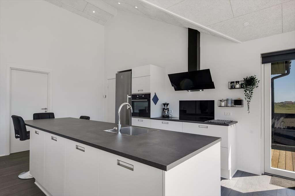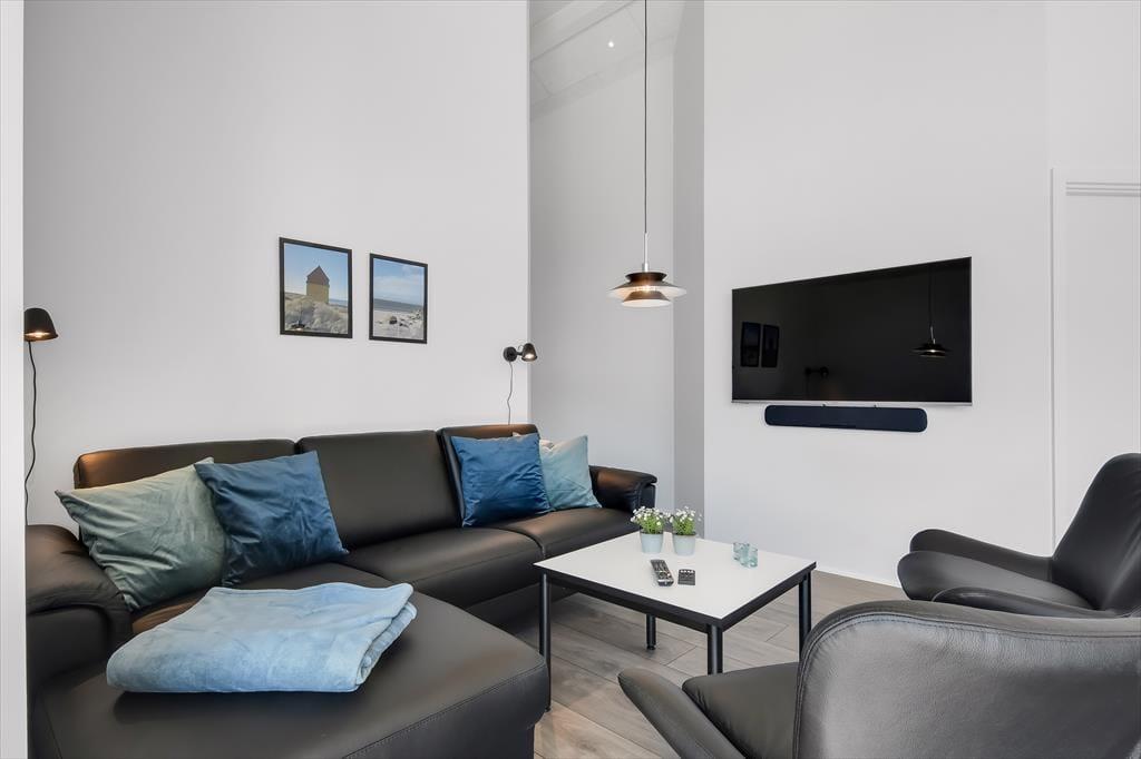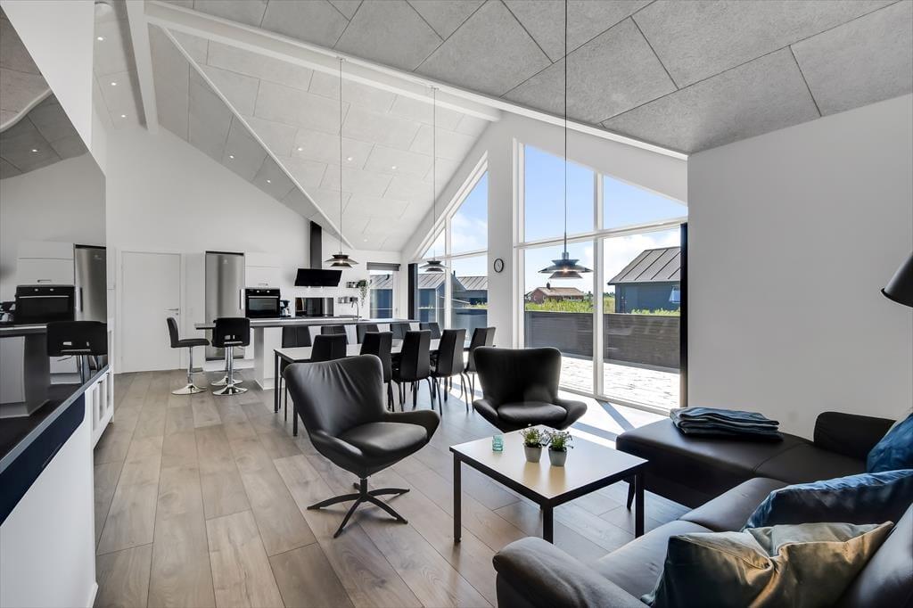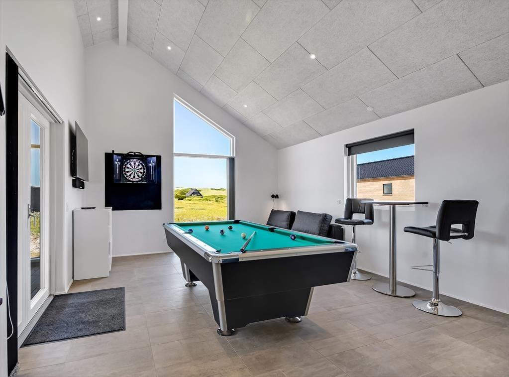 Indenfor mødes du af et lyst og indbydende sommerhus, hvor loft til kip og store vinduespartier giver en skøn rummelighed og masser af dagslys. Sommerhuset er indrettet med tanke på både samvær og adspredelse, og det mærker du især i det hyggelige opholdsrum, hvor køkken, spiseplads og stue smelter sammen til ét hjerterum. Her kan du lave mad, læse en bog i sofaen eller spille brætspil, mens ilden knitrer i brændeovnen – alt sammen i samme afslappede stemning. Men der er også mulighed for mere liv og leg, for huset byder på et aktivitetsrum, hvor der kan dystes i både pool og dart – og her er det svært ikke at blive revet med af feriestemningen, mens latteren runger mellem væggene. Med plads til op til 10 personer og en gennemtænkt planløsning er her god plads til både store og små, og du vil hurtigt opleve, hvordan huset indbyder til fælles ferieglæde.