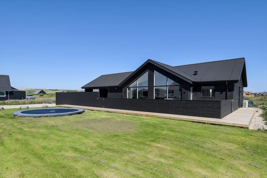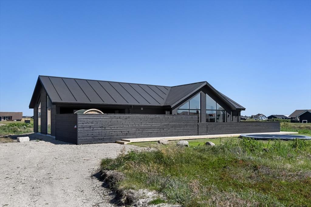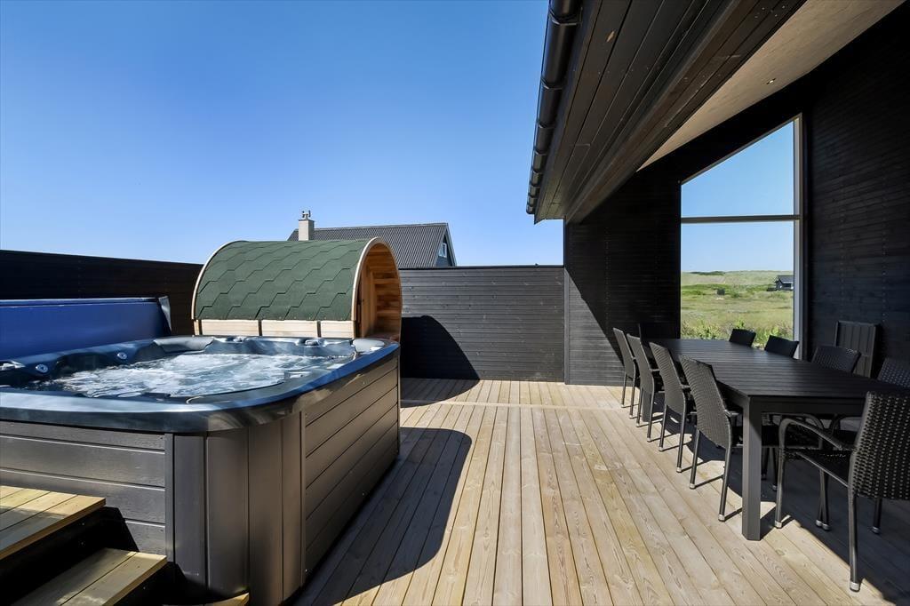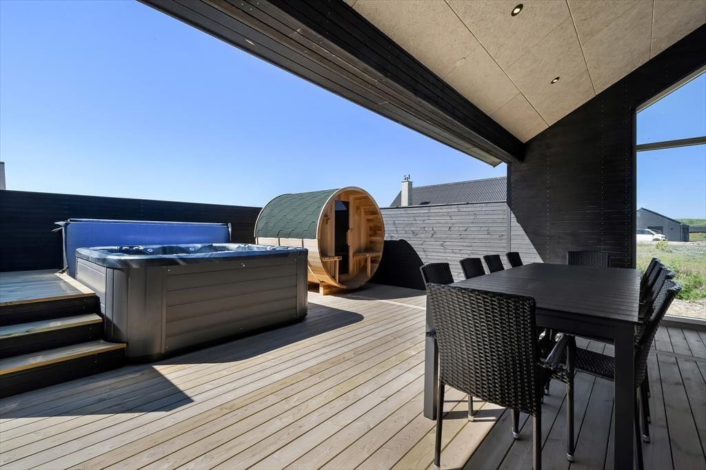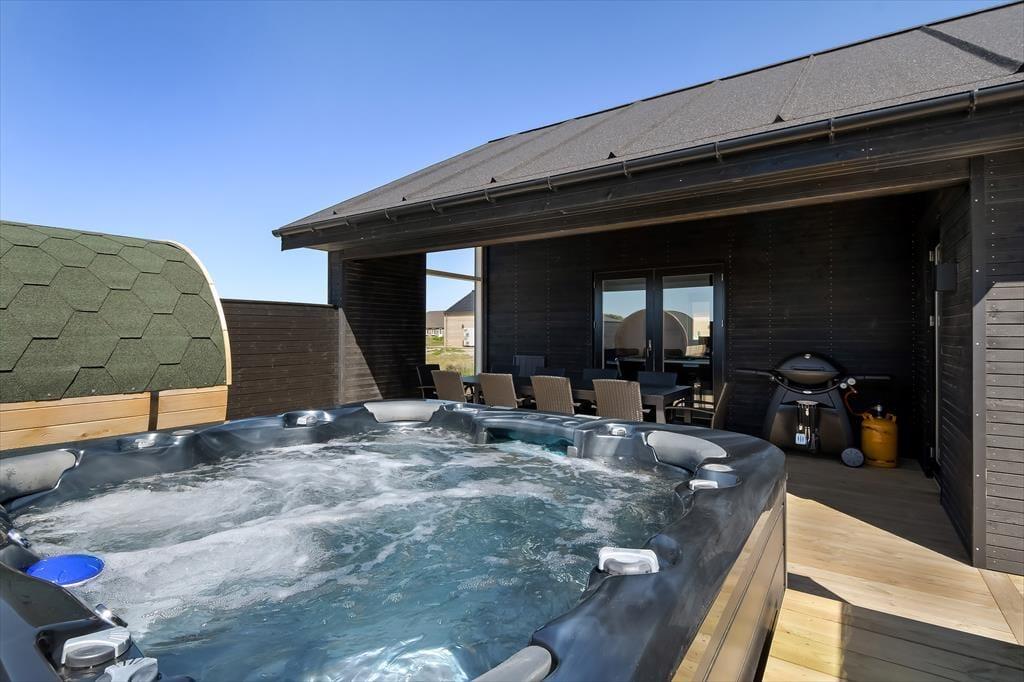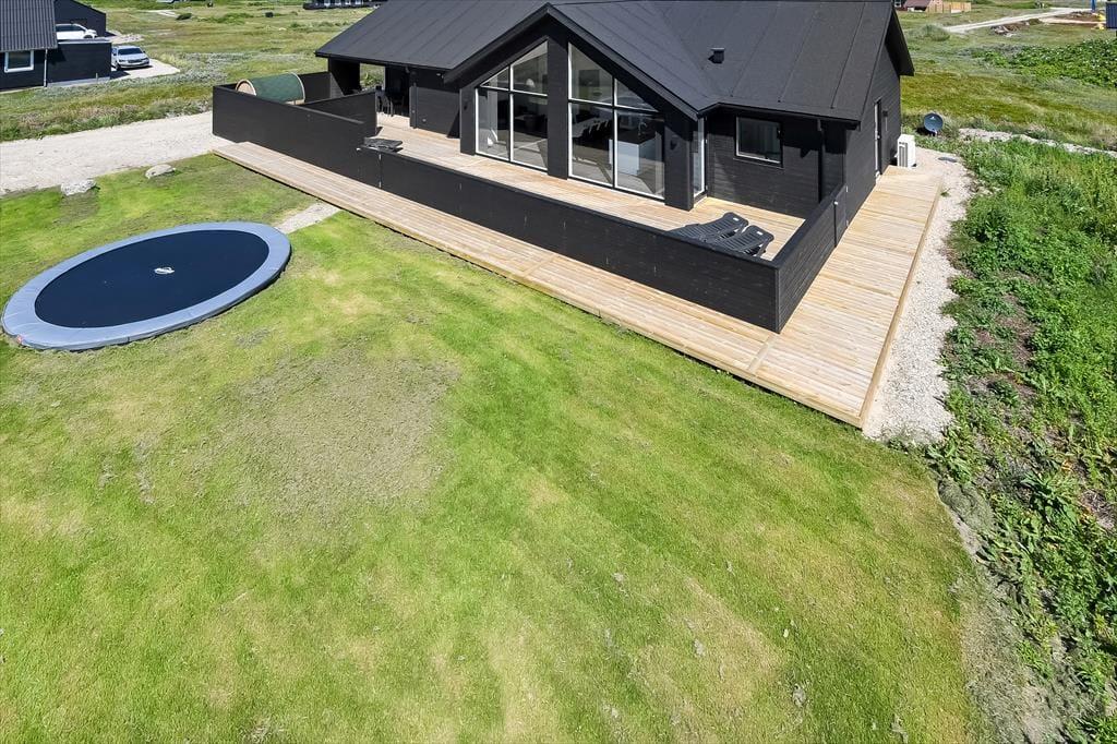 Haven omkring huset er stor og grøn – og et sandt paradis for børnene, som kan bruge timer på trampolinen, mens de voksne slapper af med en kop kaffe i solen. På den rummelige træterrasse er der masser af plads til både grillmiddage og afslapning, og som noget helt særligt venter en udespa og en tøndesauna, der fuldender følelsen af luksus og velvære. Du kan begynde dagen med en stille stund i det varme vand og afslutte den med et saunabesøg, mens solen går ned over sommerhusområdet – og på de klare aftener, hvor stjernerne titter frem, føles det næsten som at være langt væk fra alting. Her får du frihed og afslapning i det fri, uanset om solen skinner fra en blå himmel eller vinden suser blidt fra vest.