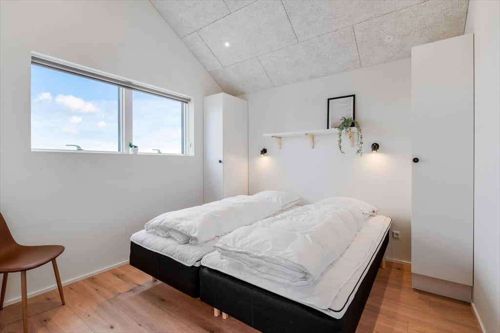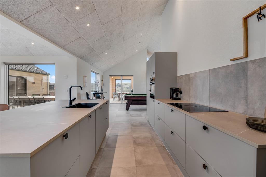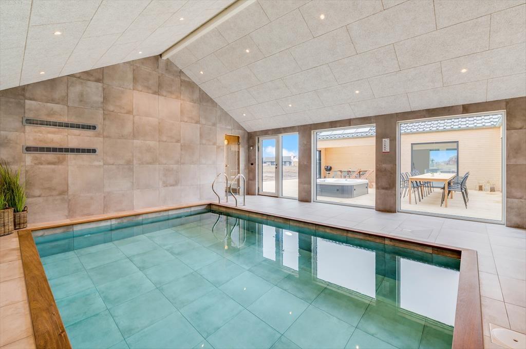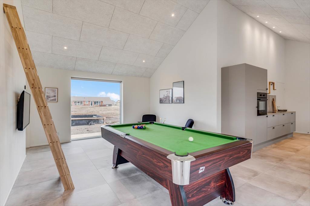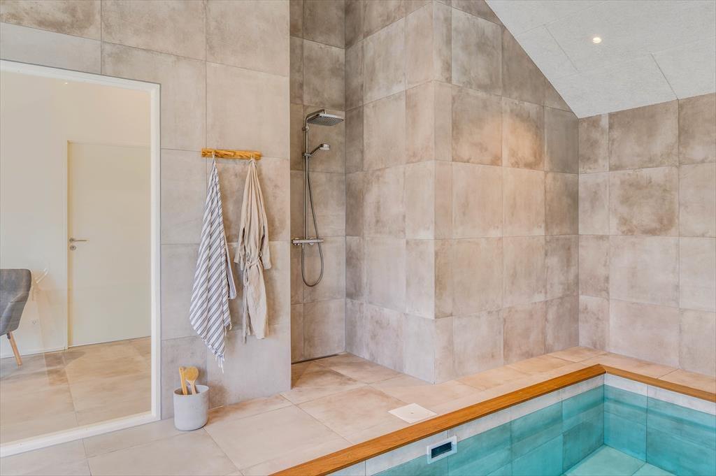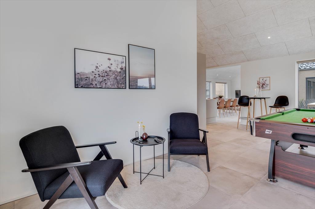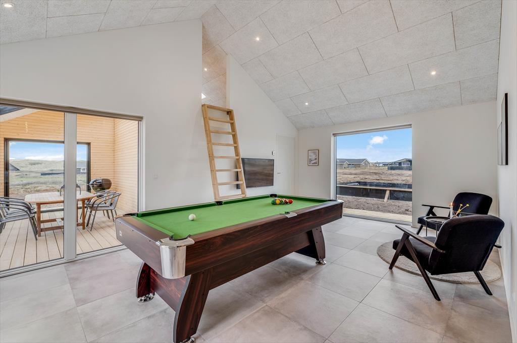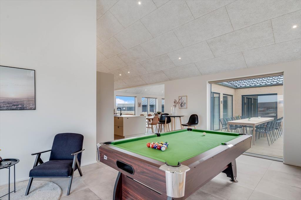 Det store sommerhus er gennemtænkt indrettet med fine detaljer og en lys og indbydende atmosfære, der gør det let at føle sig hjemme. Stue og køkken ligger i åben forbindelse og bliver hurtigt det naturlige samlingspunkt, hvor ferielivet leves med madlavning, snakke og hygge. Når det er tid til afslapning og selvforkælelse, kan du bevæge dig ind i den flotte poolafdeling, hvor både indendørs pool, bruser og sauna venter. Og skulle I have lyst til lidt sjov og konkurrence, så byder aktivitetsrummet på både poolbord og bordtennisbord – perfekt til timevis af sjov for både børn og voksne. Huset har desuden en hyggelig hems, som egner sig godt til leg, læsning eller bare en rolig stund væk fra det hele. Her er plads til, at hele familien – og måske også to – kan nyde en ferie med alt, hvad hjertet begærer.