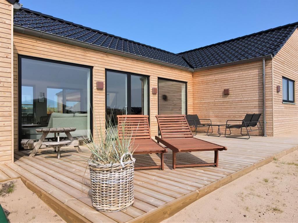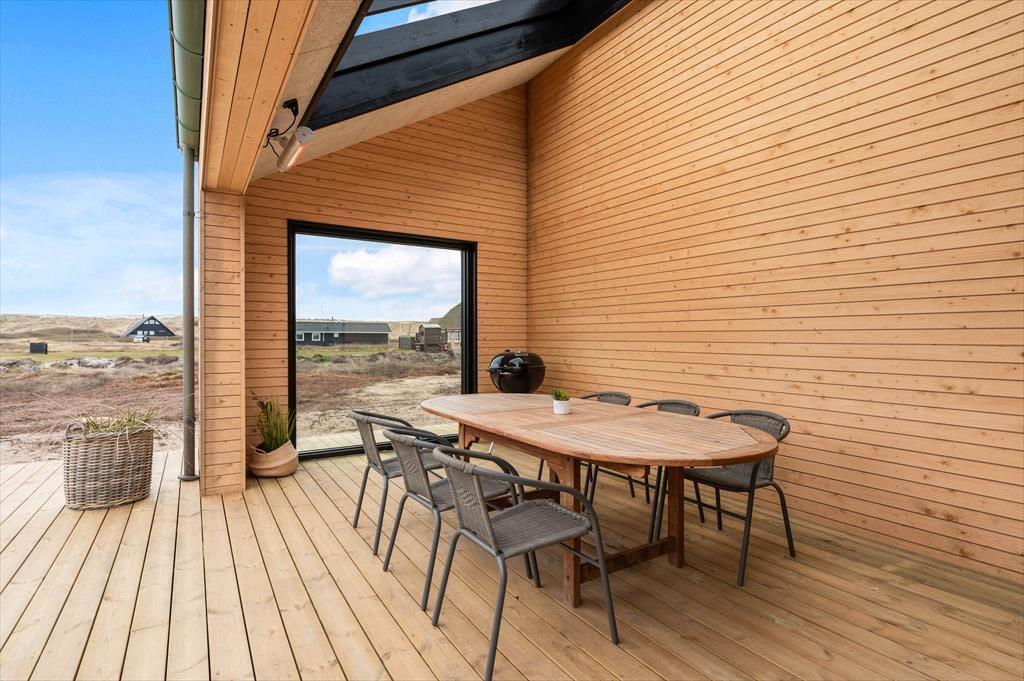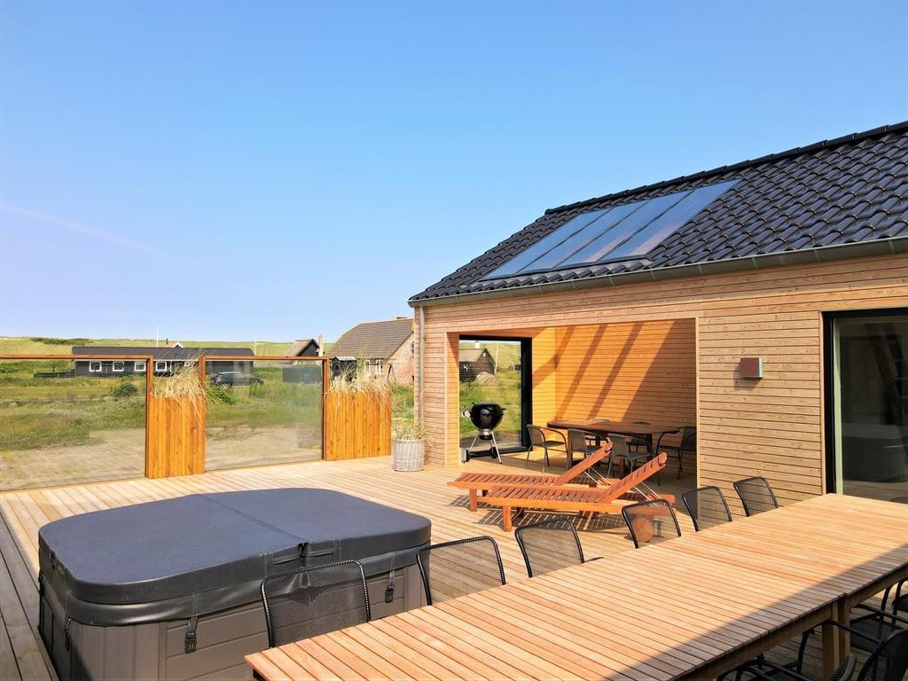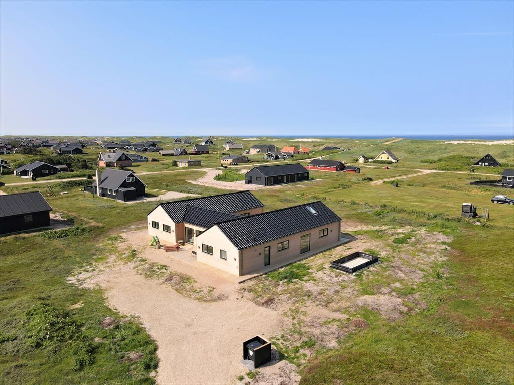 Udenfor kan du glæde dig til et skønt terrassemiljø, hvor rammerne er sat for mange gode feriestunder under åben himmel. Her er god plads til at dække op til fællesspisning, sole sig i liggestolen eller tage en tur i det varme udendørs spabad. Det er en helt særlig oplevelse at sidde i det boblende vand, mens du nyder den friske havluft og udsigten til den blå himmel – eller måske endda en stjerneklar aften. Udebruseren gør det også nemt at skylle sand og salt af kroppen efter en tur i Vesterhavet. Haven har gode, grønne arealer, hvor børnene kan lege og hunden kan boltre sig – og hele området omkring Alkajavej emmer af fred og feriestemning. Her får du virkelig mulighed for at finde ro og nyde livet i dit eget tempo.
