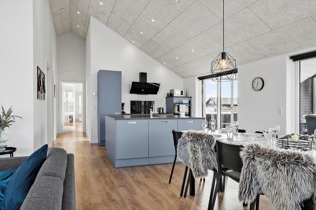 Når du træder indenfor i sommerhuset på Alkajavej 11, møder du et lyst og moderne interiør, hvor der samtidig er kræset for hyggen. Store vinduespartier lader lyset strømme ind og skaber en åben og luftig stemning, og de rolige, lyse farver understøtter følelsen af ro og afslapning. Huset er perfekt til en ferie med både familie og venner – der er god plads til samvær i opholdsrummet, som samler stue og køkken i ét, så det bliver naturligt at være sammen, uanset om nogen laver mad, spiller spil eller hygger med kaffe i sofaen. Efter en lang dag med strandture og aktiviteter kan I forkæle jer selv med en tur i det varme spabad – eller hoppe i husets sauna og mærke varmen brede sig i kroppen. De mange detaljer i indretningen – både praktiske og luksuriøse – gør det let at falde til og føle sig hjemme, allerede fra første øjeblik.