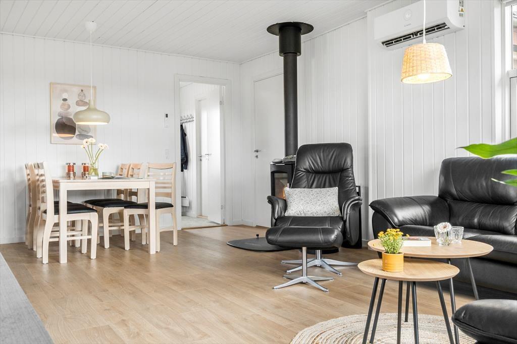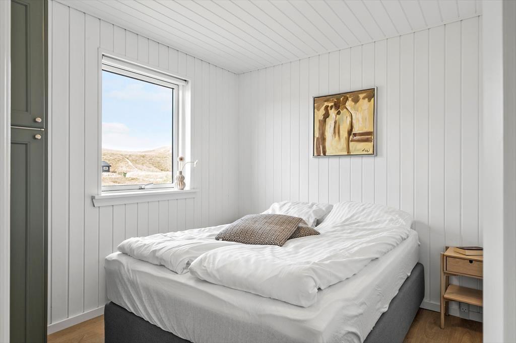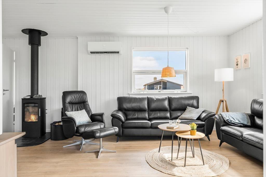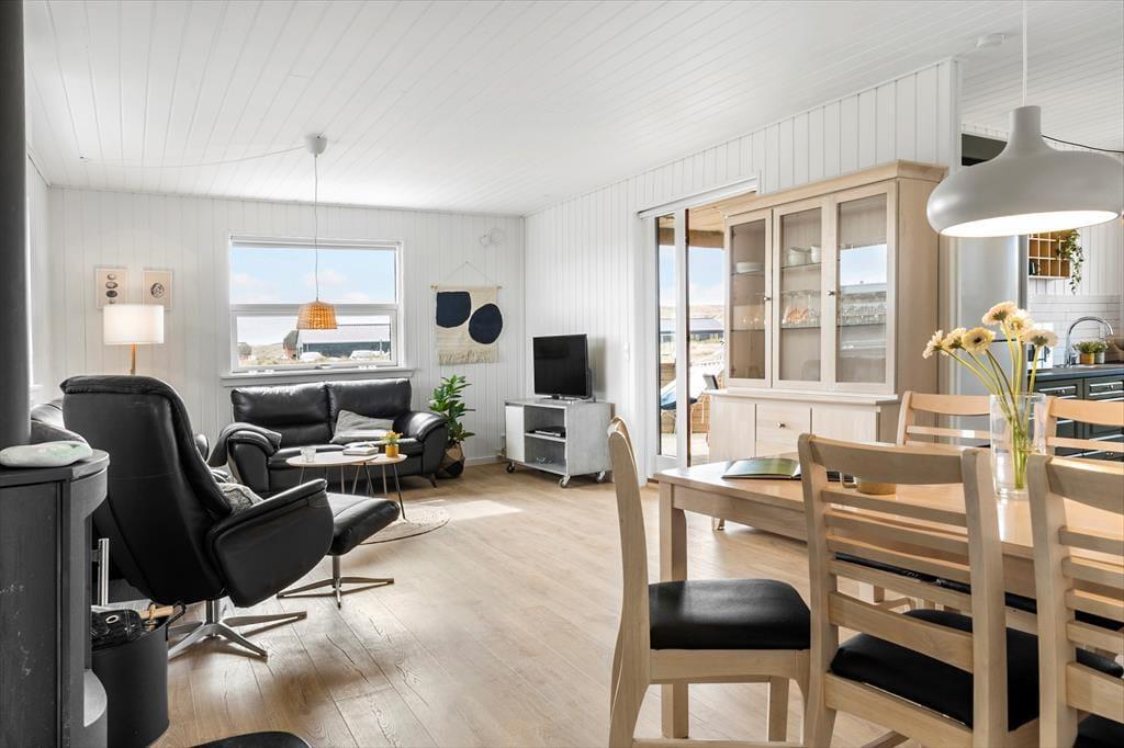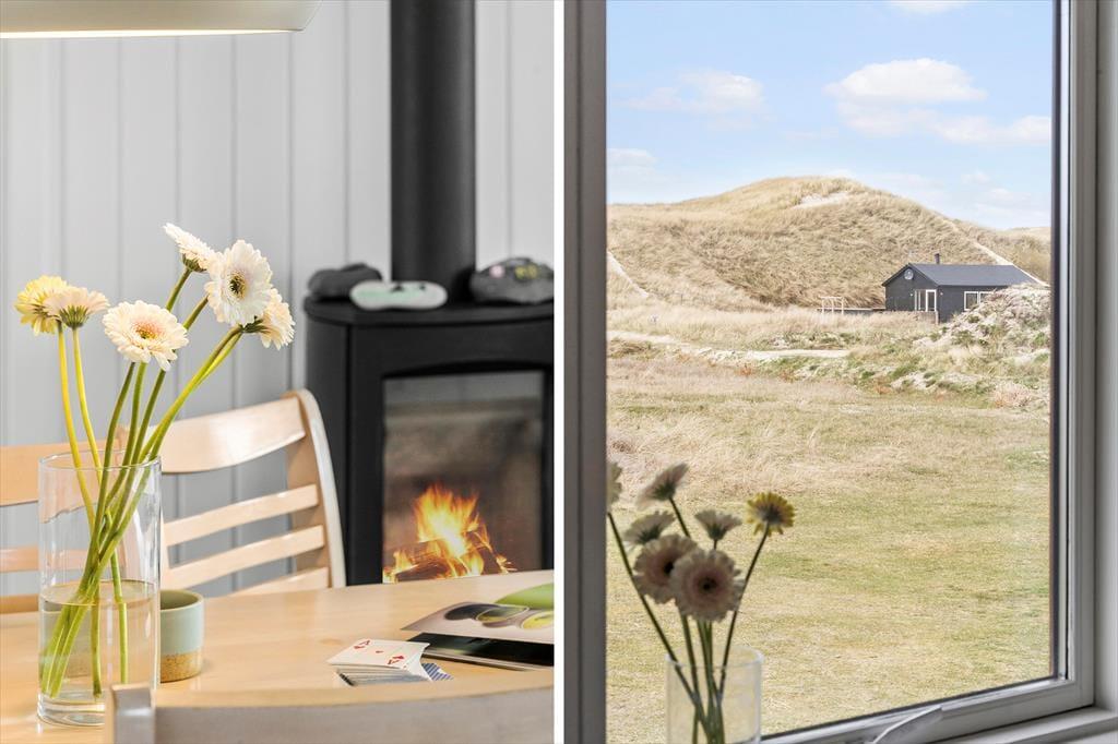 Det første, du mærker, når du træder ind, er husets varme og indbydende atmosfære. Indretningen er lys og enkel med sans for detaljerne, og i stuen skaber brændeovnen en særlig hygge – især på de køligere dage, hvor flammernes knitren bliver en del af stemningen. Stue og køkken ligger i åben forbindelse, så alle kan være med, når ferien står på kortspil, madlavning og lange snakke ved spisebordet. De store vinduespartier inviterer lyset ind og giver udsigt til det karakteristiske landskab, og huset rummer god plads til afslapning – både samlet og hver for sig. Her er rart at være, og alt er gjort klar til ferien.