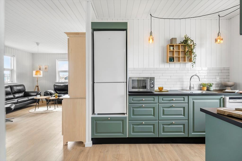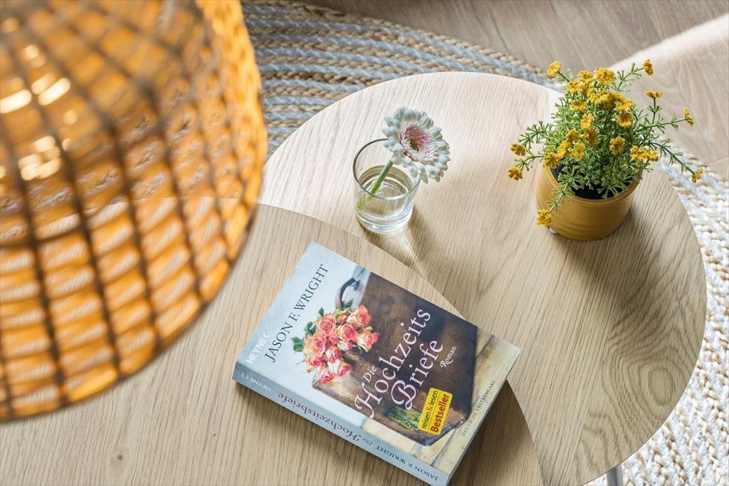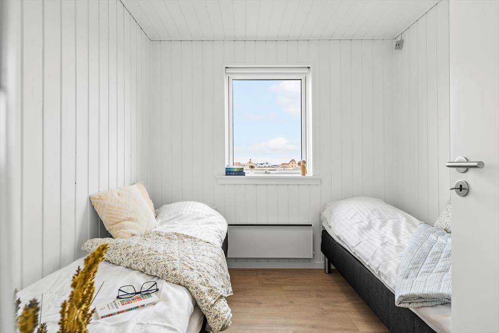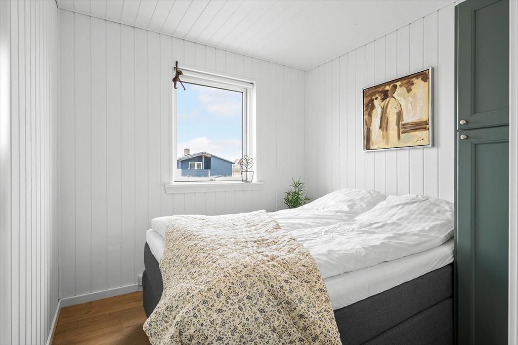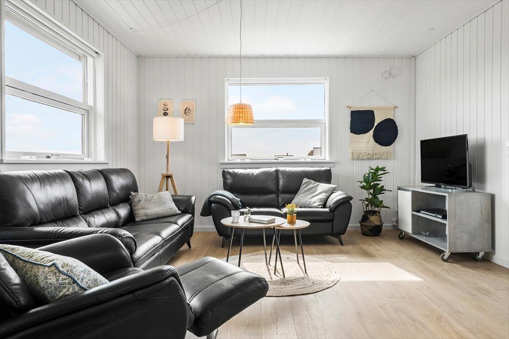 Det første, du mærker, når du træder ind, er husets varme og indbydende atmosfære. Indretningen er lys og enkel med sans for detaljerne, og i stuen skaber brændeovnen en særlig hygge – især på de køligere dage, hvor flammernes knitren bliver en del af stemningen. Stue og køkken ligger i åben forbindelse, så alle kan være med, når ferien står på kortspil, madlavning og lange snakke ved spisebordet. De store vinduespartier inviterer lyset ind og giver udsigt til det karakteristiske landskab, og huset rummer god plads til afslapning – både samlet og hver for sig. Her er rart at være, og alt er gjort klar til ferien.