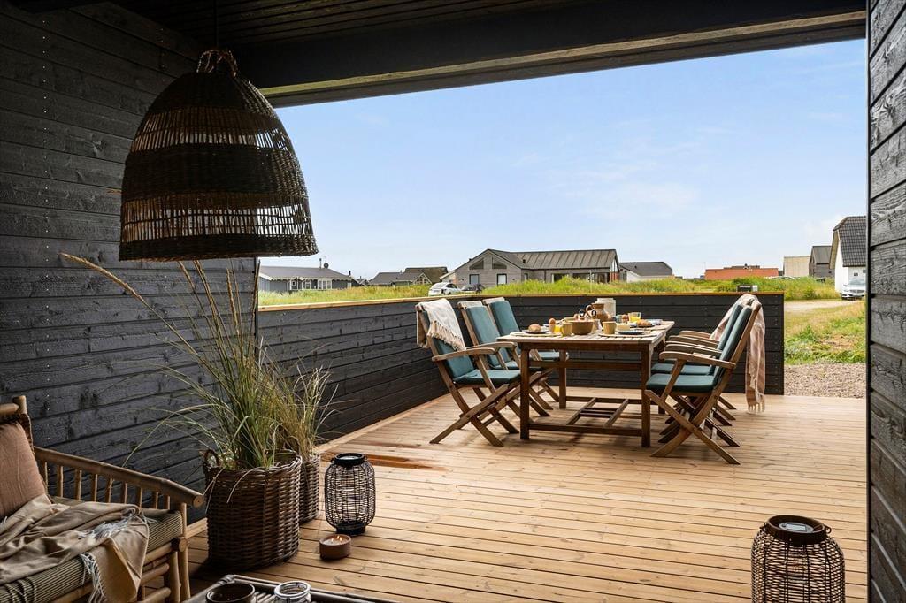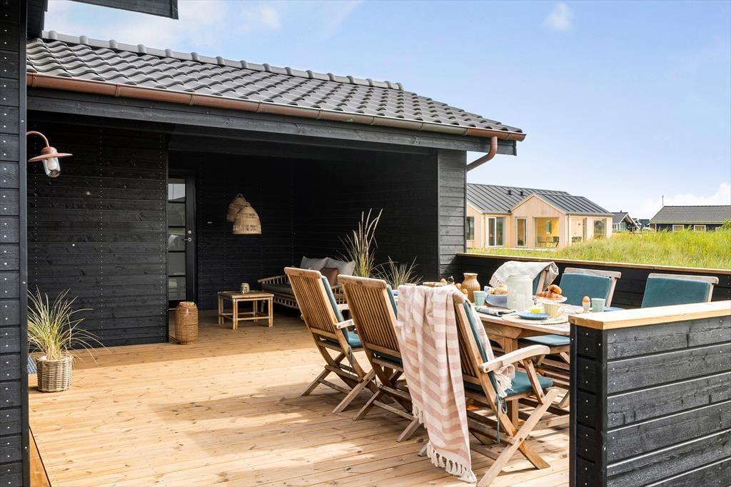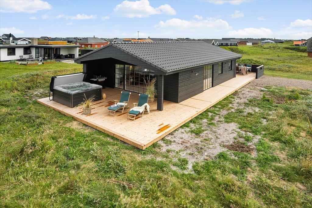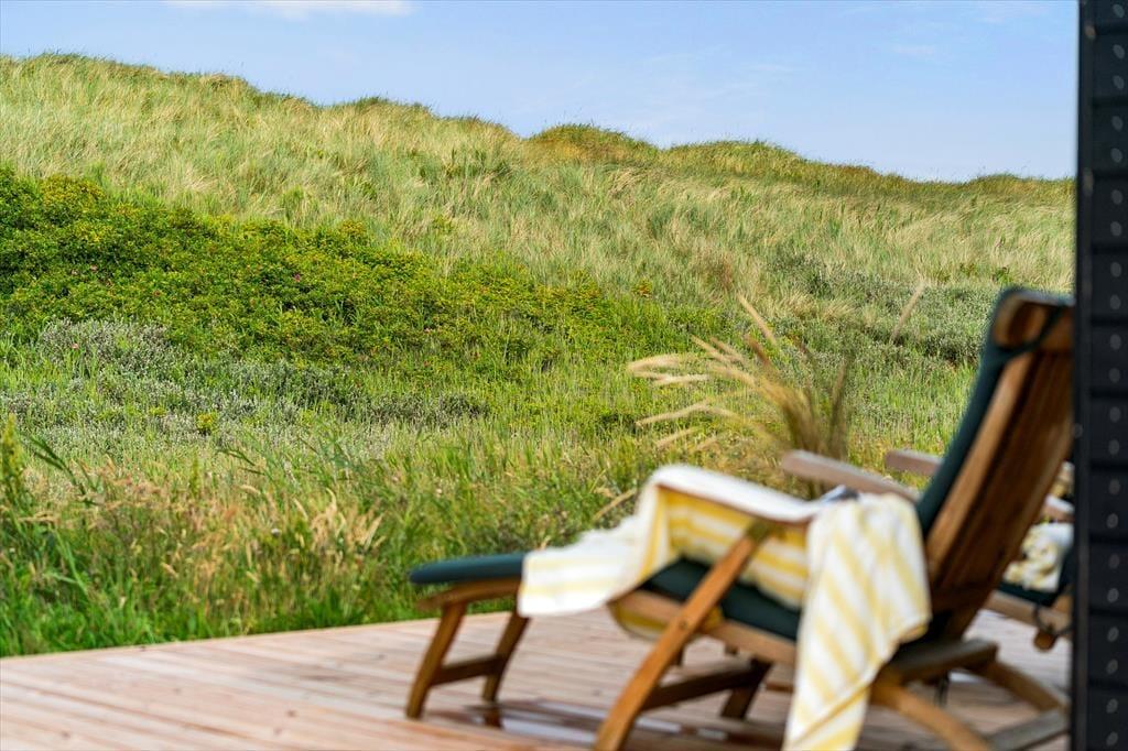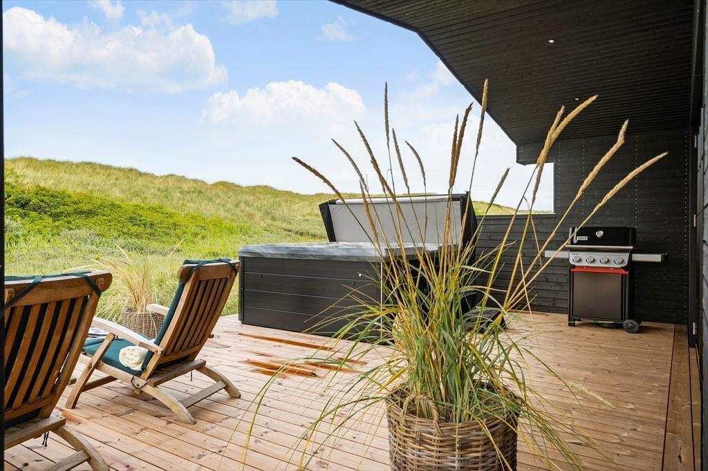 Sommerhuset er designet til at maksimere udelivet, og den store træterrasse mod syd er det perfekte sted til at nyde solen hele dagen. Der er også en overdækket terrasse, hvor du kan slappe af, selv når vejret er mere ustadigt. Når du ønsker at forkæle dig selv, kan du tage et afslappende bad i udespaen, der er placeret med udsigt over de imponerende klitter. Denne private oase giver dig mulighed for at nyde både solnedgange og stjernehimmelen i absolut ro og fred. Haven er omhyggeligt anlagt og giver både børn og voksne mulighed for at nyde det smukke naturområde omkring sommerhuset.