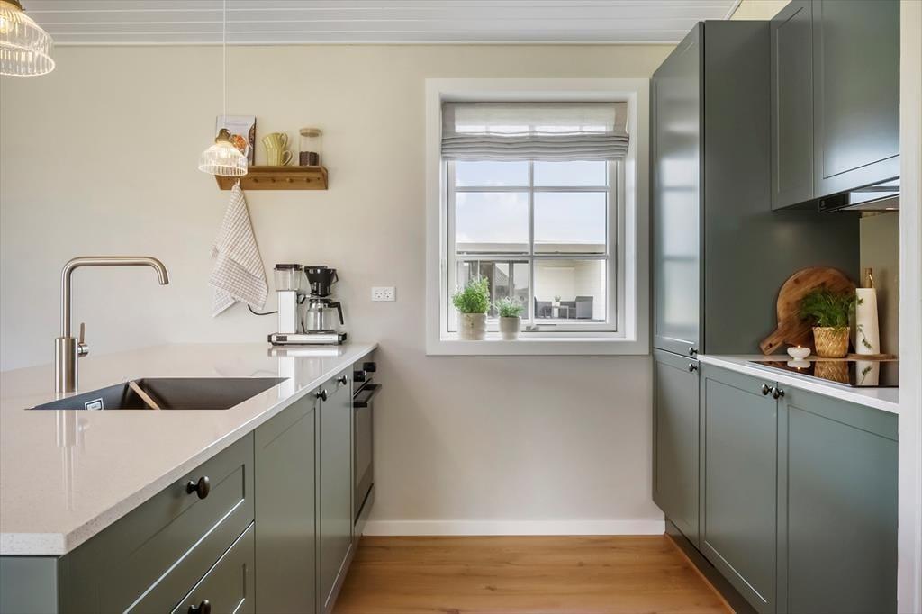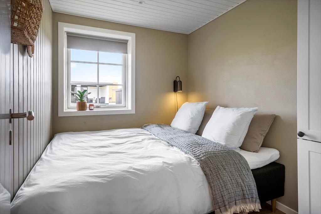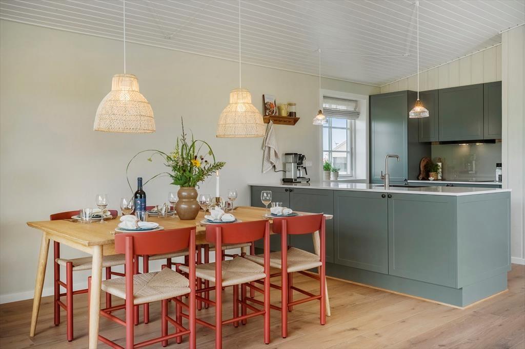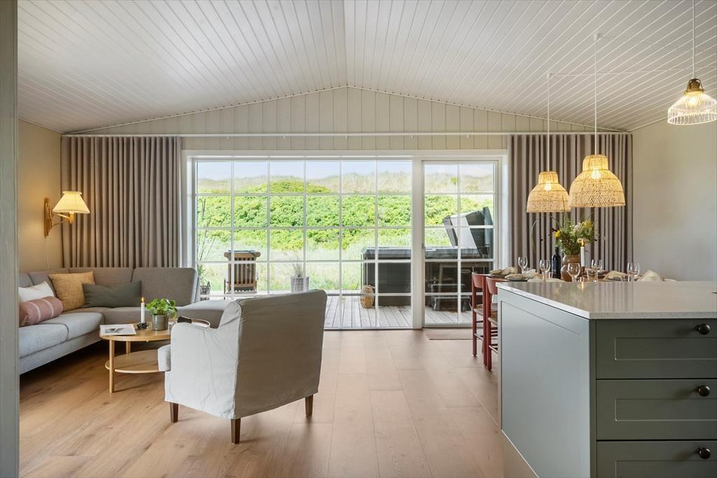 Indenfor mødes du af et lyst og moderne hjem med en åben planløsning, hvor stuen og køkkenet er i perfekt harmoni. De flotte vinduer trækker naturligt lyset ind og giver et fantastisk udsyn til klitterne. Køkkenet er nyrenoveret og indrettet med stilrene materialer, og det er fuldt udstyret til at lave lækre feriemåltider. Fra stuen er der direkte adgang til den sydvendte træterrasse, som indbyder til solbadning og afslapning. Huset har tre soveværelser, som sikrer komfort til op til seks personer, og det renoverede badeværelse er et kapitel for sig med en dobbelt bruser, hvor du kan starte dagen med et luksuriøst bad. Med den opgraderede indretning og moderne design vil du føle dig helt hjemme under dit ophold.
