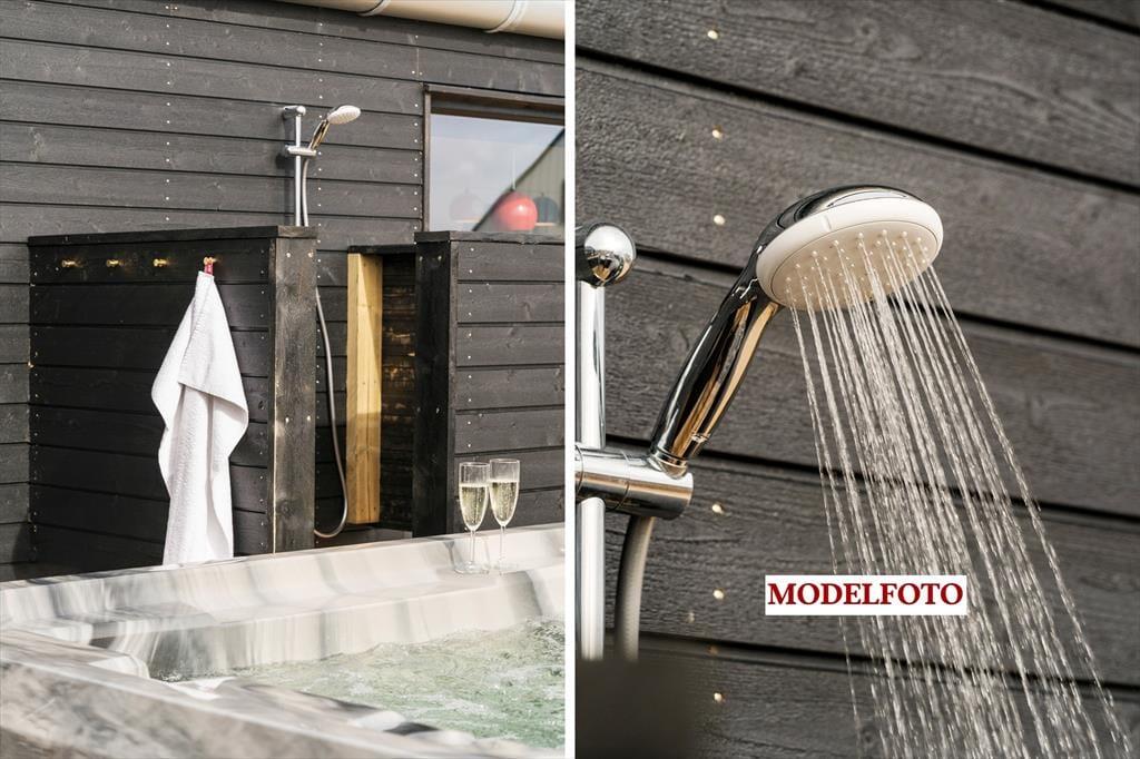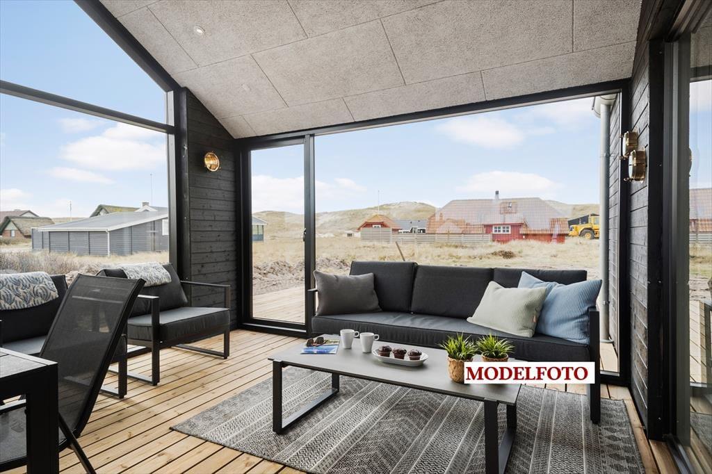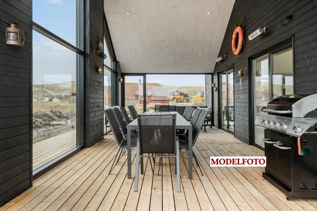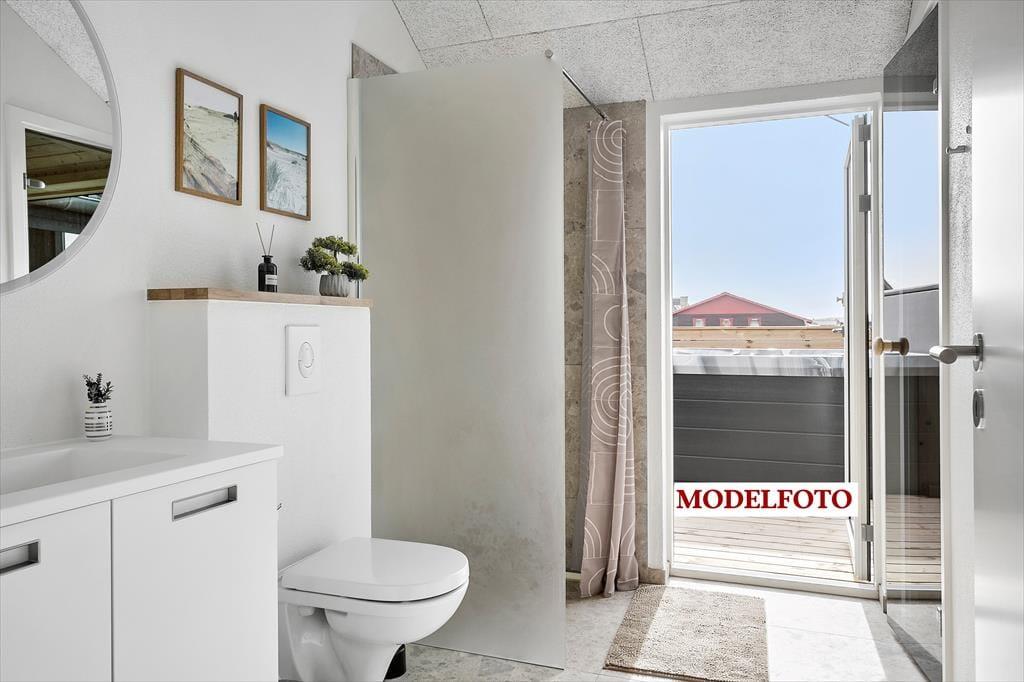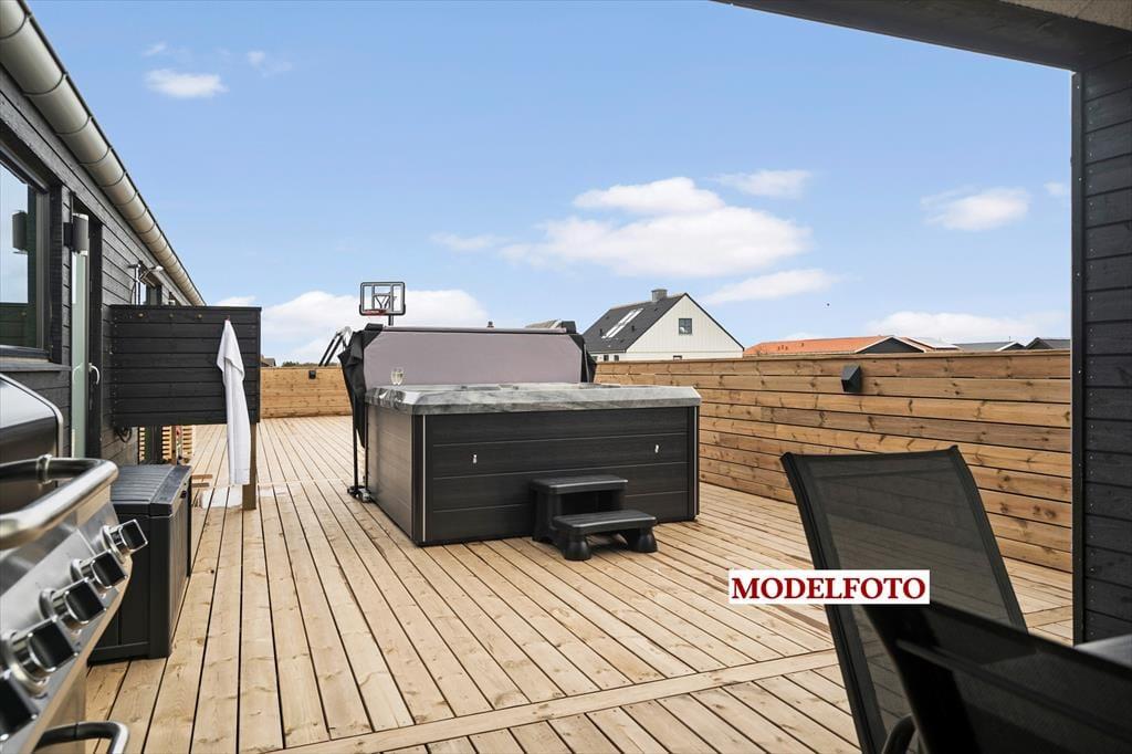 Udenfor breder en stor, lukket træterrasse sig næsten hele vejen rundt om huset, hvilket gør det nemt at finde sol, læ eller en hyggelig krog til eftermiddagskaffen. Her kan hundene trygt løbe omkring, mens du læner dig tilbage i havemøblerne og nyder ferielivet i fredelige omgivelser. Som prikken over i’et byder kvalitetssommerhuset på et lækkert udespa, som giver en luksuriøs ramme om udelivet – perfekt til en afslappende stund under stjernehimlen. Efter en tur i havet, der blot ligger 350 meter væk, er det skønt at skylle sandet af sig under den udendørs bruser, inden grillen tændes til aftensmaden.