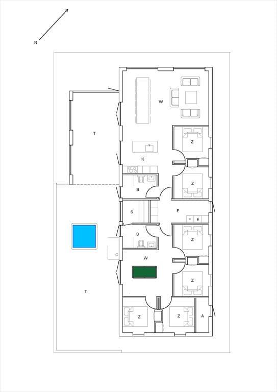 Indretningen er lys, stilfuld og gennemtænkt, præcis som man forventer af et kvalitetssommerhus ved havet. Her kan du samle hele familien eller tage af sted med gode venner, for huset er oplagt til en ferie, hvor mange kan være sammen. Køkken og stue er forbundet i en stor, indbydende opholdsafdeling, hvor samtaler og fælles måltider falder naturligt. Når der er brug for lidt ekstra aktivitet, venter husets aktivitetsrum, hvor både børn og voksne kan dyste i spil og få timerne til at flyve afsted. Efter en lang dag ved stranden kan I glæde jer til afslapning i saunaen, der giver ekstra velvære på de kølige dage.