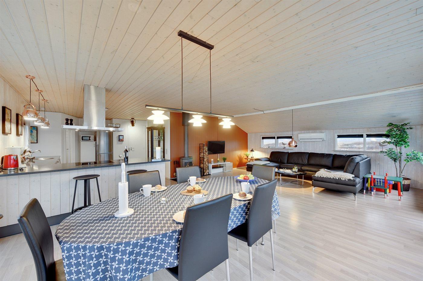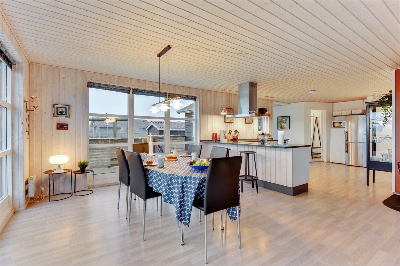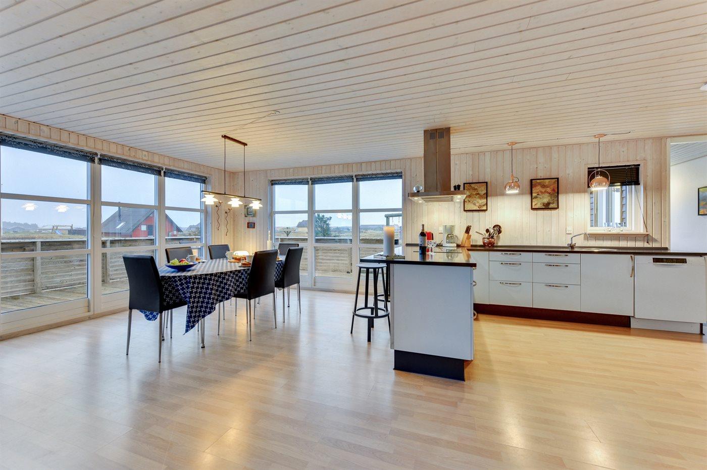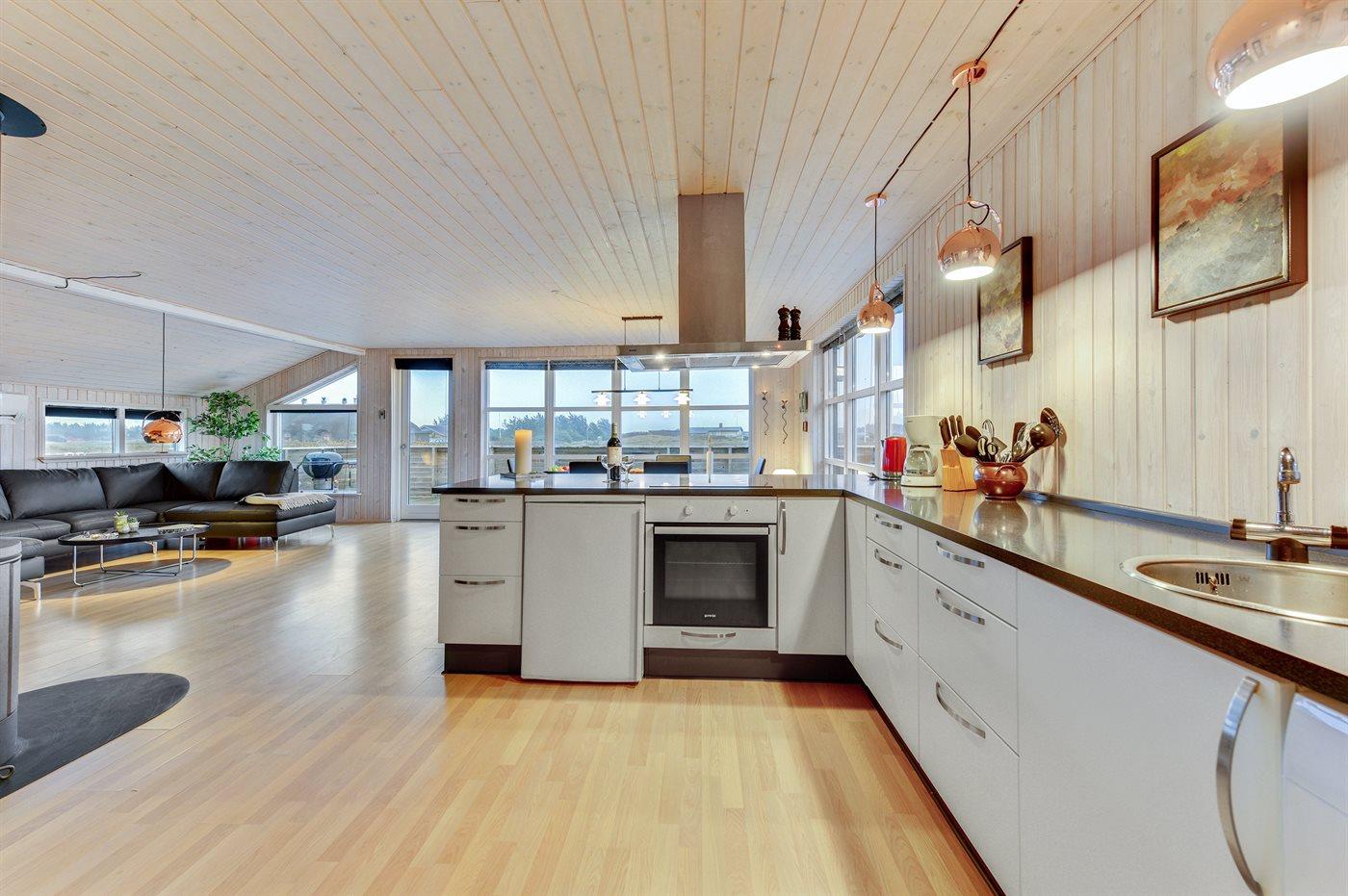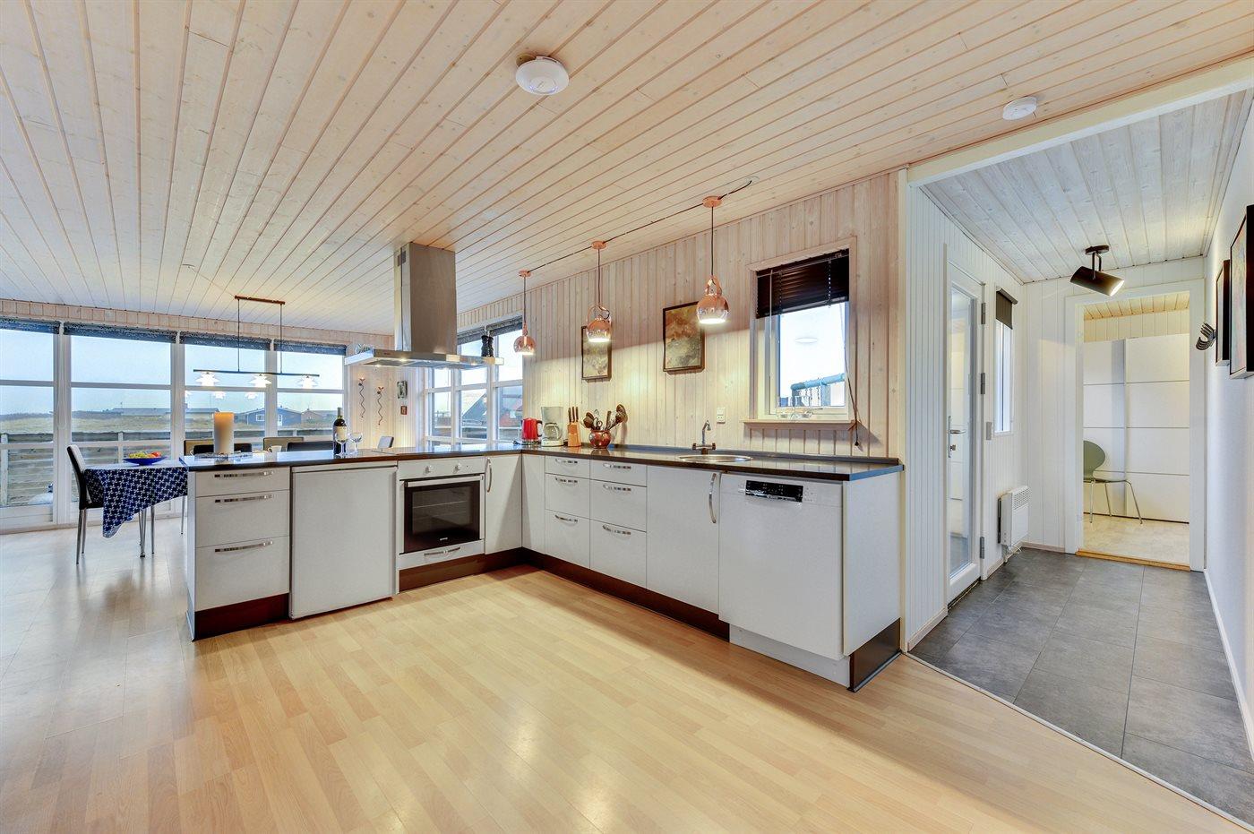 Køkkenet er udstyret med 1 køleskab. Der er 4 induktionskogeplader, bageovn, mikrobølgeovn samt opvaskemaskine.