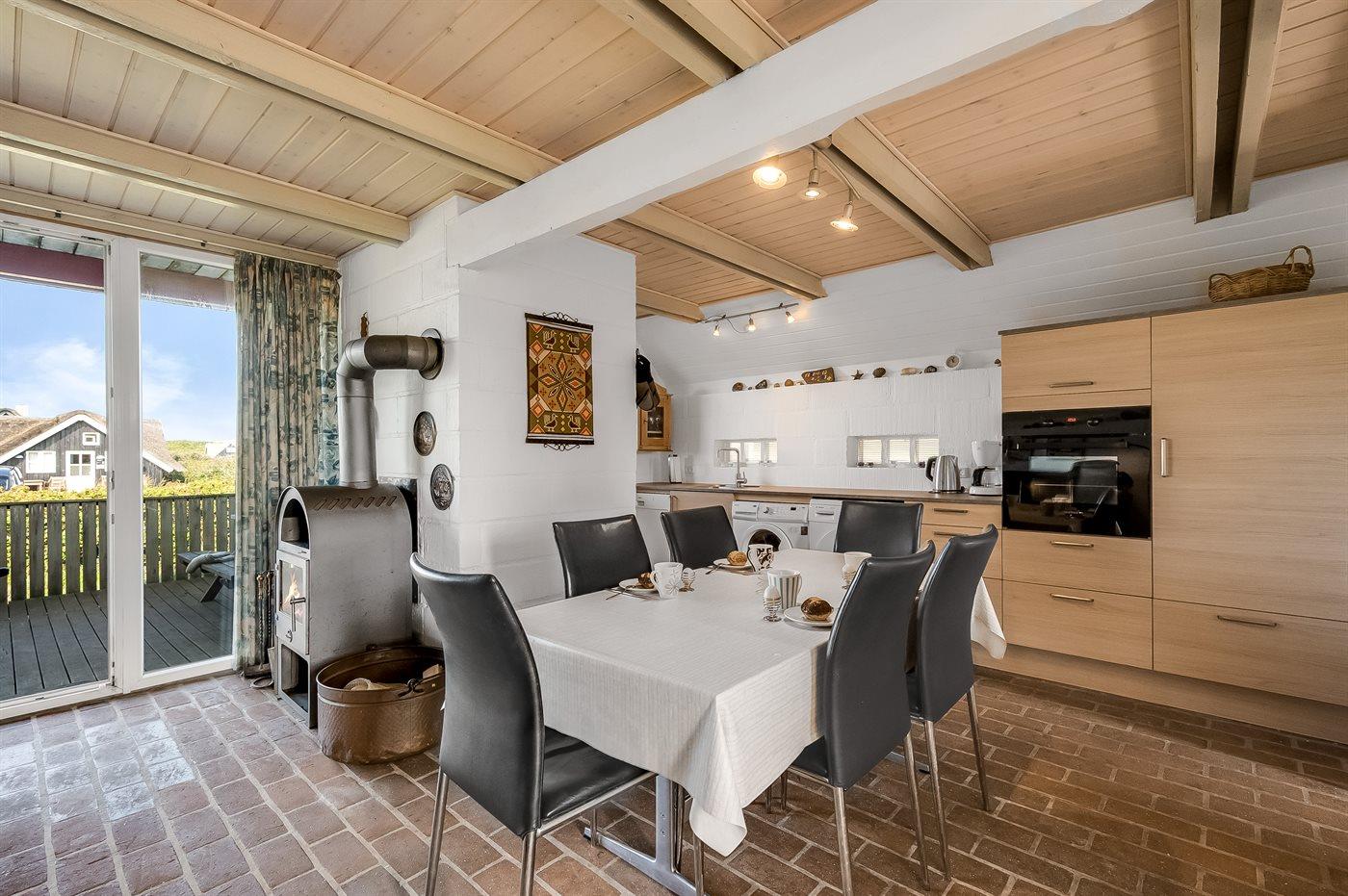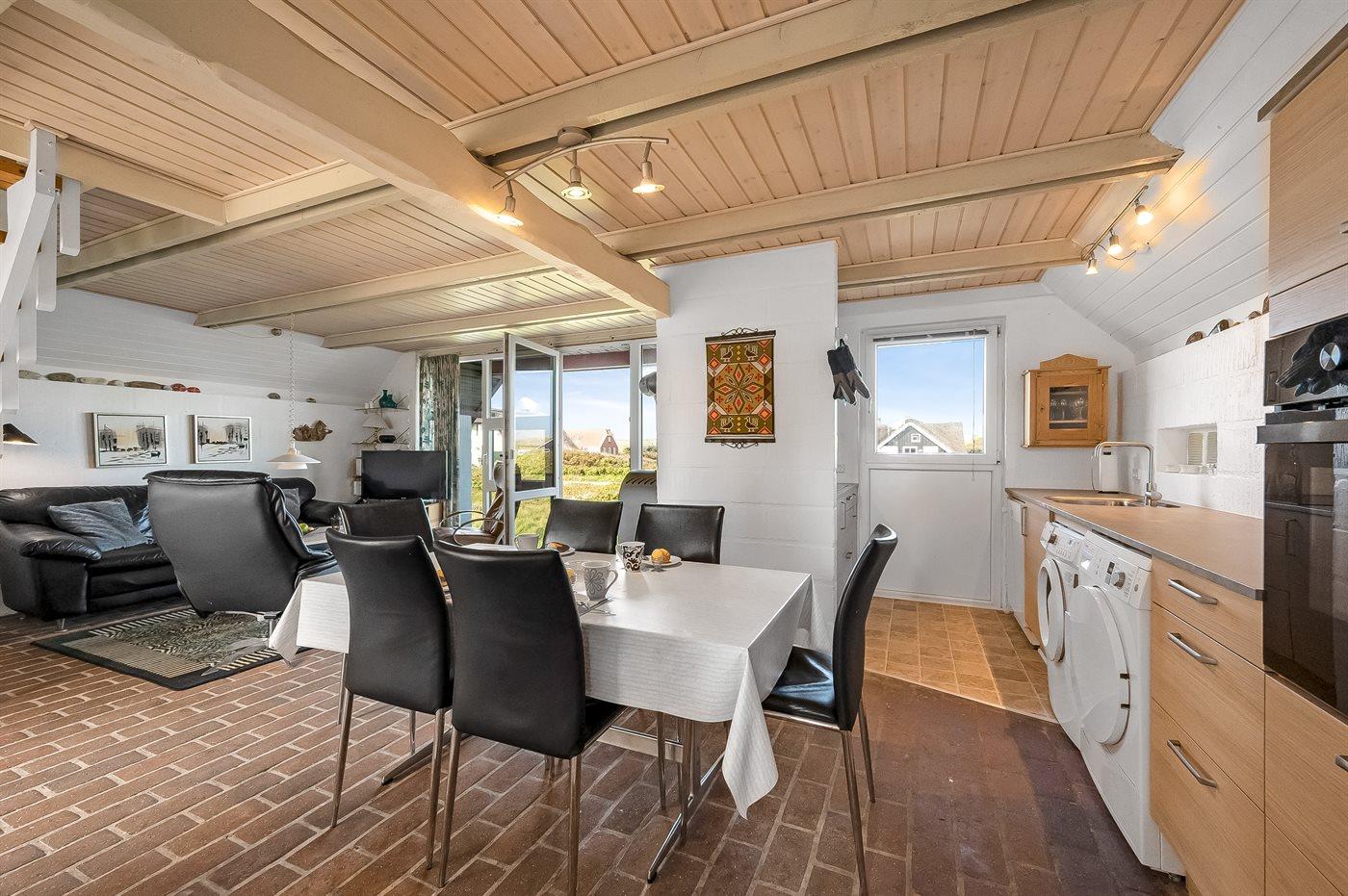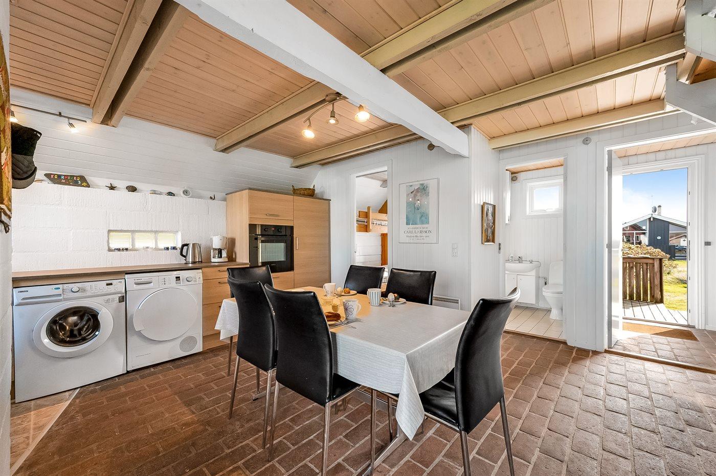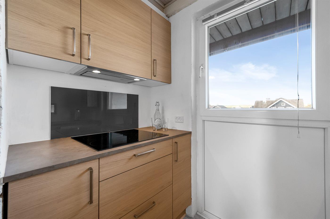 Køkkenet er udstyret med 1 køleskab. Der er 4 keramiske kogeplader, varmluftovn, mikrobølgeovn samt opvaskemaskine.