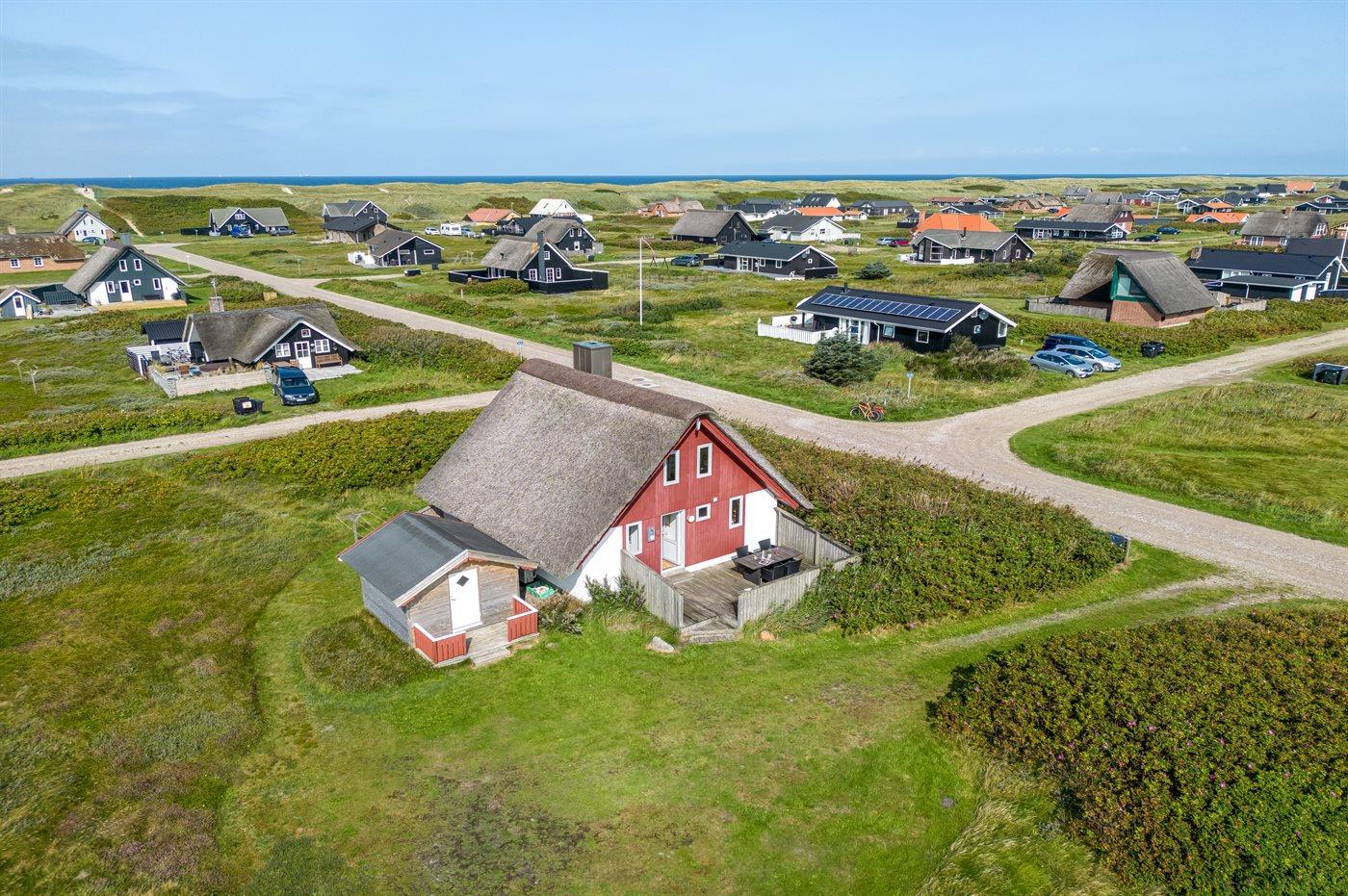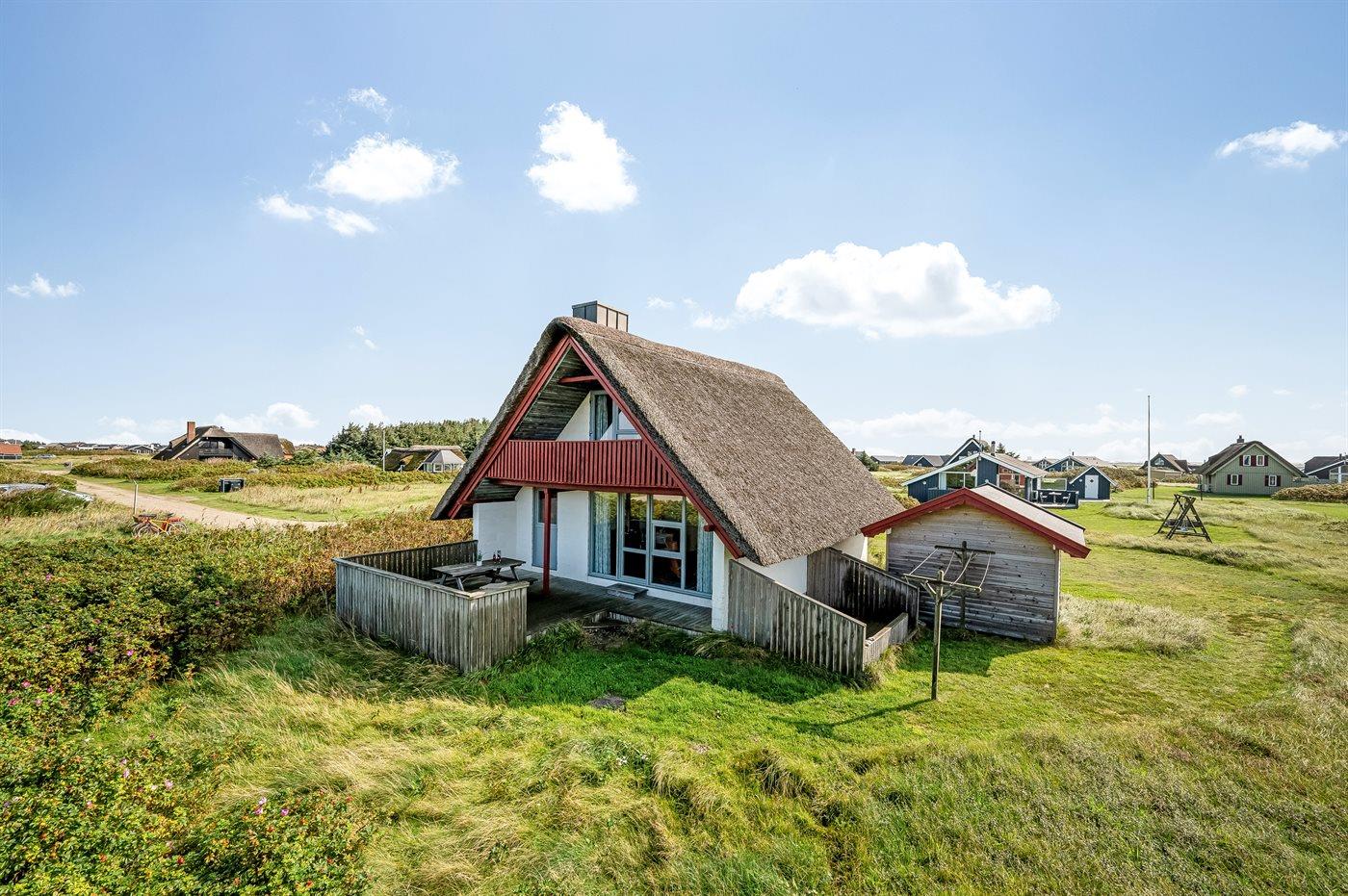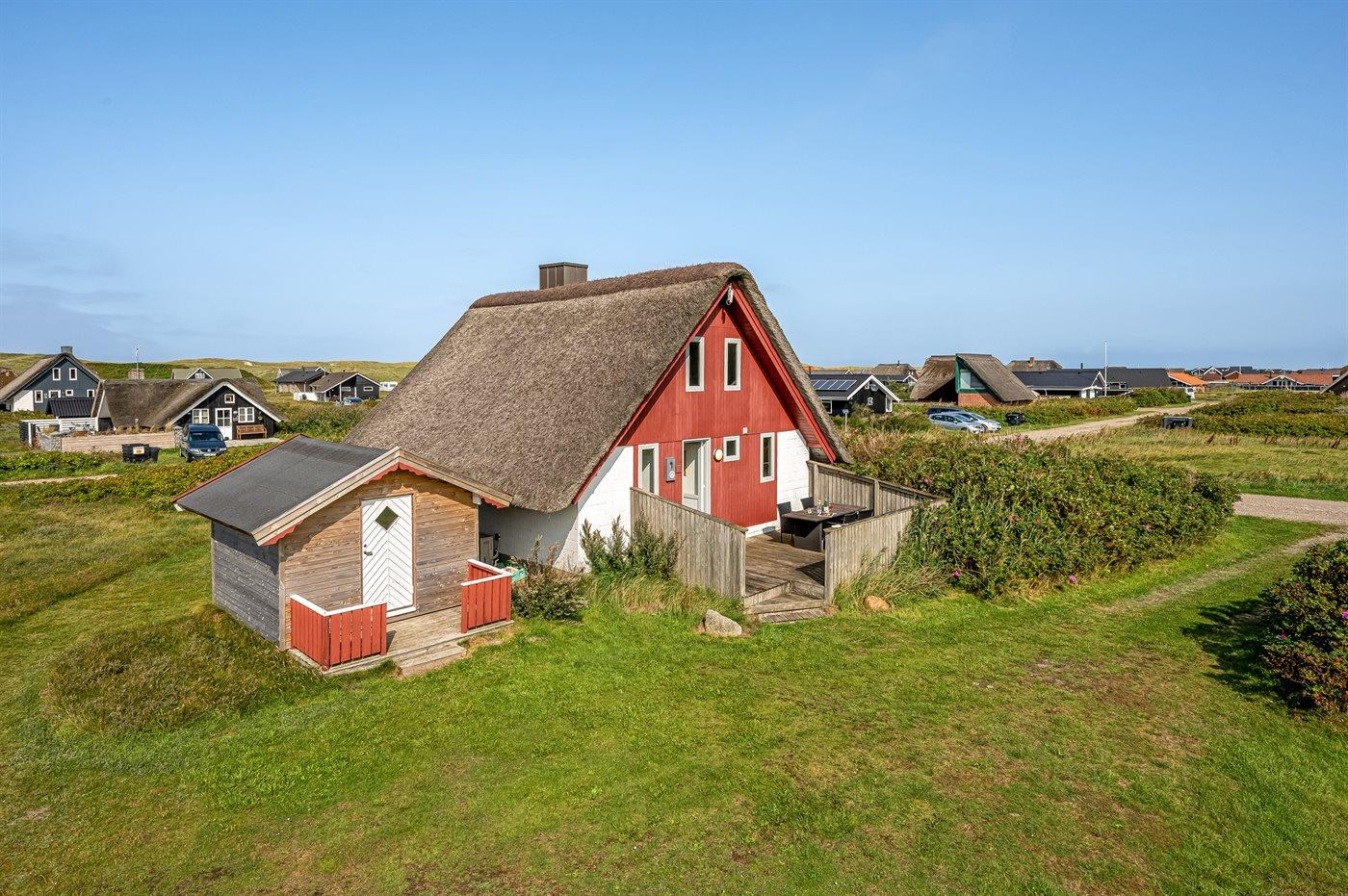 Charmerende sommerhus med stråtag tæt på havet og natur, perfekt til en afslappende ferie.