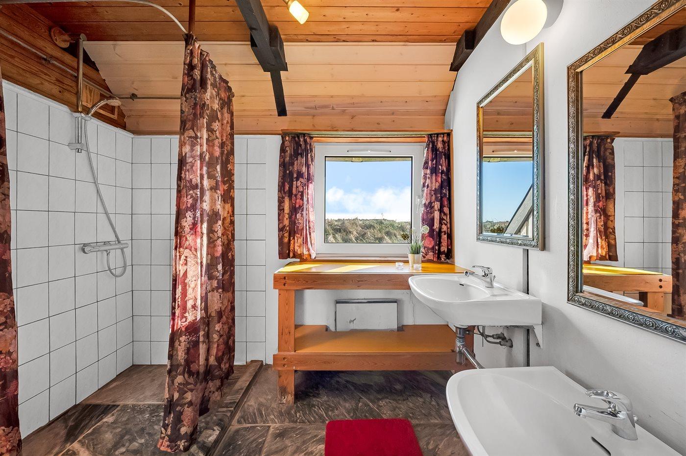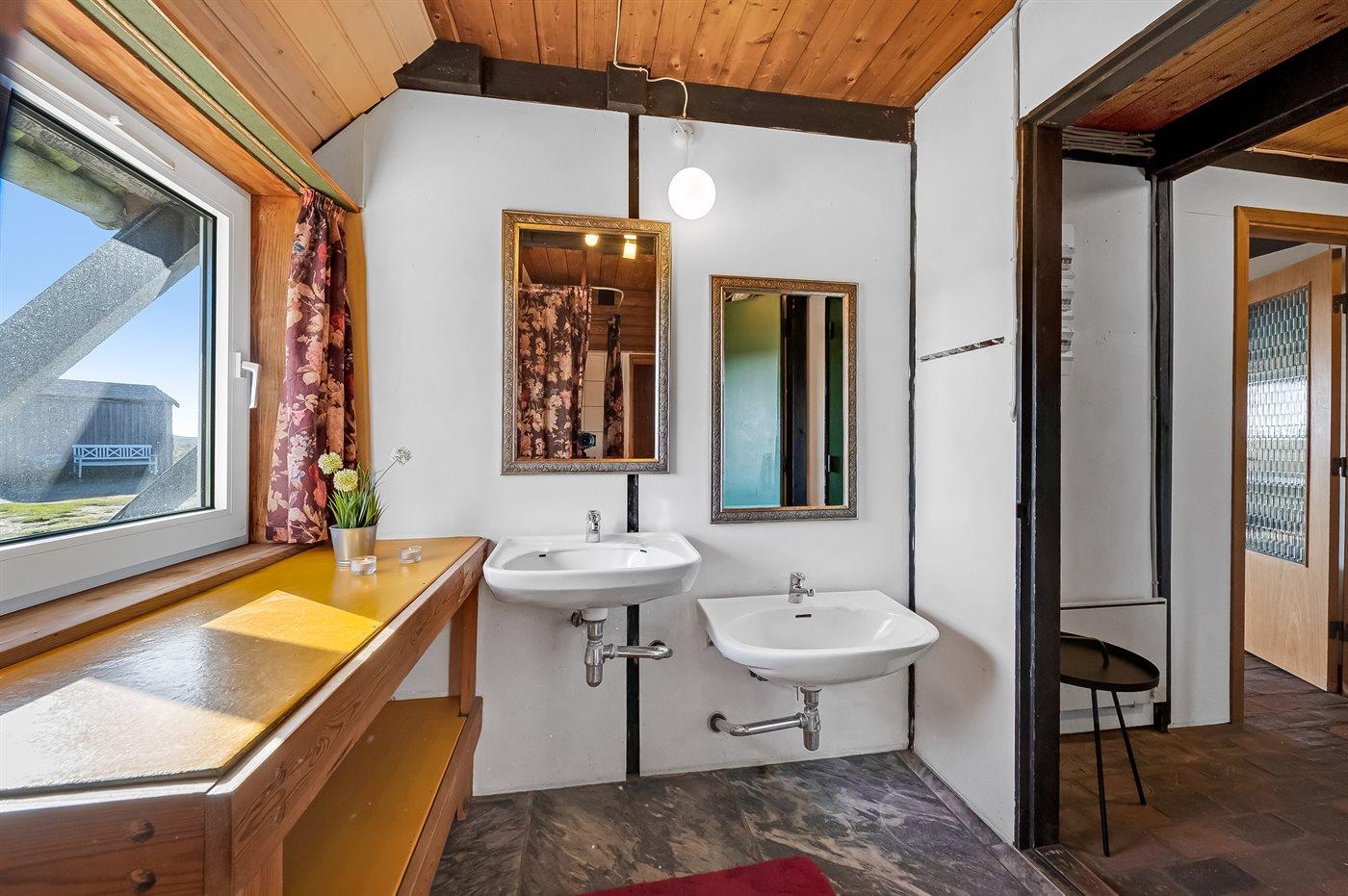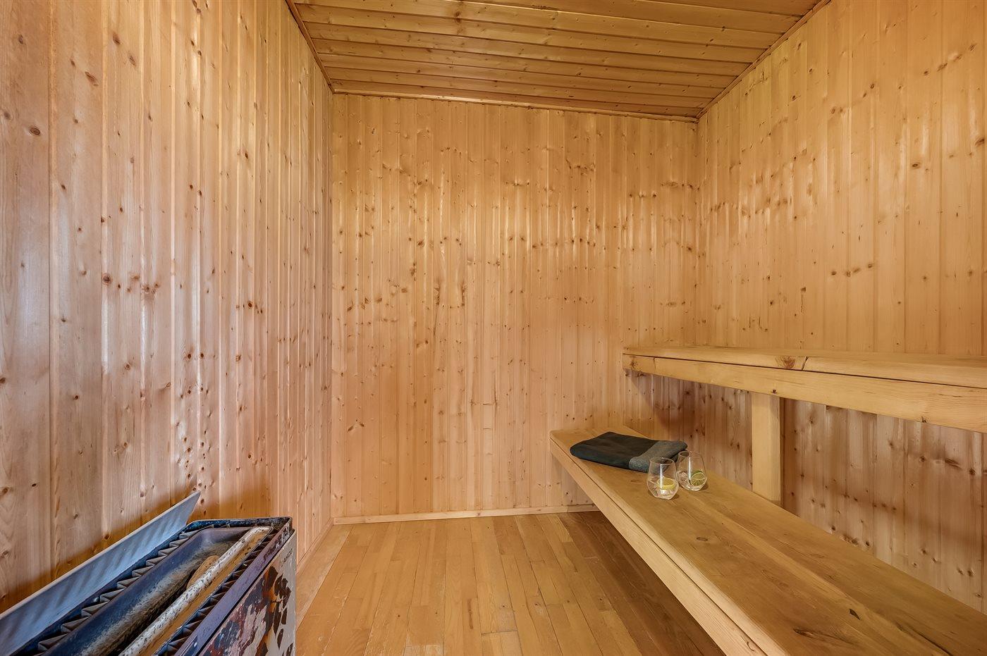 Der er 2 badeværelser med bruseniche og 3 toiletter, heraf 2 gæstetoiletter. Der er gulvvarme på 1 badeværelse.. Badekar. I saunaen er der mulighed for afslapning.