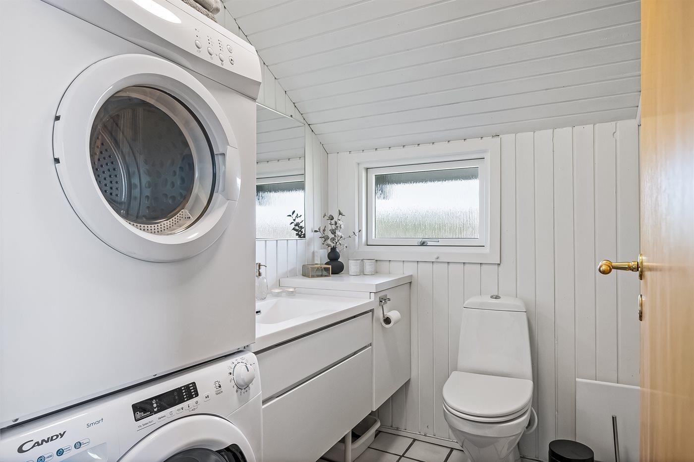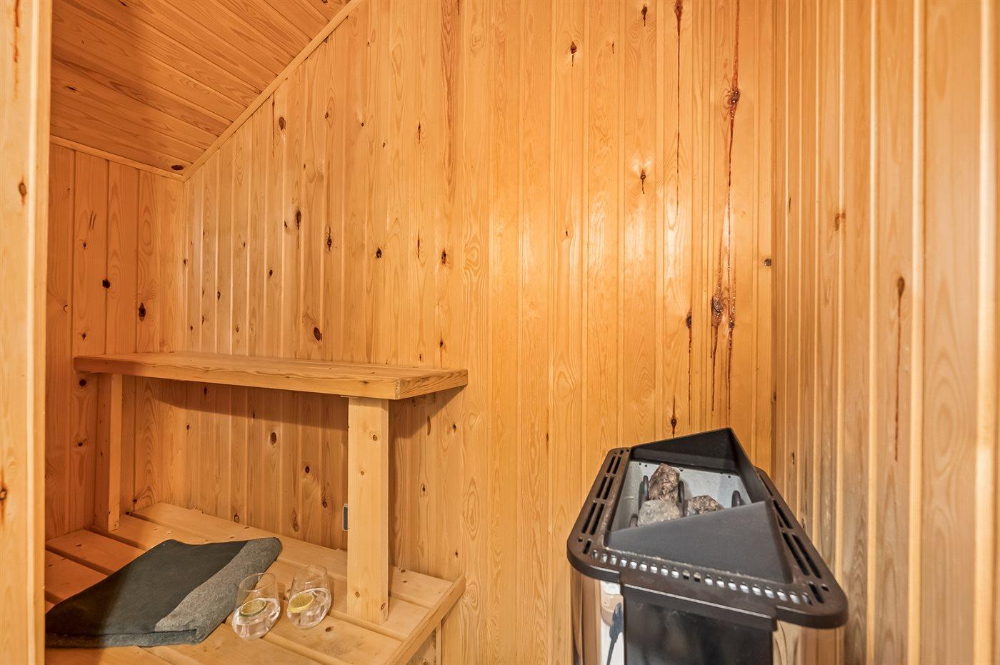 Der er 1 badeværelse med bruseniche og 1 toilet. I saunaen er der mulighed for afslapning.