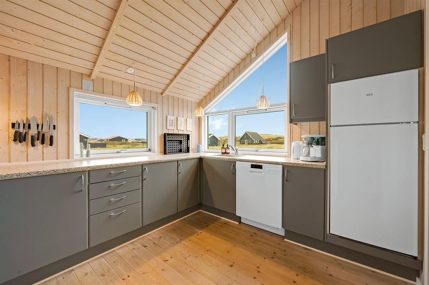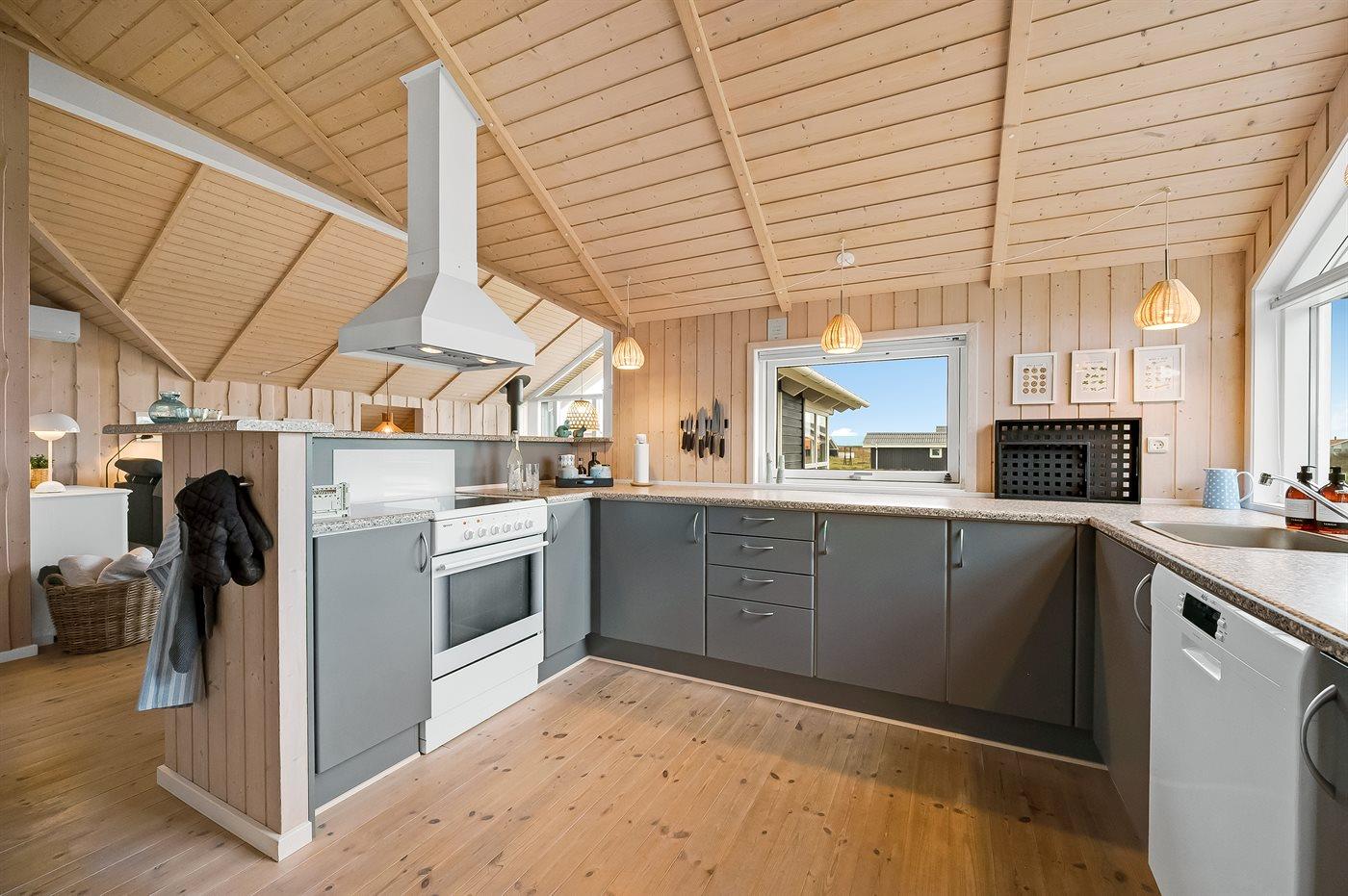 Køkkenet er udstyret med 1 køleskab. Der er 4 keramiske kogeplader, varmluftovn, mikrobølgeovn samt opvaskemaskine.