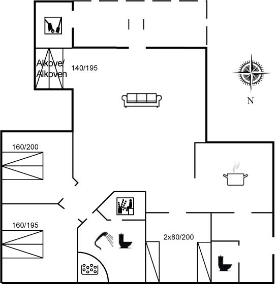 Der er i alt 3 soveværelser. Sovepladserne fordeler sig på: 4 sovepladser i dobbeltsenge. 2 sovepladser i enkeltsenge. 2 sovepladser i alkove. Derudover er der 1 stk. barneseng.