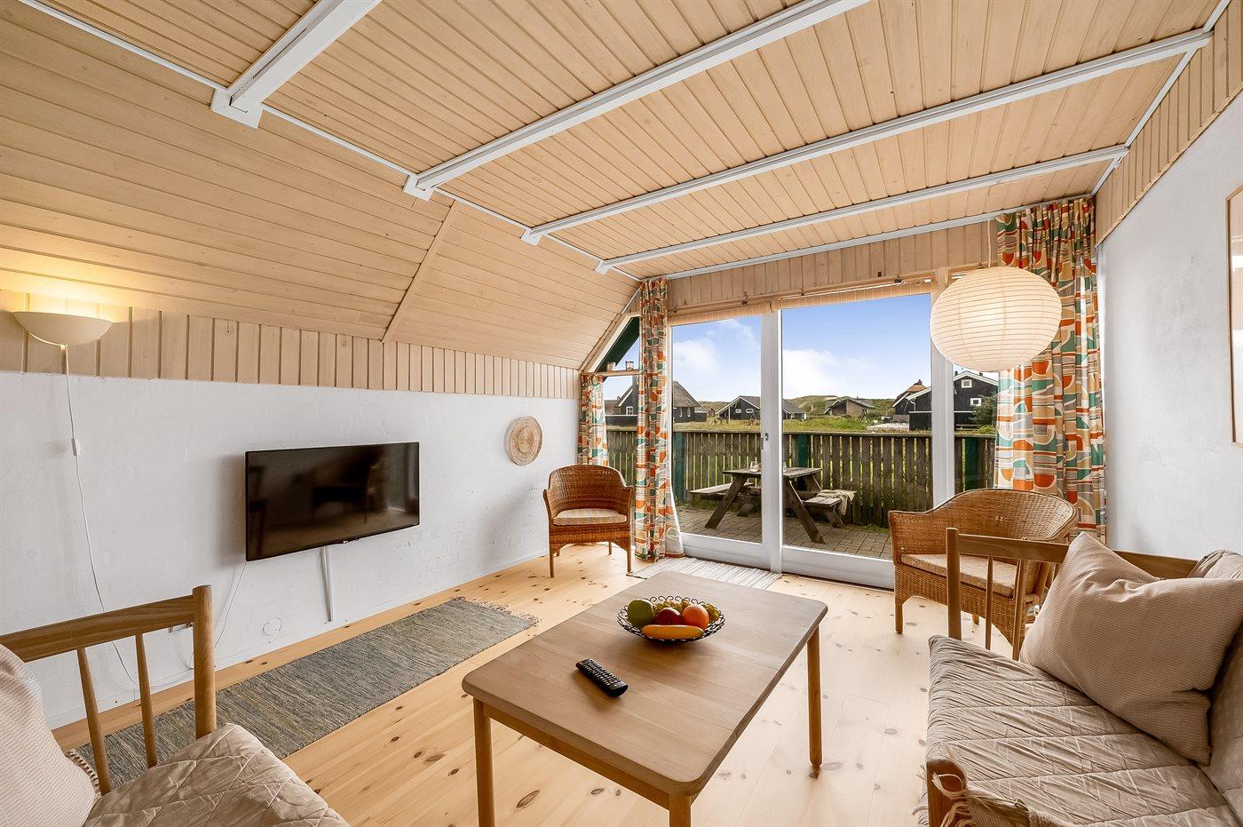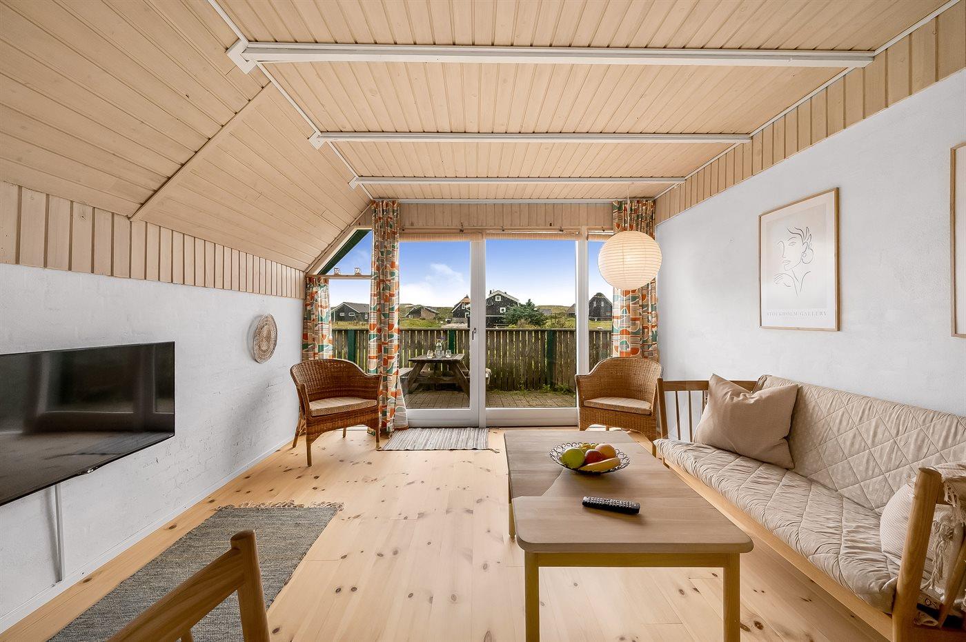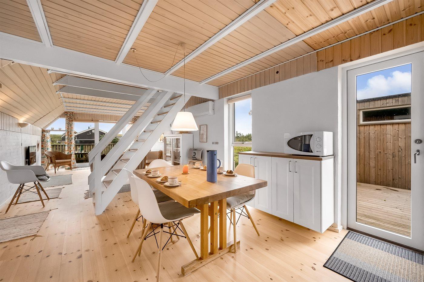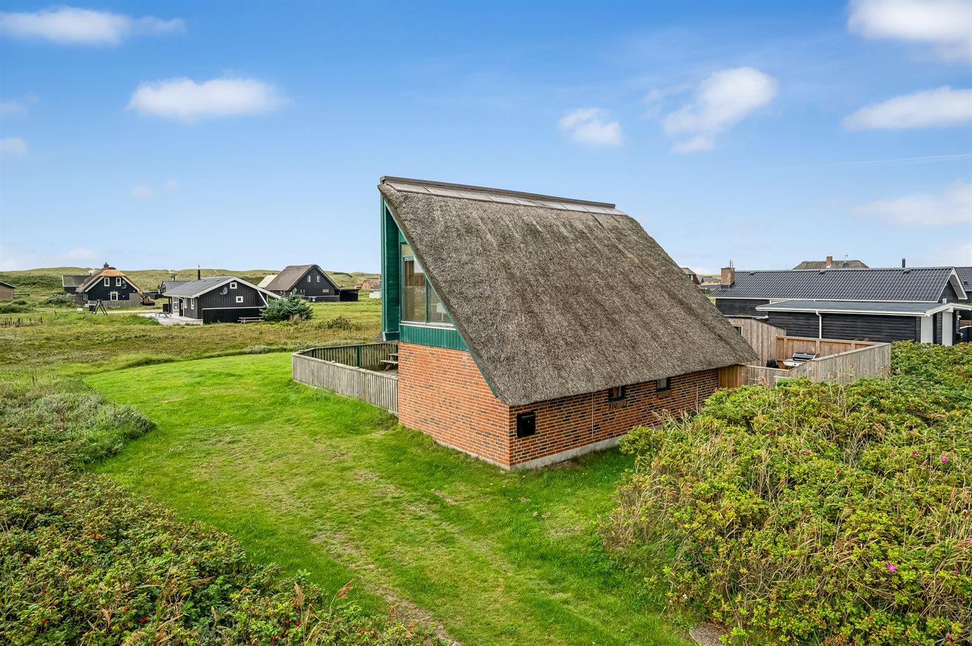 Et virkelig dejligt og hyggeligt sommerhus i 2 etager og med stråtag - attraktivt beliggende kun 200 m fra Vesterhavet på en natur-/klitgrund. Fra husets 1. sal er der god udsigt over landskabet. Et sommerhus med en virkelig spændende indretning - beliggende i et område med gode bade- og fiskemuligheder.