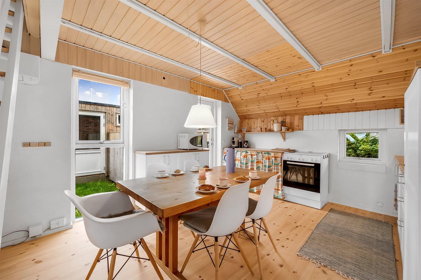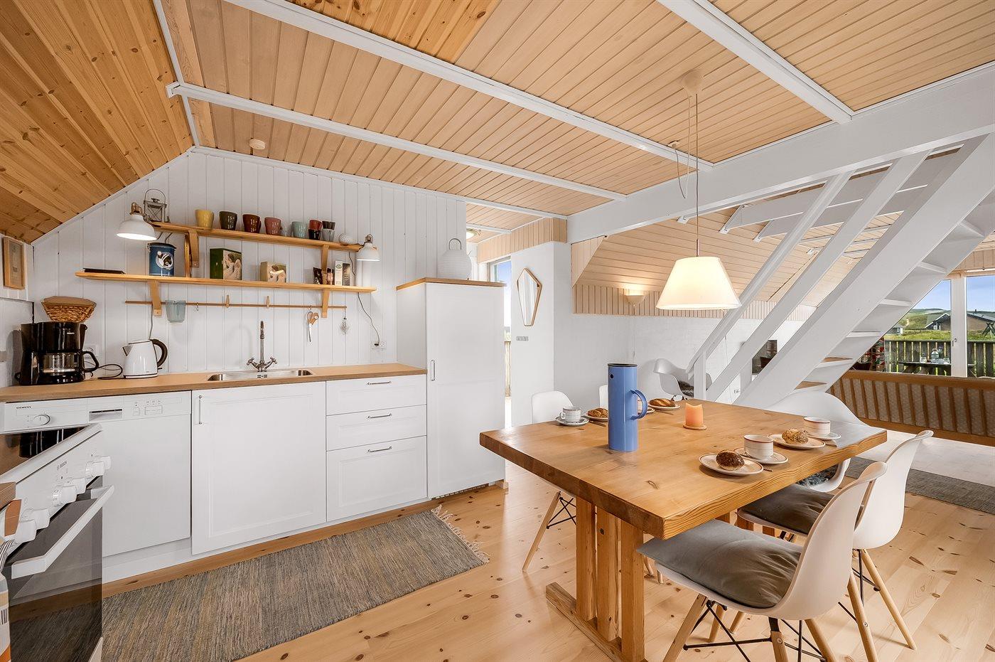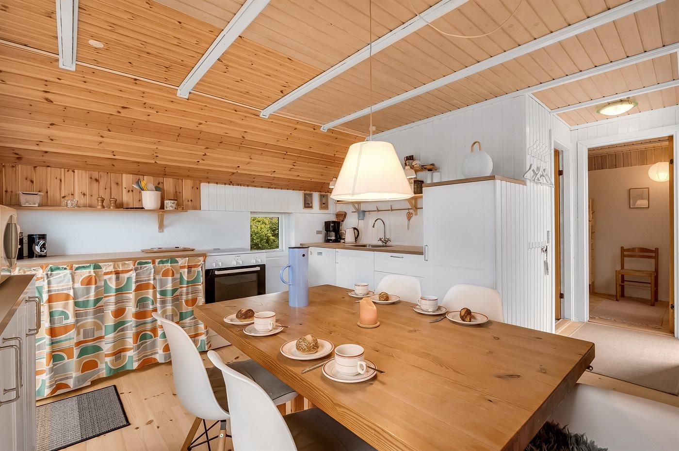 Køkkenet er udstyret med 1 køleskab. Der er 4 keramiske kogeplader, varmluftovn, mikrobølgeovn samt opvaskemaskine.