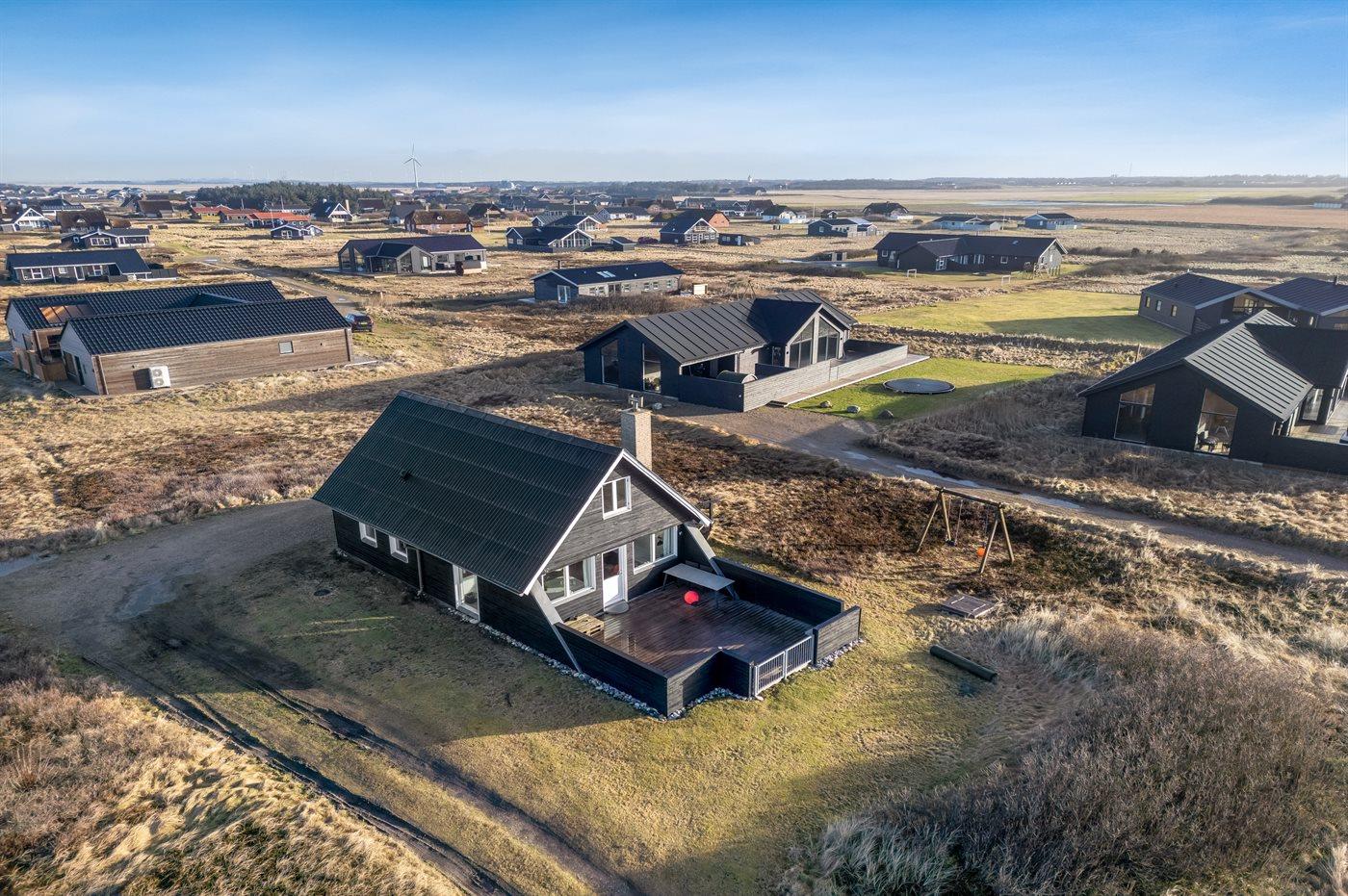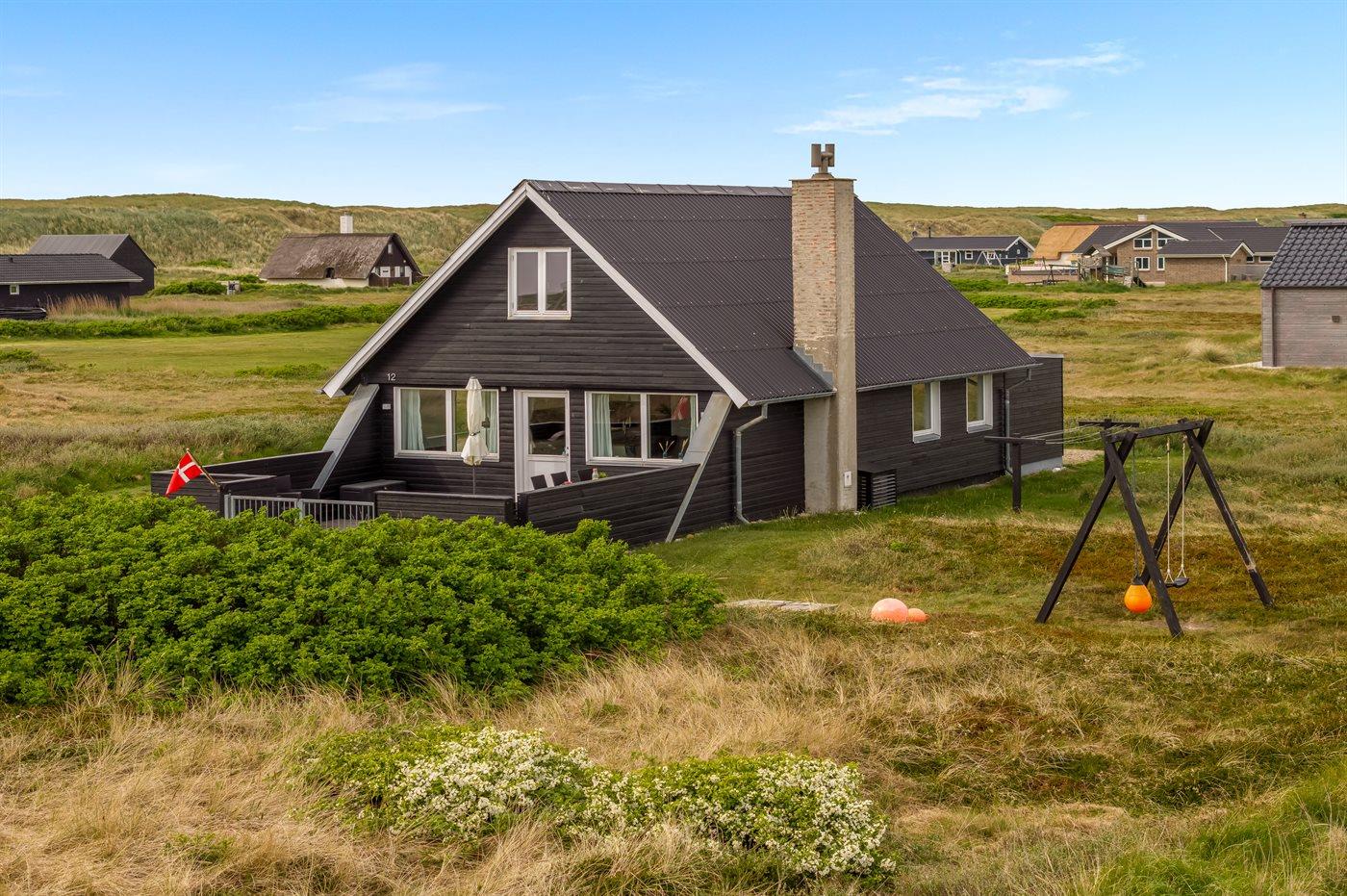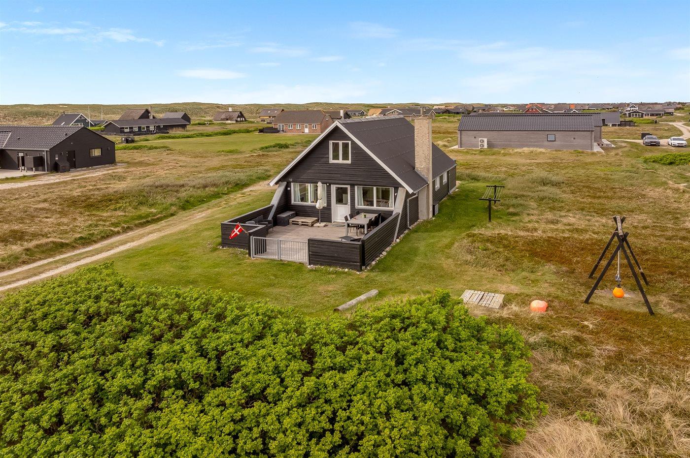 Hyggeligt sommerhus nær Vesterhavet med sauna, aktivitetsrum og stor lukket terrasse.