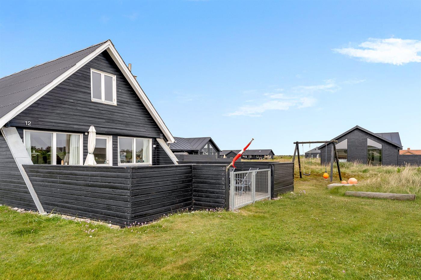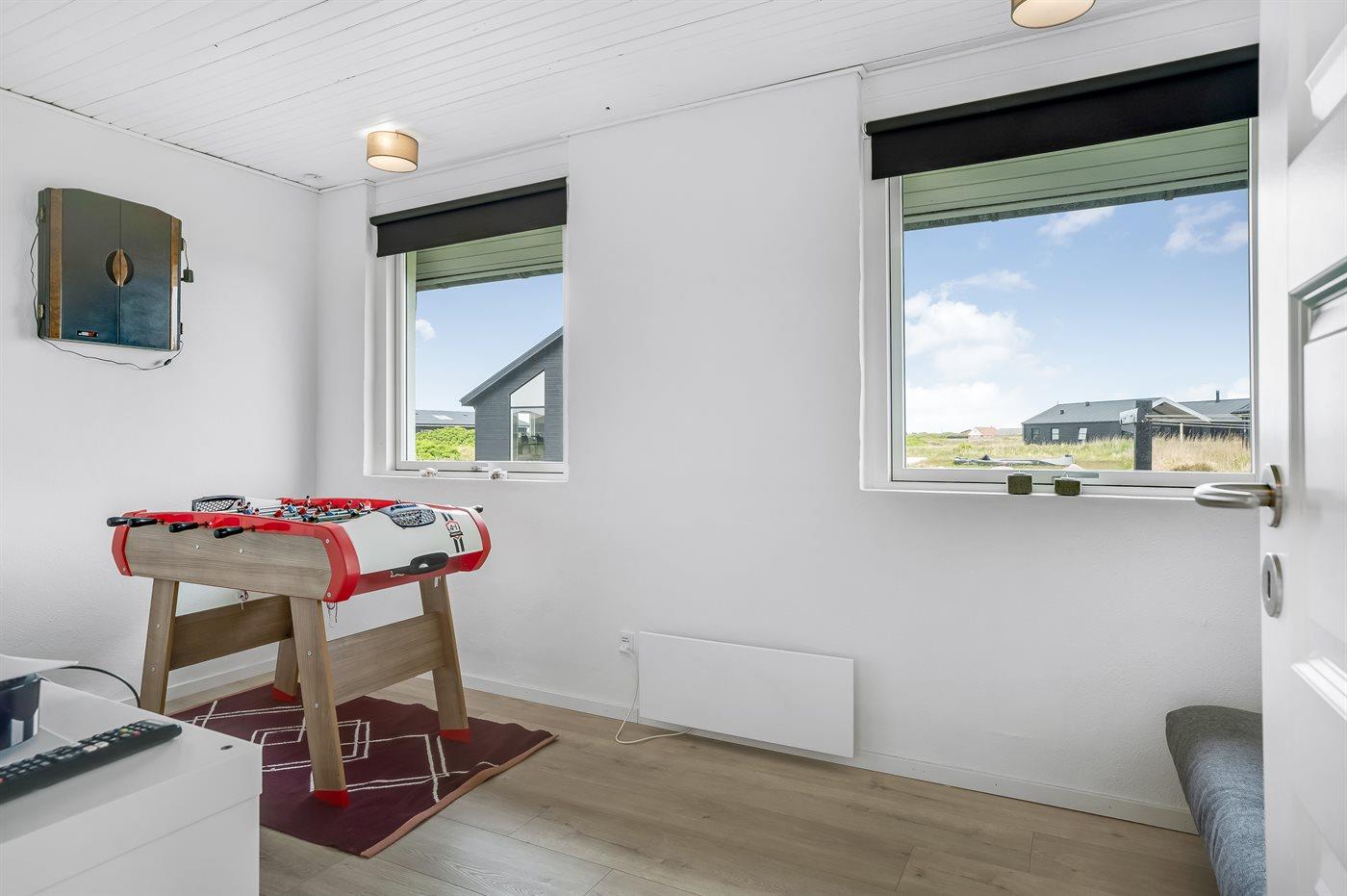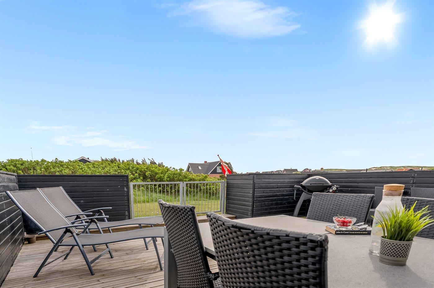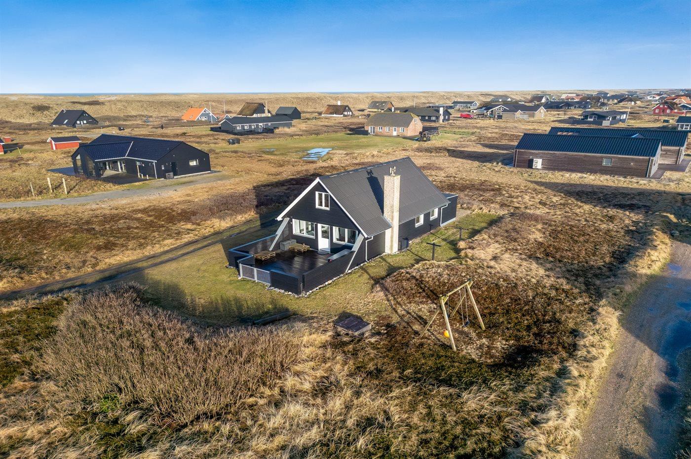 Hyggeligt sommerhus nær Vesterhavet med sauna, aktivitetsrum og stor lukket terrasse.