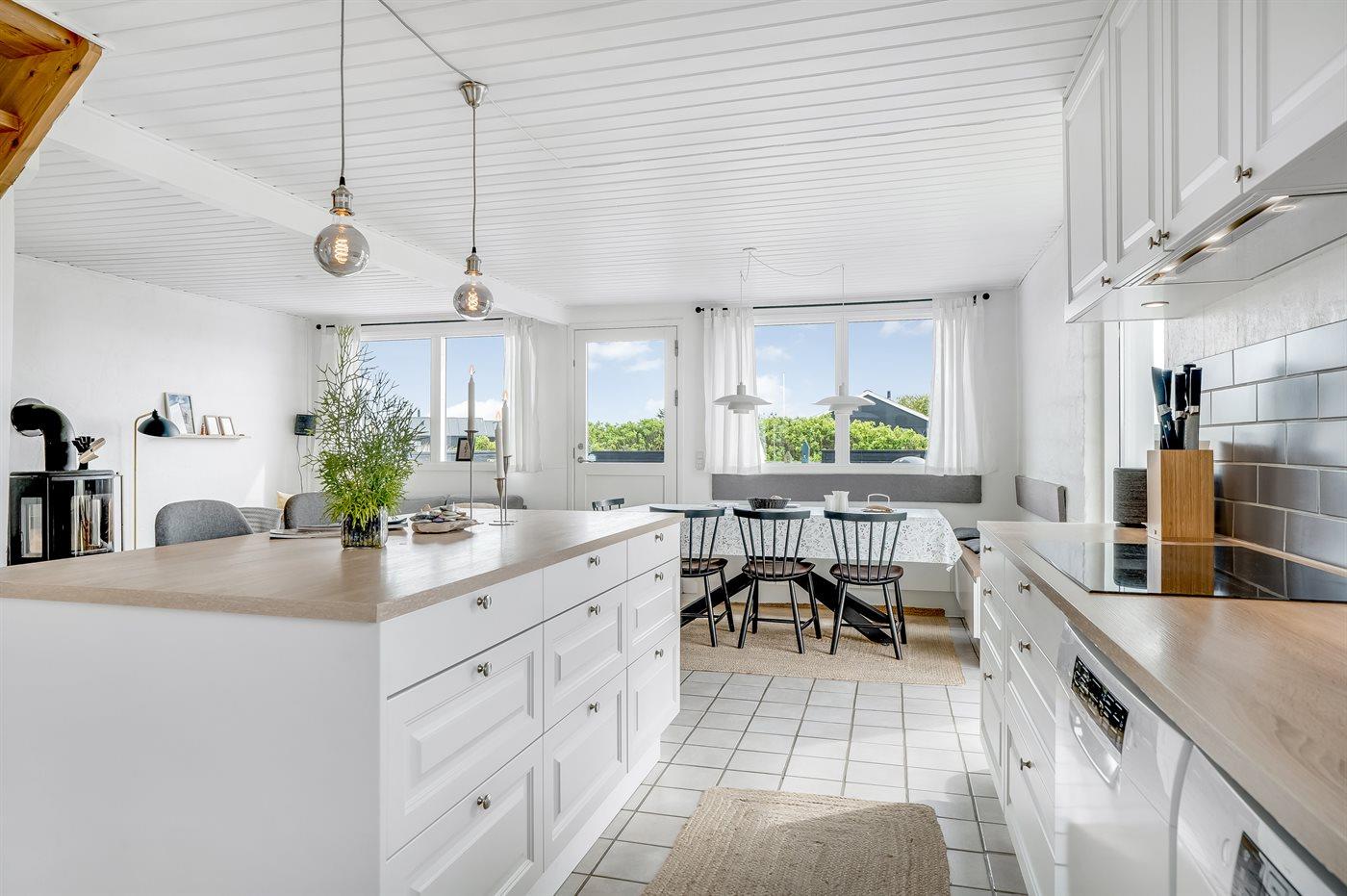 Her får du 117 m² moderne komfort kombineret med hyggelig sommerhusstemning. Sommerhuset har i alt 8 sovepladser, samt en barneseng, men egner sig bedst til 6 personer samt 1 barn op til 3 år. Sovepladserne er fordelt med 3 værelser med dobbeltsenge og en sovesofa i aktivitetsrummet. Der er desuden barneseng og høj stol.