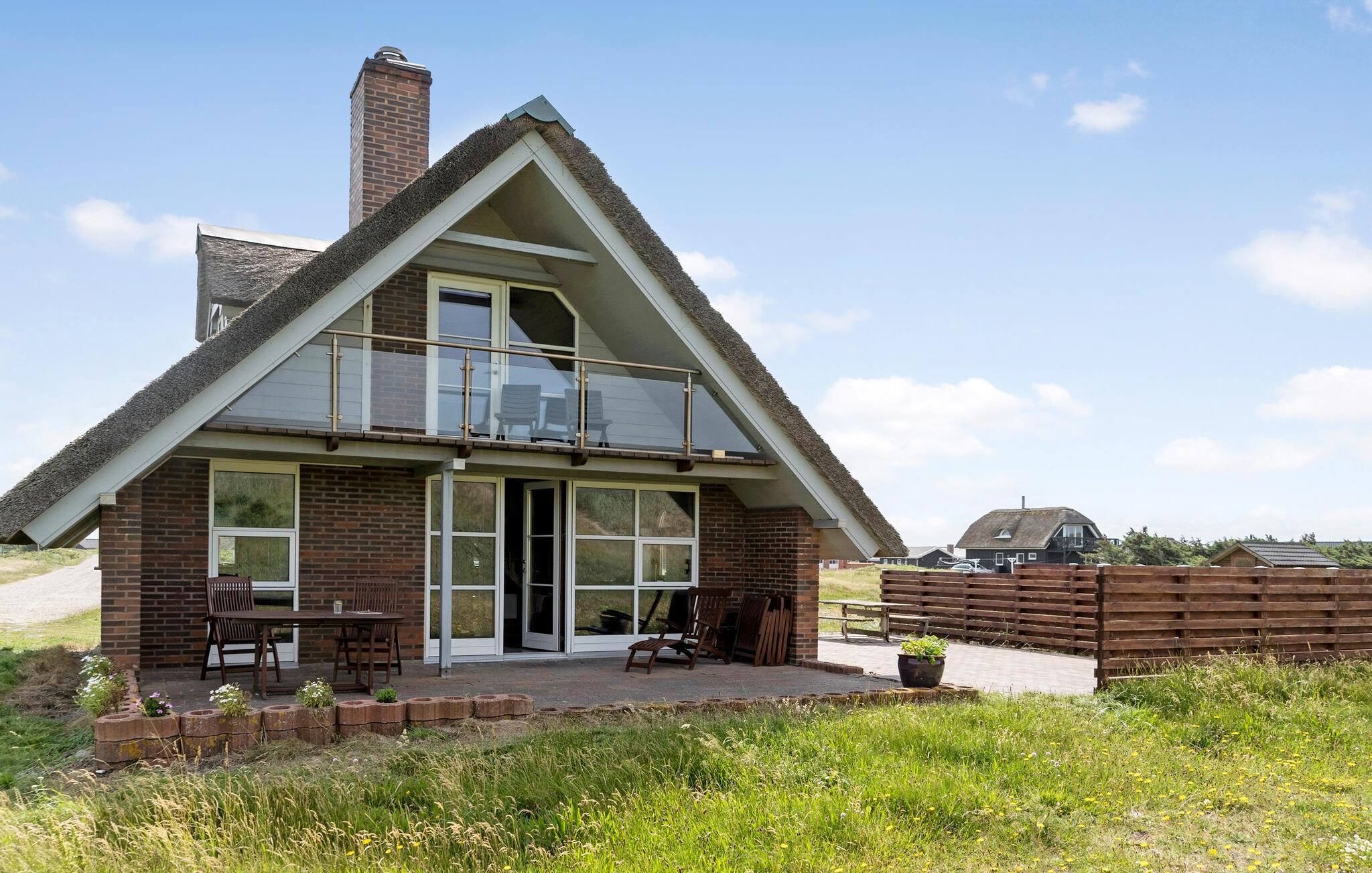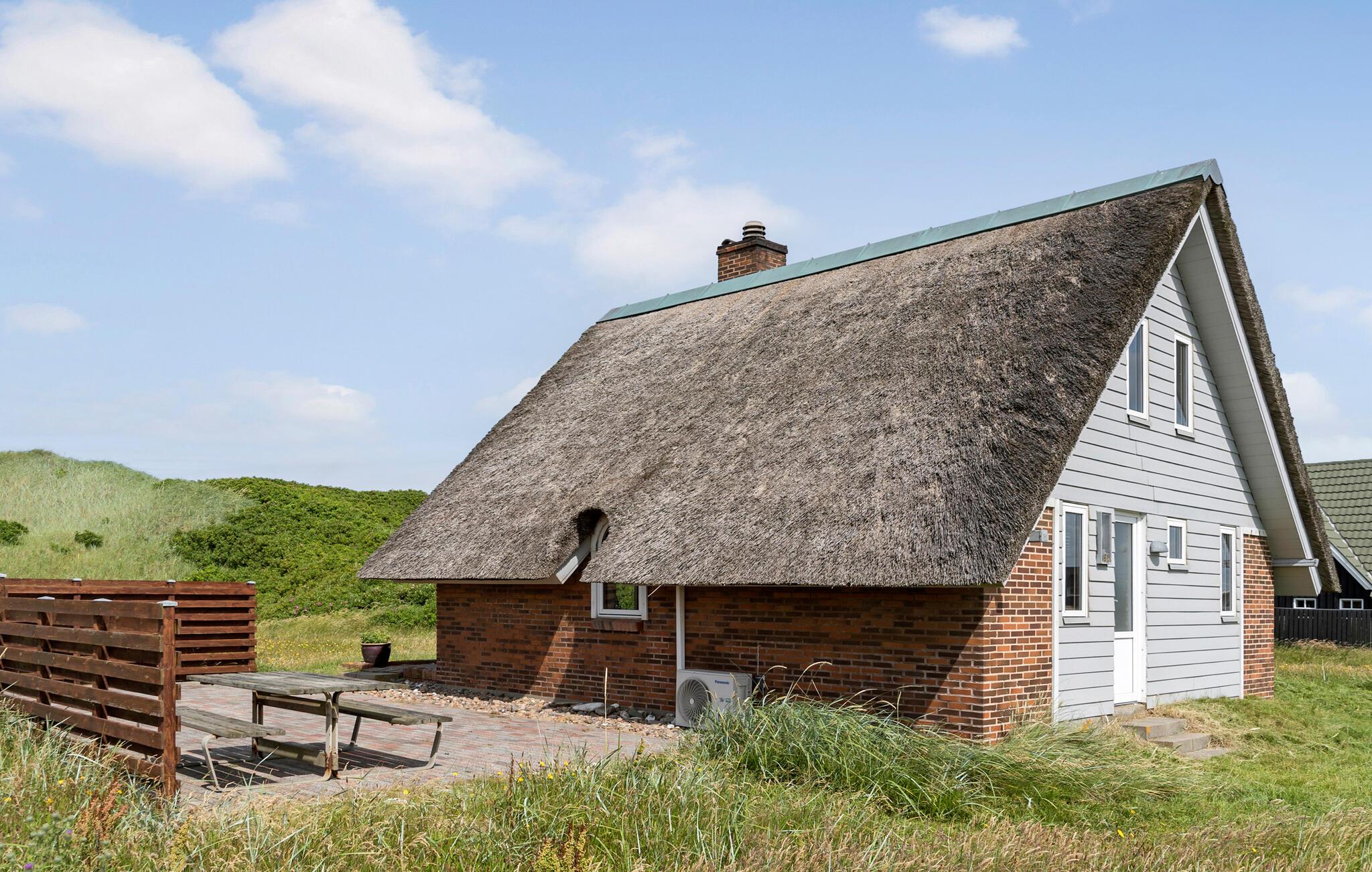 Hyggeligt stråtagshus i første klitrække ved Vrist