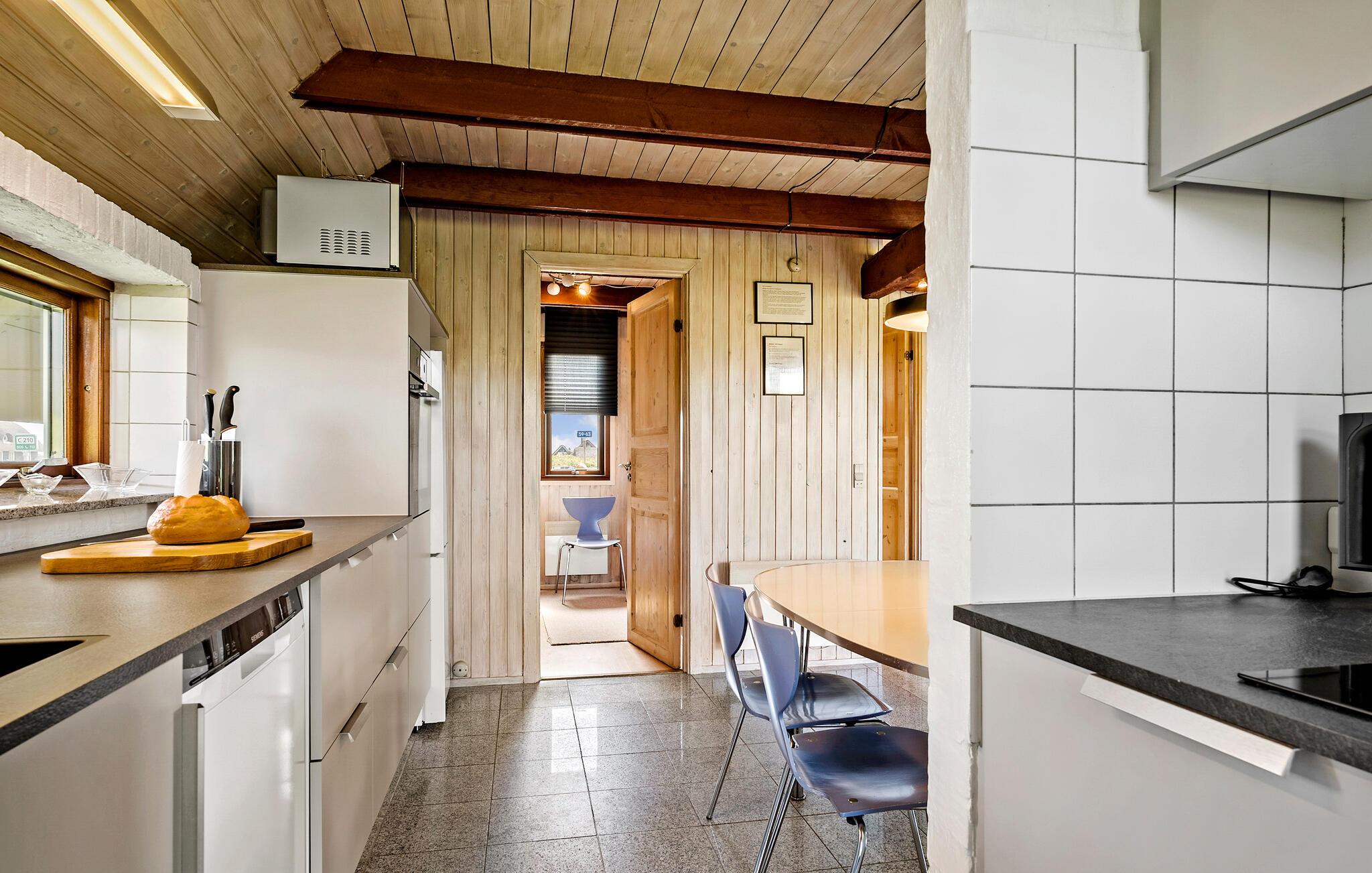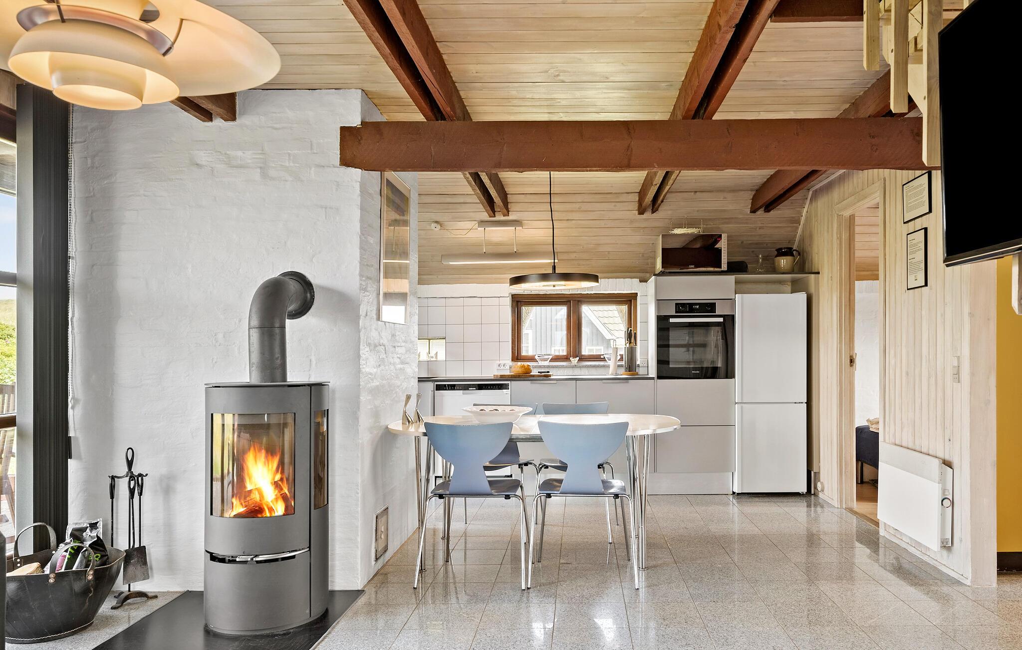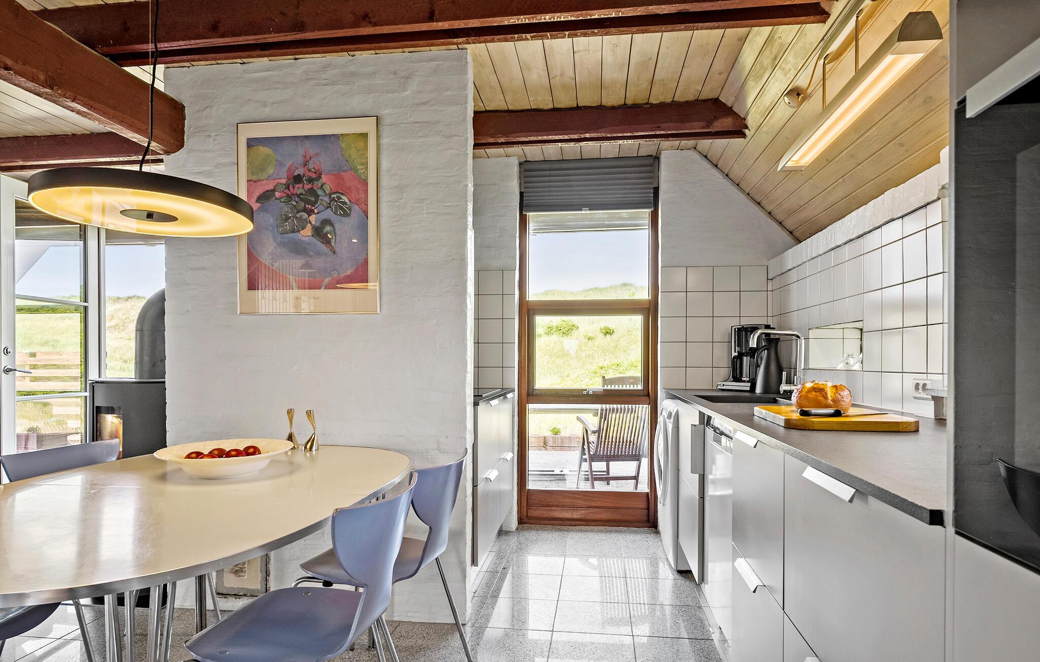 Velkommen til dette velholdte hus, der ligger i første række til Vrist Strand med en vidunderlig udsigt over klitterne. Indvendigt emmer det af hygge med varme træpaneler, fine flisegulve og en brændeovn, der giver varme og stemning, særligt hvis vinden skulle bide lidt fra sig. Køkkenet er rummeligt og veludstyret, så tag jer blot god tid til madlavningen, nyd aftensmaden ved spisebordet og lad aftenen gå på hæld med en god film i stuen, mens I lægger planer for de kommende dage.