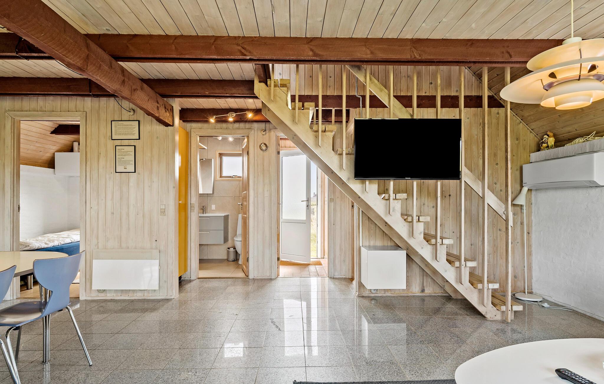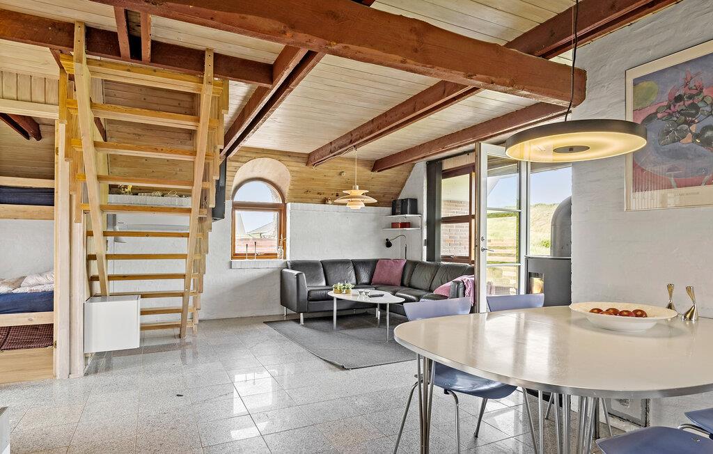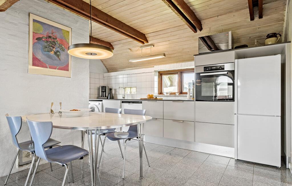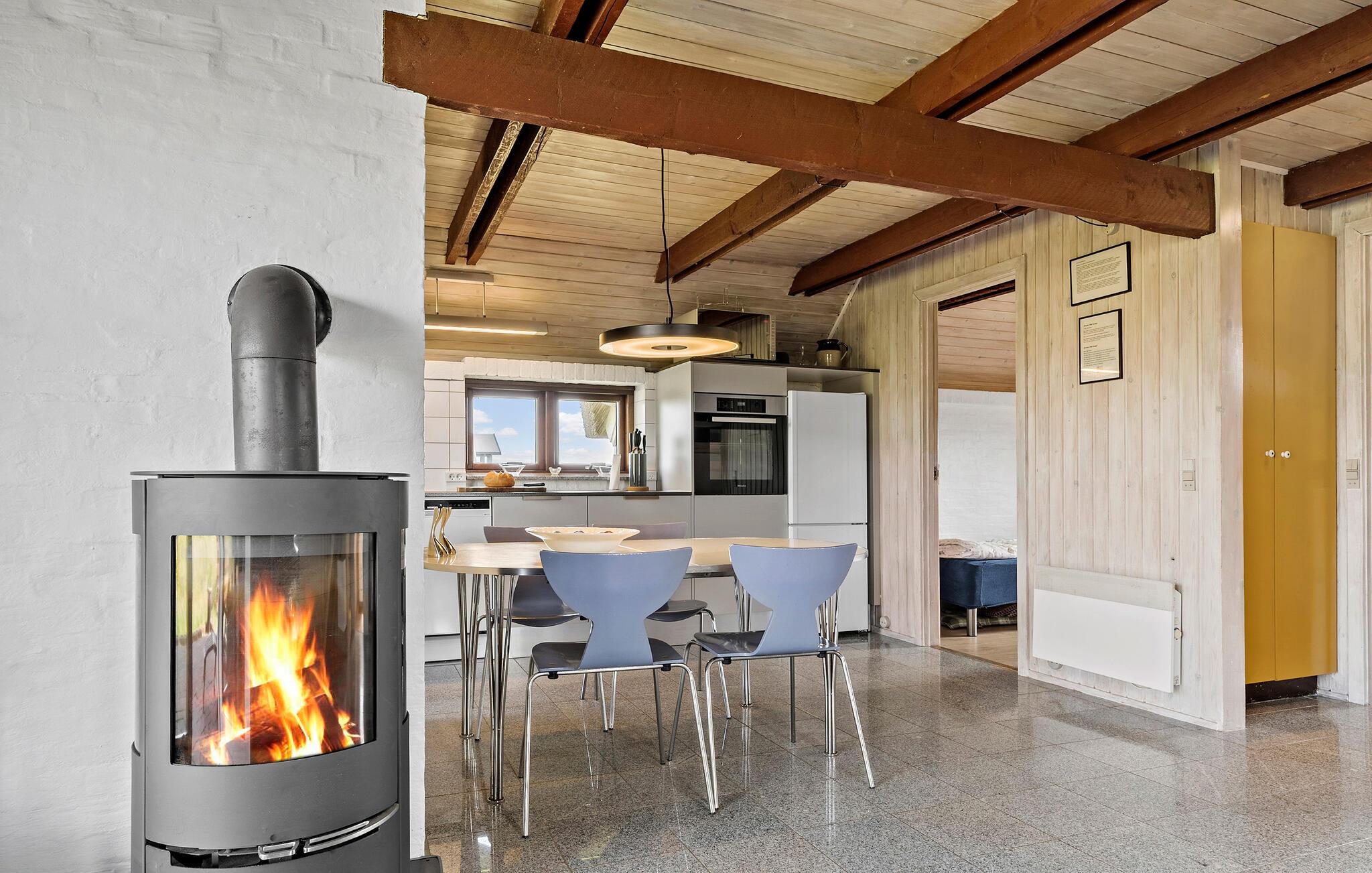 Velkommen til dette velholdte hus, der ligger i første række til Vrist Strand med en vidunderlig udsigt over klitterne. Indvendigt emmer det af hygge med varme træpaneler, fine flisegulve og en brændeovn, der giver varme og stemning, særligt hvis vinden skulle bide lidt fra sig. Køkkenet er rummeligt og veludstyret, så tag jer blot god tid til madlavningen, nyd aftensmaden ved spisebordet og lad aftenen gå på hæld med en god film i stuen, mens I lægger planer for de kommende dage.