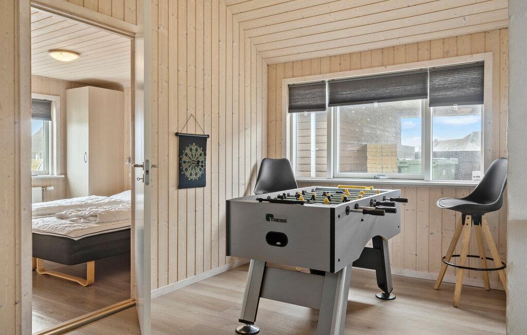 Dette moderne indrettede feriehus giver jer ideelle betingelser for et afslappet ophold med familien eller venner. Huset ligger omgivet af klitlandskab og kun et stenkast fra vandet. Udnyt det generøse boligareal og den gennemtænkte rumopdeling til fælles stunder. I har også mulighed for at trække jer tilbage hver for sig. Lav mad i det moderne køkken, som går i ét med den åbne opholds- og spisestue. Nyd måltiderne ved det lange bord med udsigt til klitterne. Slap af i stuen med komfortable sofaer og brændeovn, eller udfordr jer selv i spillerummet med bordtennis, billard og bordfodbold. I poolområdet venter en stor swimmingpool med rutsjebane, vandfontæner, spabad og sauna.