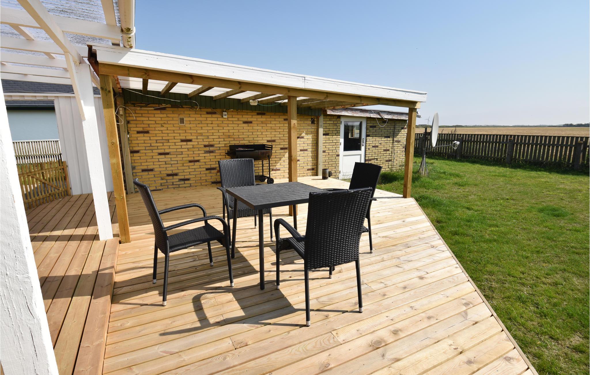 Hyggeligt sommerhus tæt på Vesterhavet med stor, overdækket terrasse og indhegnet grund til leg og afslapning.