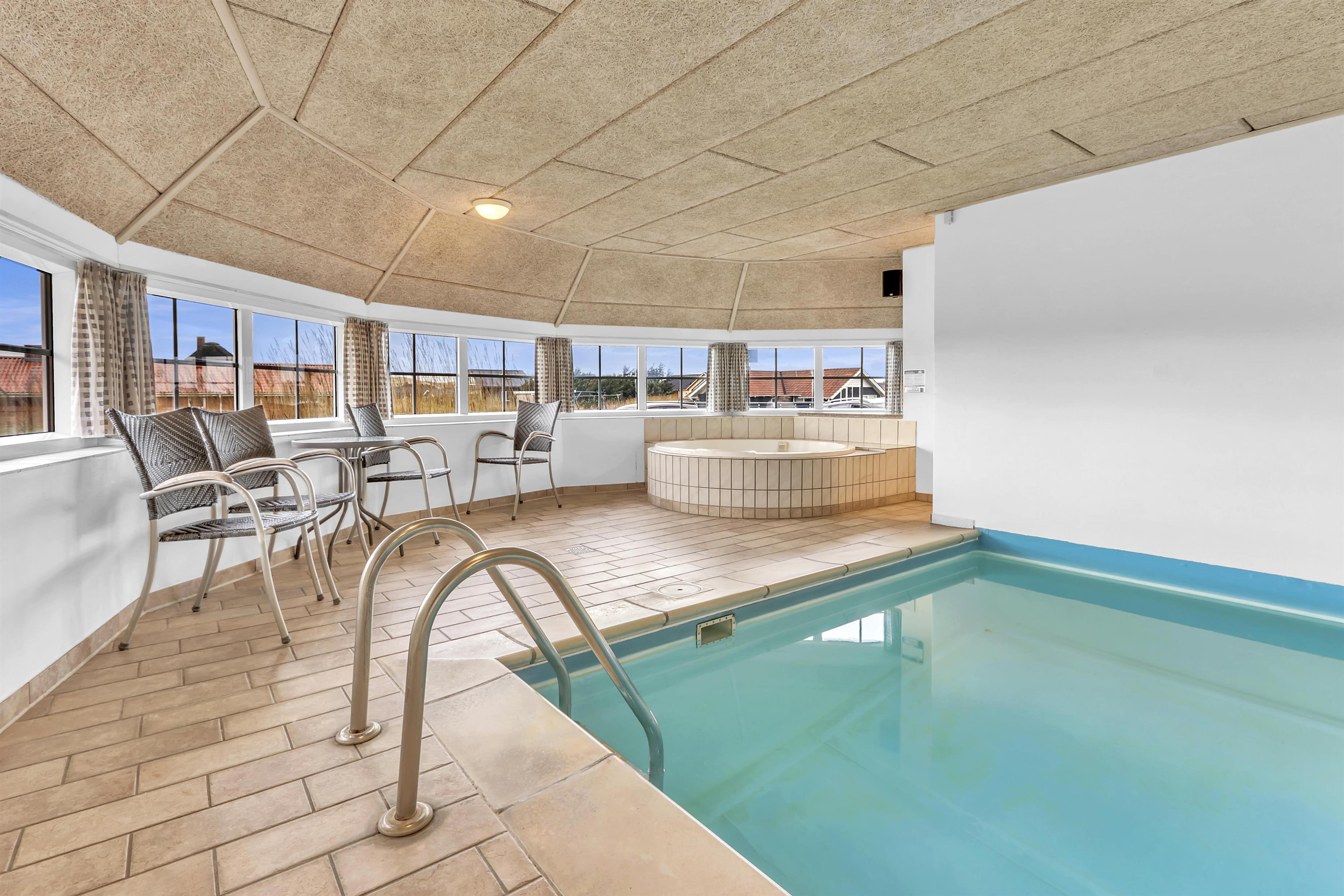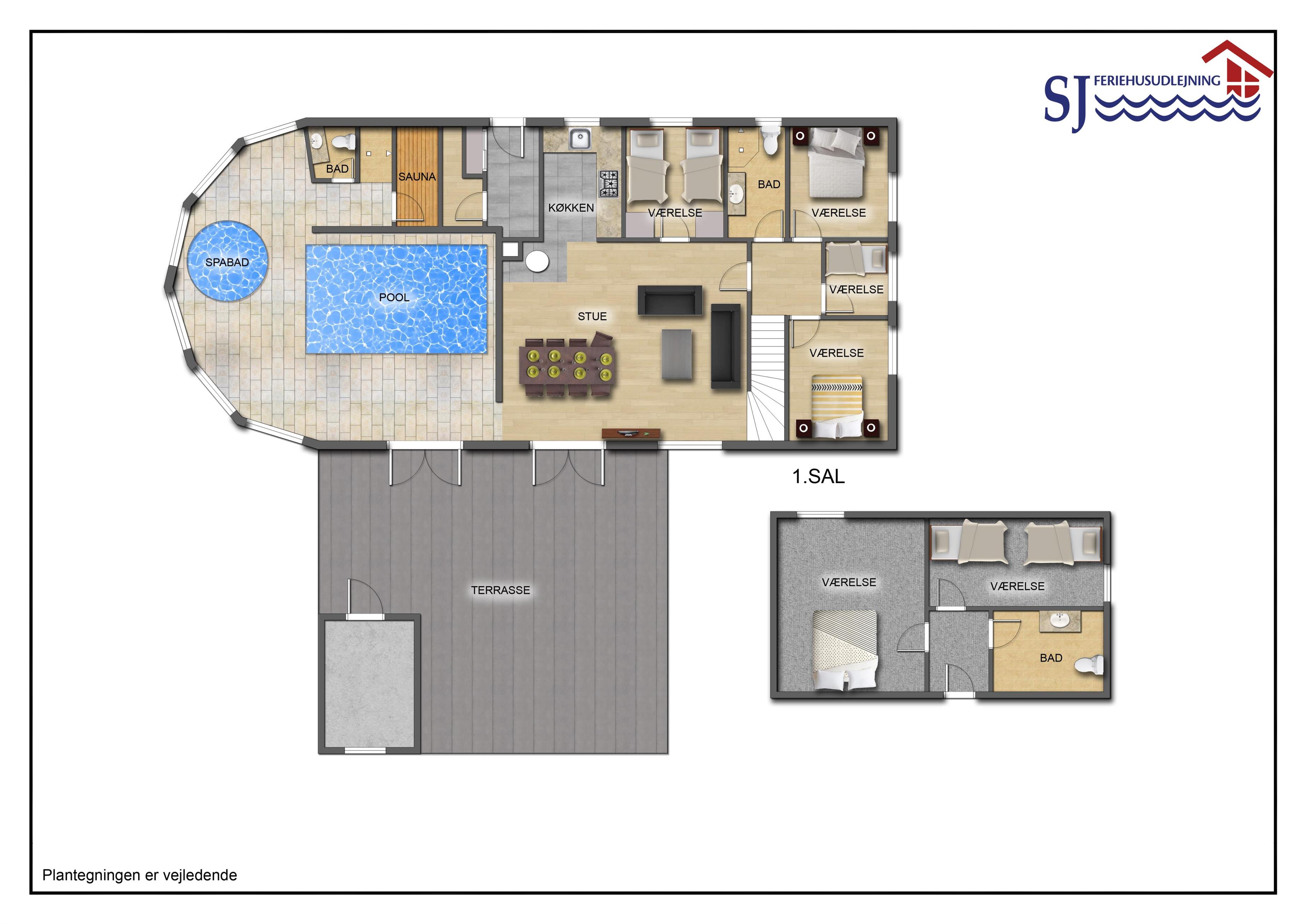 Hæng tøjet i entréen som også fungerer som vaskerum, og hvor husets vaskemaskine og tørretumbler er placeret. Vælg blandt huset 6 soverum (1DS, 1DS, 2ES, 1ES) i stueplan og (1DS, 2ES) på første sal og find det perfekte sted for dig at få din skønhedssøvn. Det 201 m2 store poolhus er smagfuldt indrettet med en dejlig opholdsstue med lædermøbler, fladskærms-tv med danske og tyske kanaler, CD/ DVD afspiller, spiseplads og trappe til 1. sal. På første sal er der 2 soveværelser og et ekstra toilet med håndvask og vinyl på gulvet. Godt udstyret køkkenhjørne med keramisk komfur, emhætte, mikroovn, køleskab og opvaskemaskine. Stor cirkelformet poolafdeling med rund 4 personers standvandsspa og direkte adgang til sauna, hvorfra der er overblik over poolen. Der er også et dejligt badeværelse med toilet, håndvask og bruser. Der er klinkegulv i hele poolafdelingen. Husets 3 baderum har toilet, håndvask, bruser og klinkegulv ned gulvvarme. Lyst og venligt, men også særdeles praktisk indrettet med trægulve i stueplan og gulvtæpper på første sal. Husk også, at du må medbringe det firbenede familiemedlem, da 1 husdyr er tilladt i huset, og at der er separat frysekapacitet på ca. 120 l til de medbragte frysevarer eller til de friske fisk, som kan købes eller fanges i området. Huset er energivenligt. Depositum vintersæson kr. 4500 og sommersæson kr. 2200. Har man el-bil eller en Plug-In hybrid, så er der opsat ladeboks