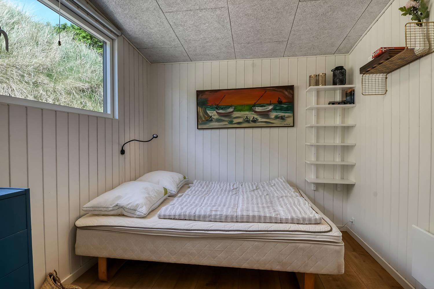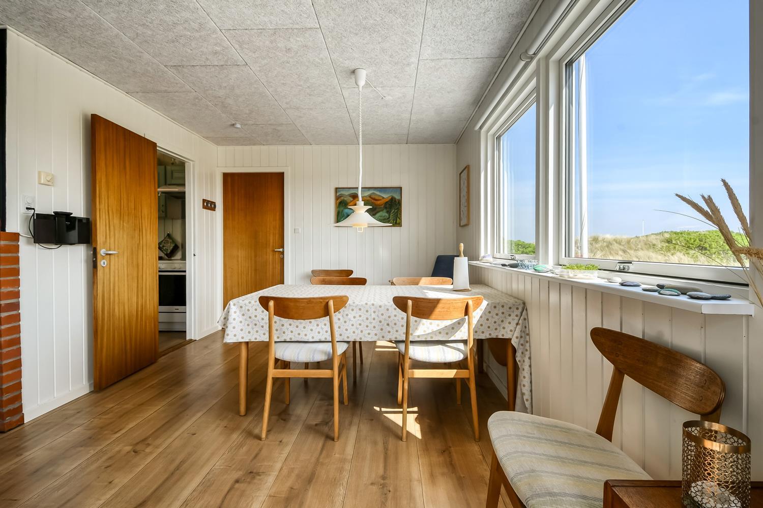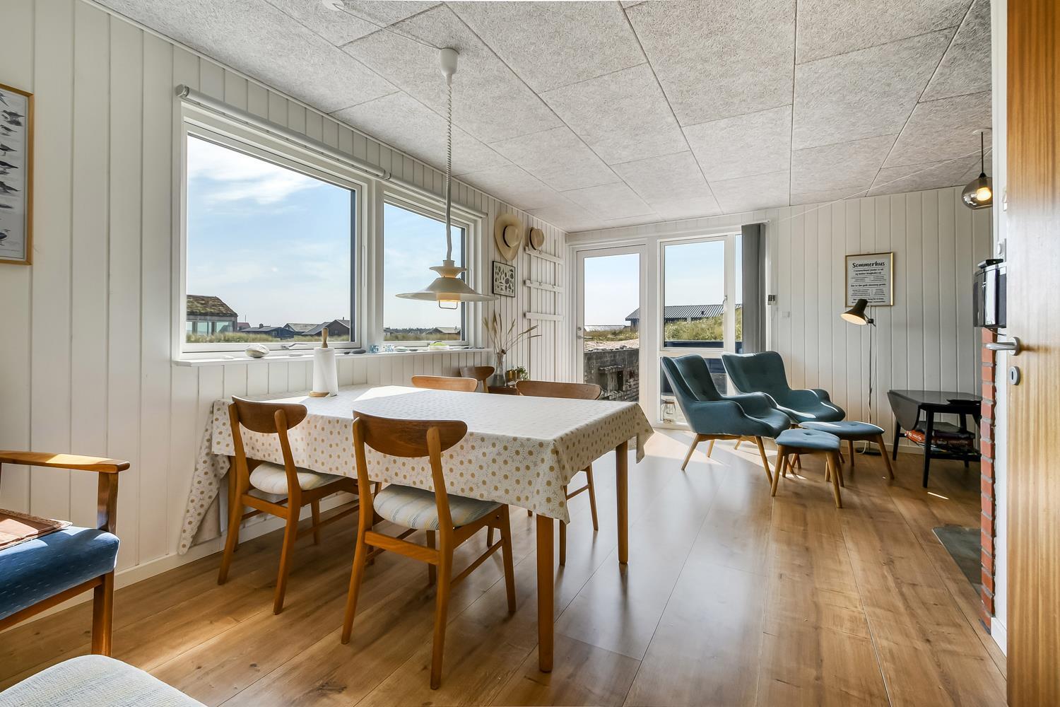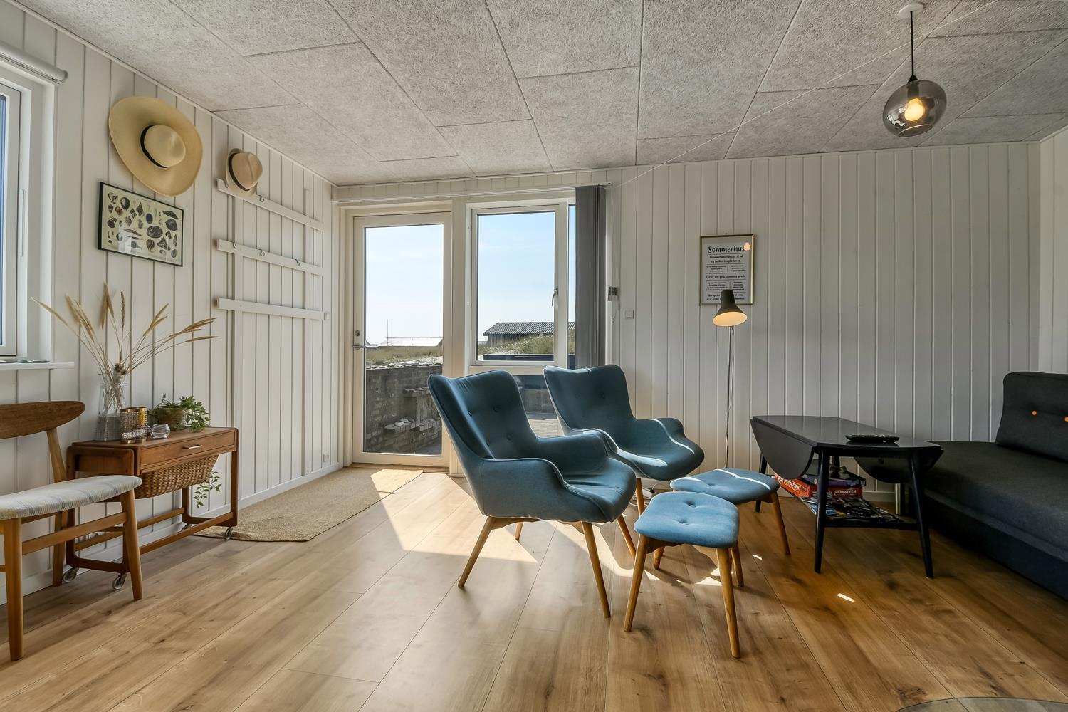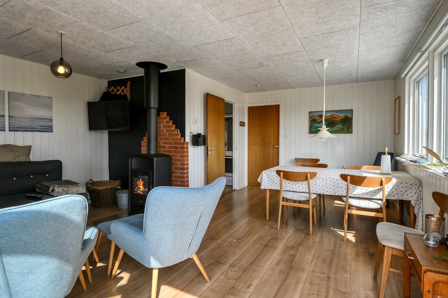 Mindre sommerhus på 60m2 med 2 soverum (1DS, 1Doppelt sovesofa). Opholdsstue lædermøbler, spiseplads, Smart-TV med danske og tyske programmer samt mulighed for streaming af TV / radio / Apps, apple-TV, radio, CD-afspiller, brændeovn samt udsigt til klitterne. Nyt Køkkenhjørne med komfur med glaskeramiske kogeplader, emhætte, mikroovn og køleskab. Badeværelse med bruser, toilet, håndvask, vaskemaskine og klinkegulv. Har man el-bil eller en Plug-In hybrid, så er der til huset et ladestik. Husdyr ikke tilladt.