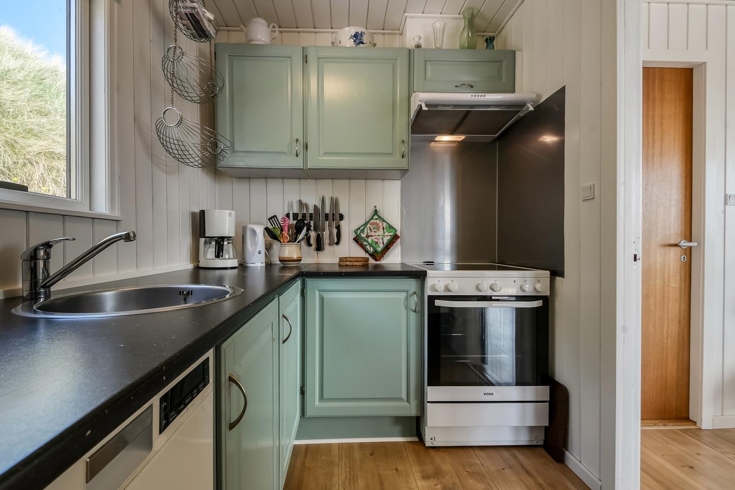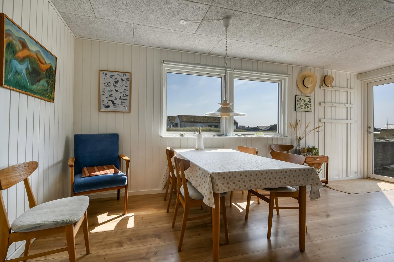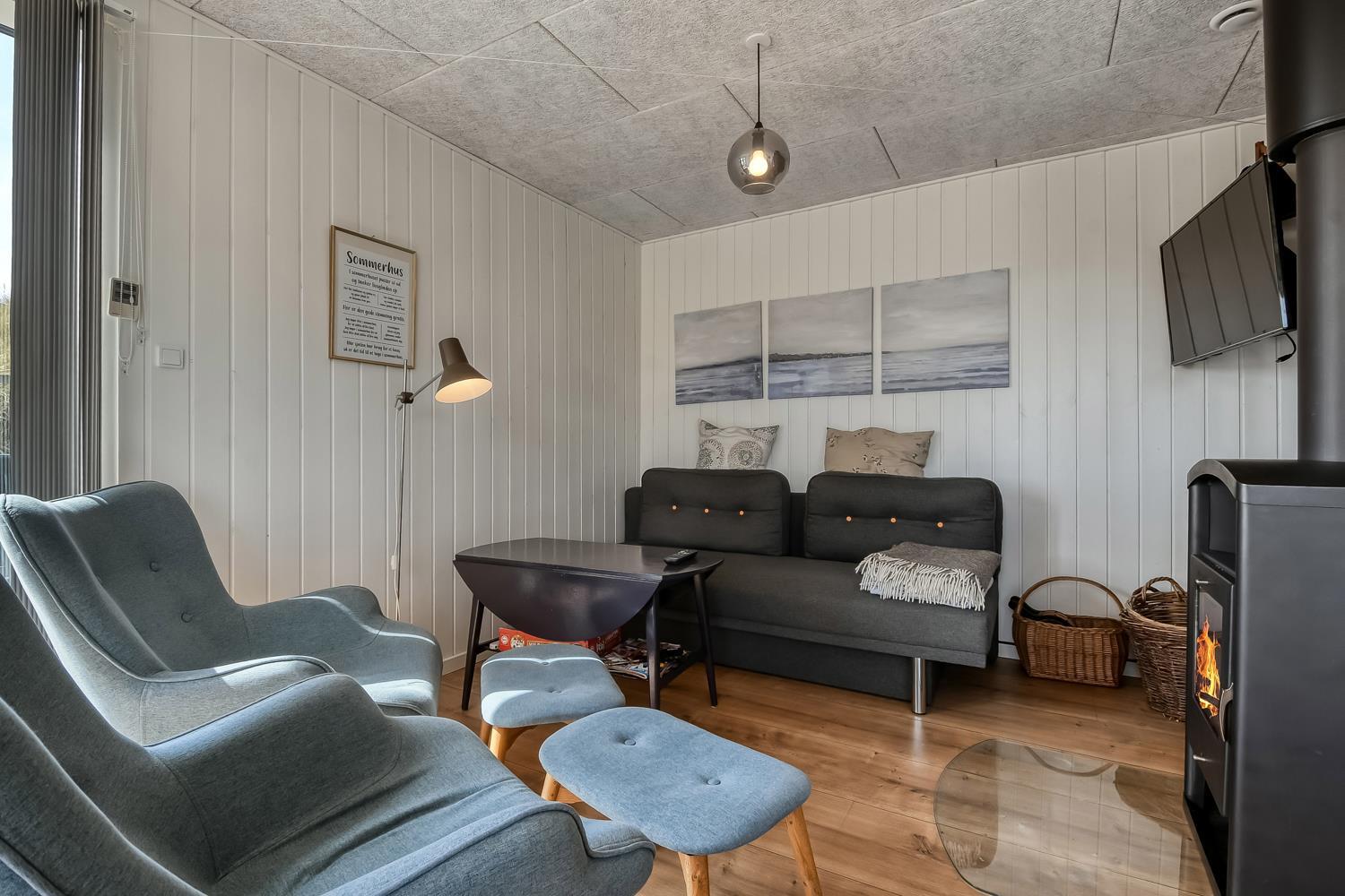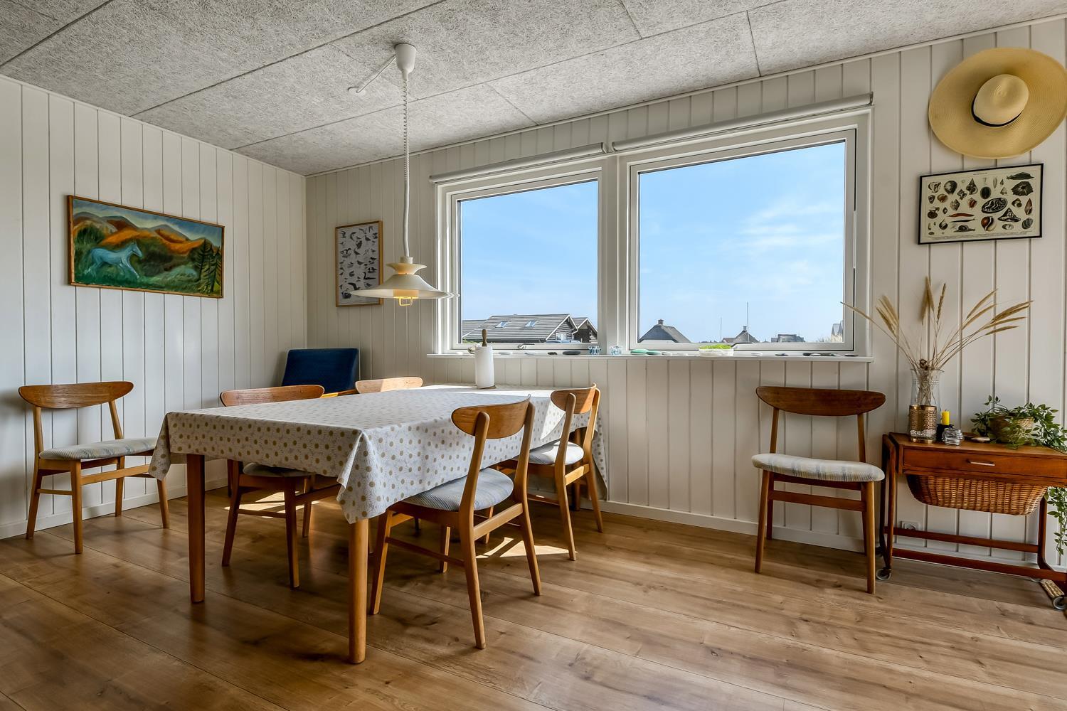 Mindre sommerhus på 60m2 med 2 soverum (1DS, 1Doppelt sovesofa). Opholdsstue lædermøbler, spiseplads, Smart-TV med danske og tyske programmer samt mulighed for streaming af TV / radio / Apps, apple-TV, radio, CD-afspiller, brændeovn samt udsigt til klitterne. Nyt Køkkenhjørne med komfur med glaskeramiske kogeplader, emhætte, mikroovn og køleskab. Badeværelse med bruser, toilet, håndvask, vaskemaskine og klinkegulv. Har man el-bil eller en Plug-In hybrid, så er der til huset et ladestik. Husdyr ikke tilladt.