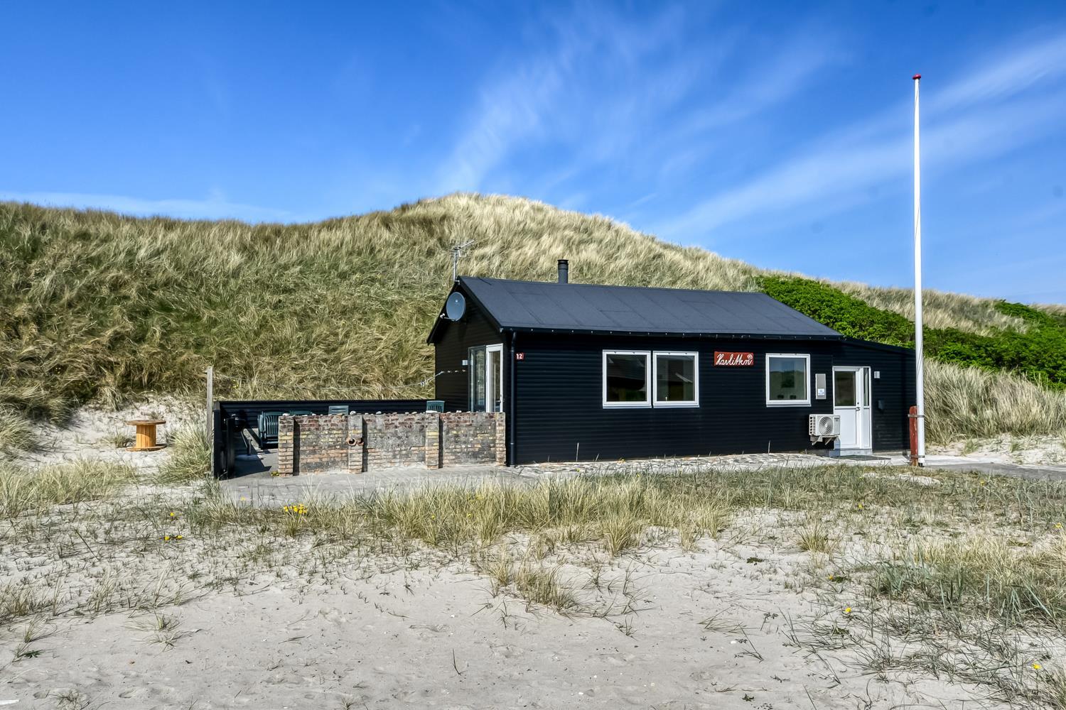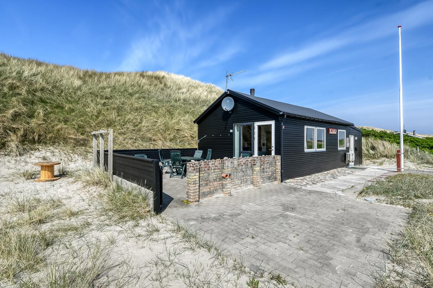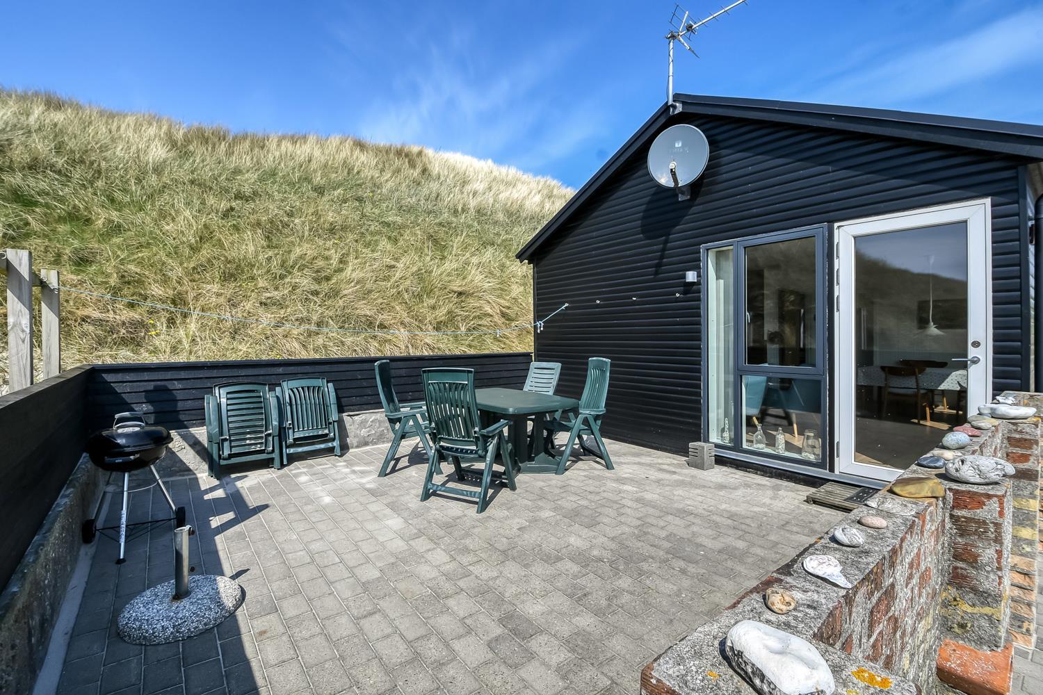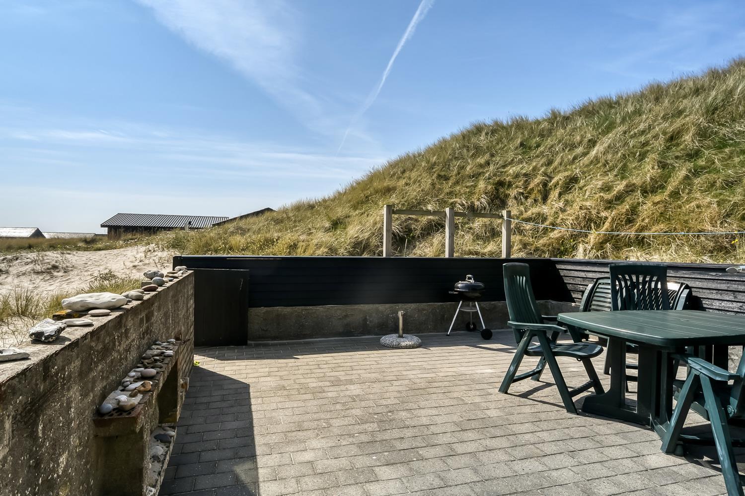 Huset ligger på en ca. 1.185 m2 stor klitgrund direkte ved foden af de høje klitter og kun 50m fra Vesterhavet. Fra opholdsstuen er der udgang til en lille terrasse med havemøbler. Nyd en ferie i et feriehus med en helt unik beliggenhed. Ved leje af dette hus kan i være på stranden indenfor 5 minutter.