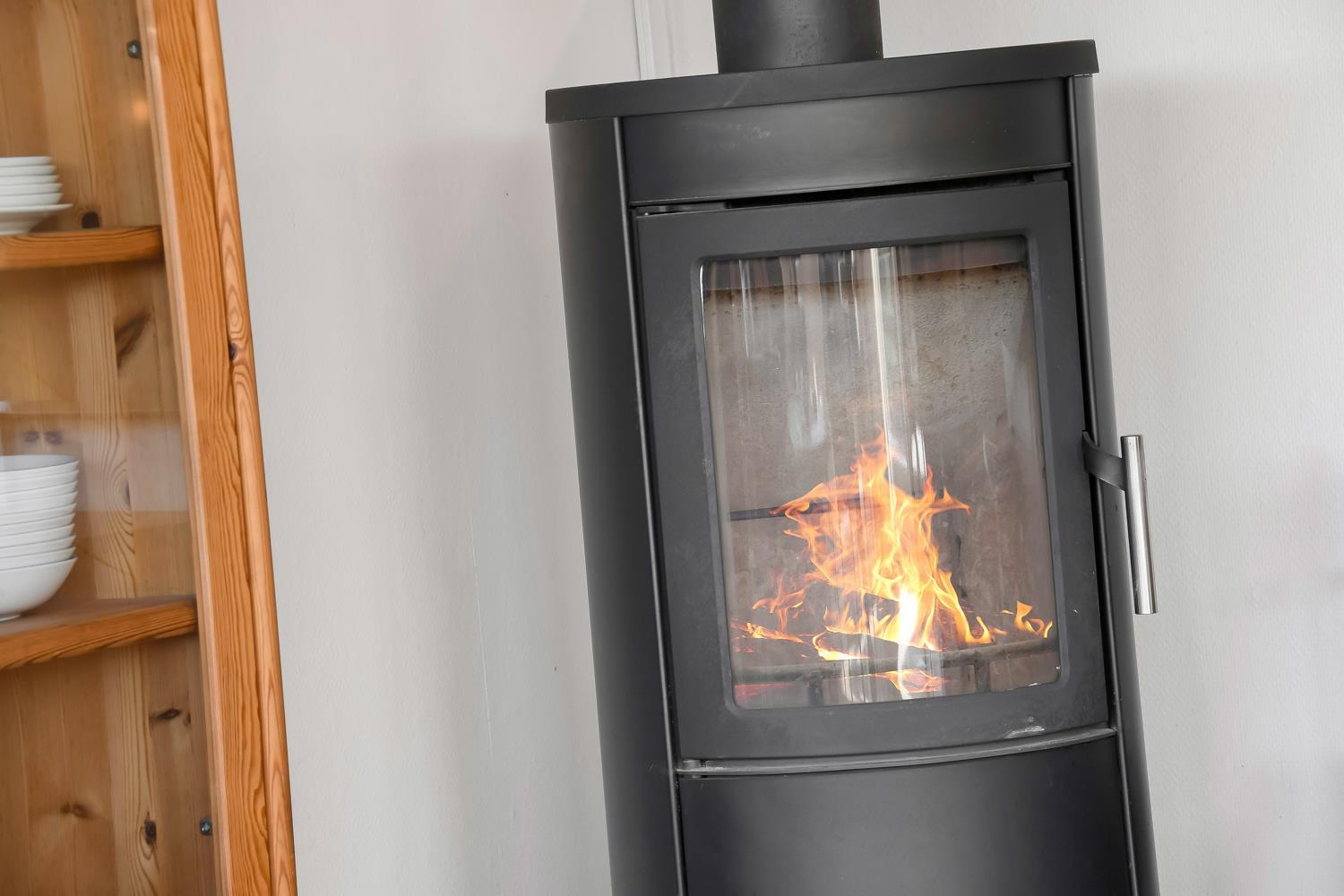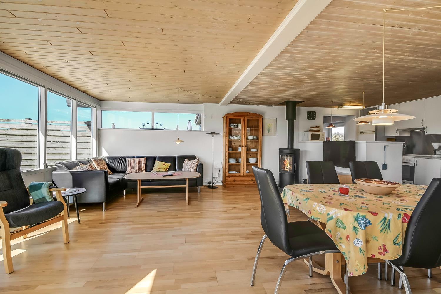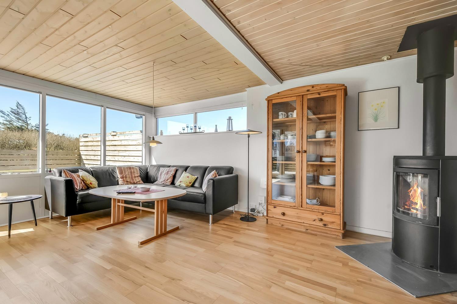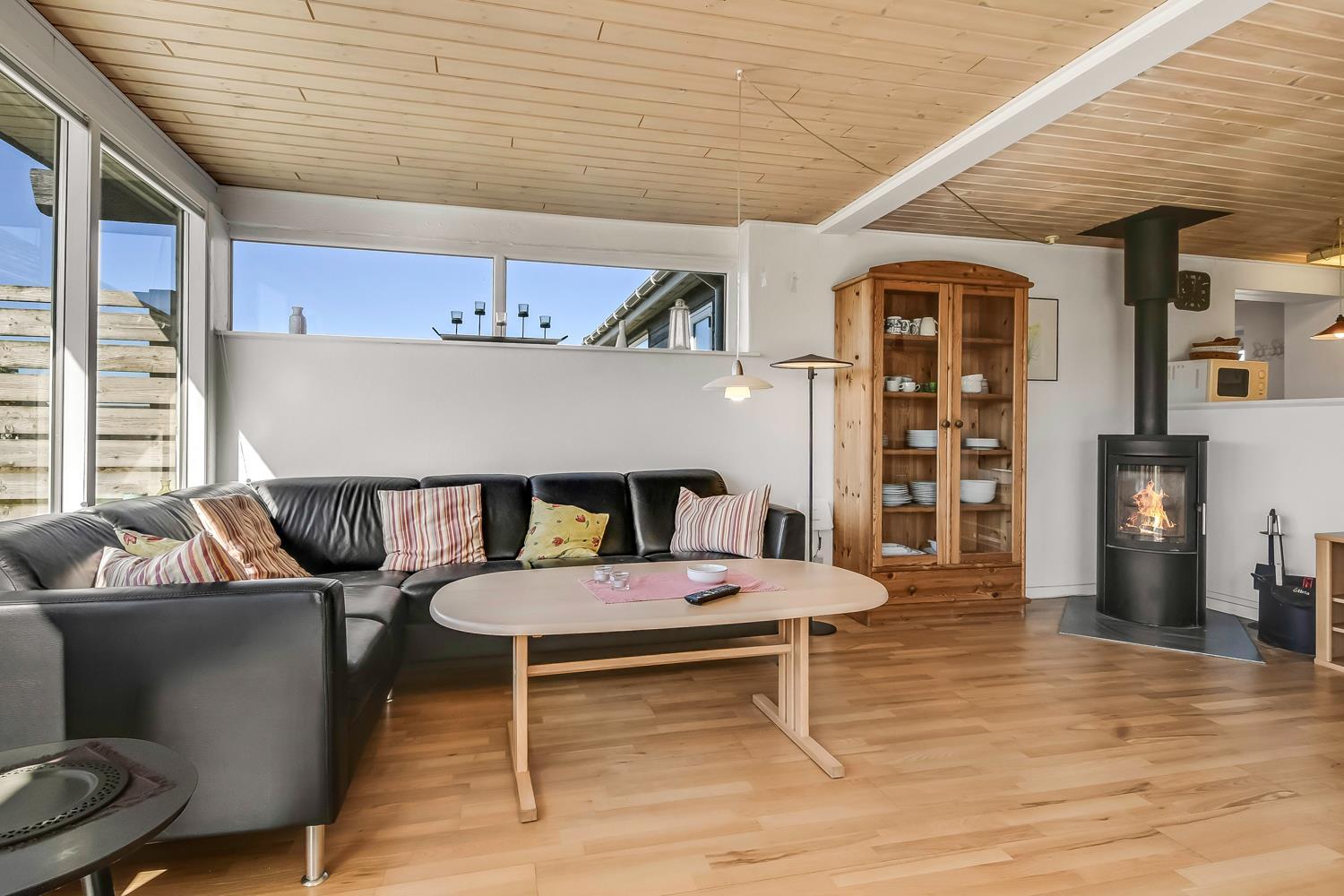 Den hyggelige stue byder på TV, en brændeovn og en energibesparende varmepumpe, der sikrer en behagelig temperatur året rundt – og samtidig hjælper med at holde forbrugsafregningen lav ved afrejse.