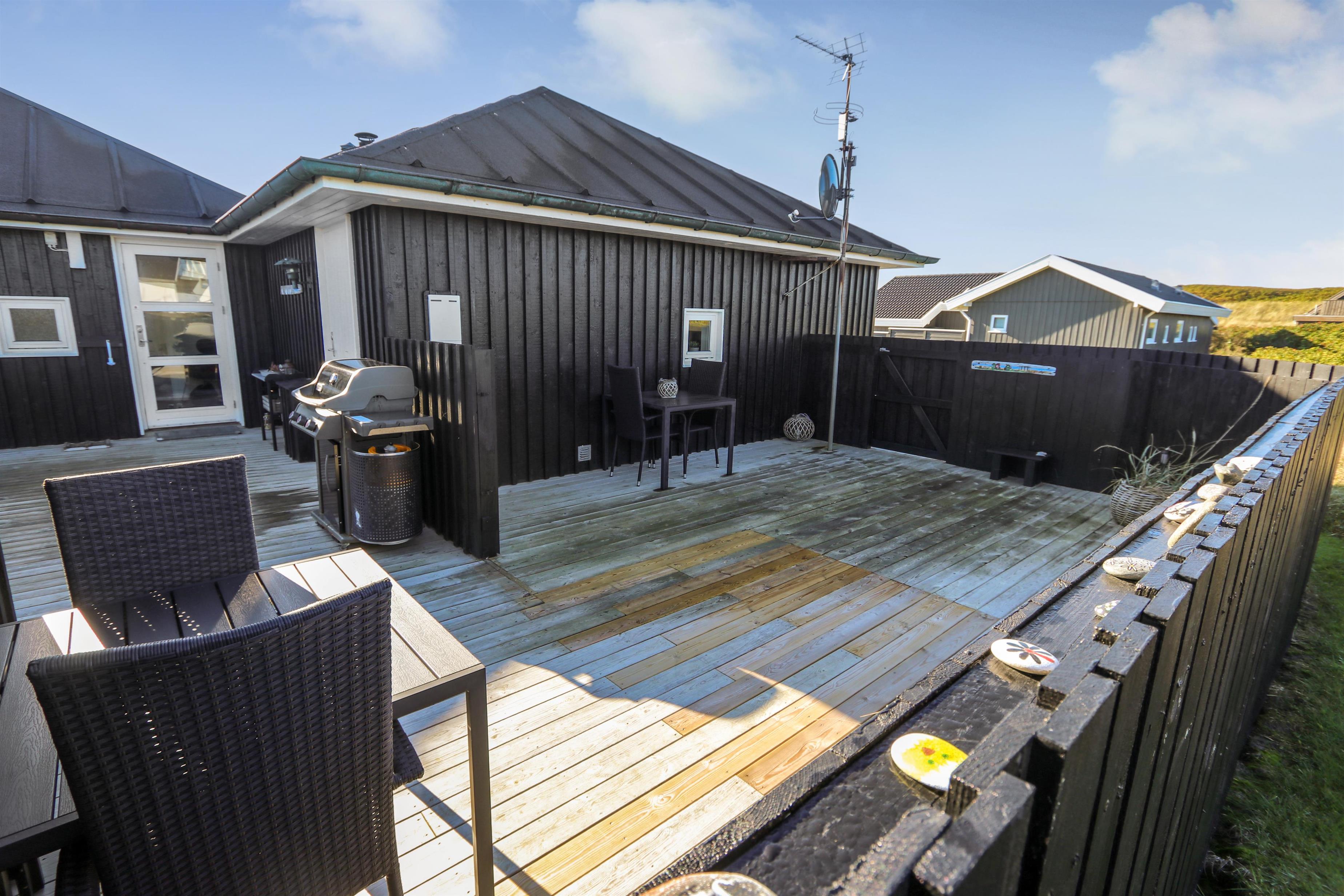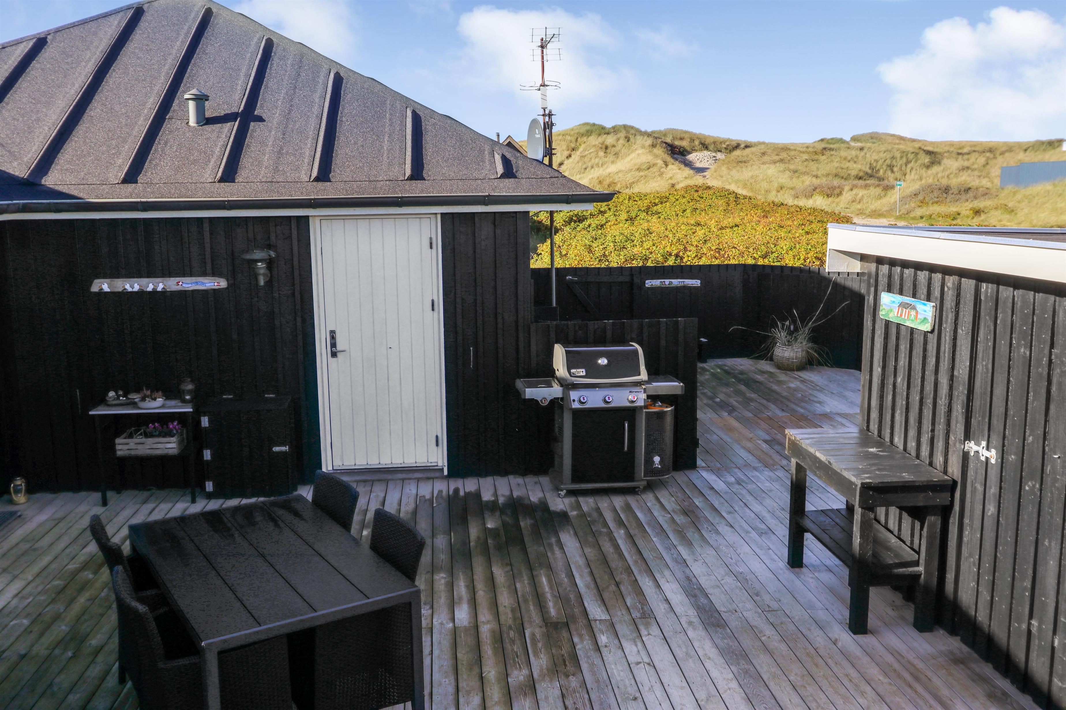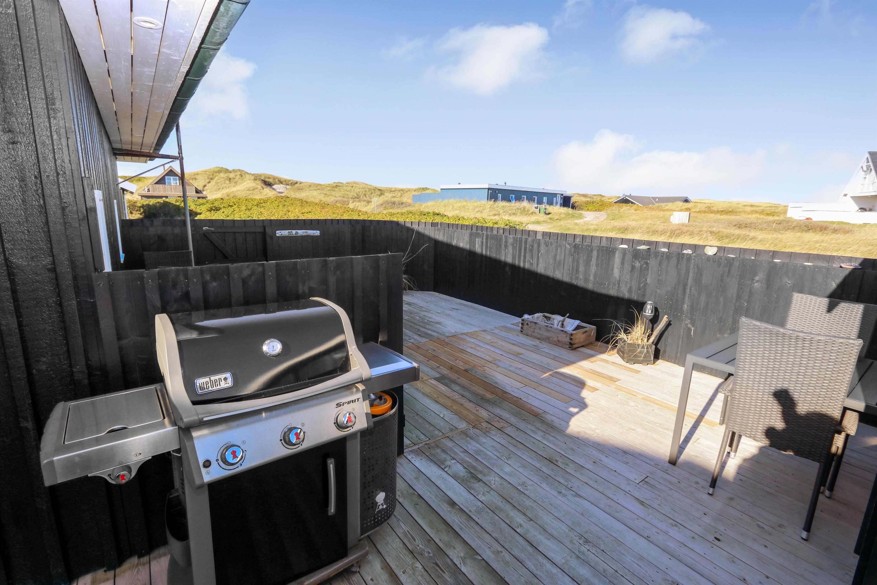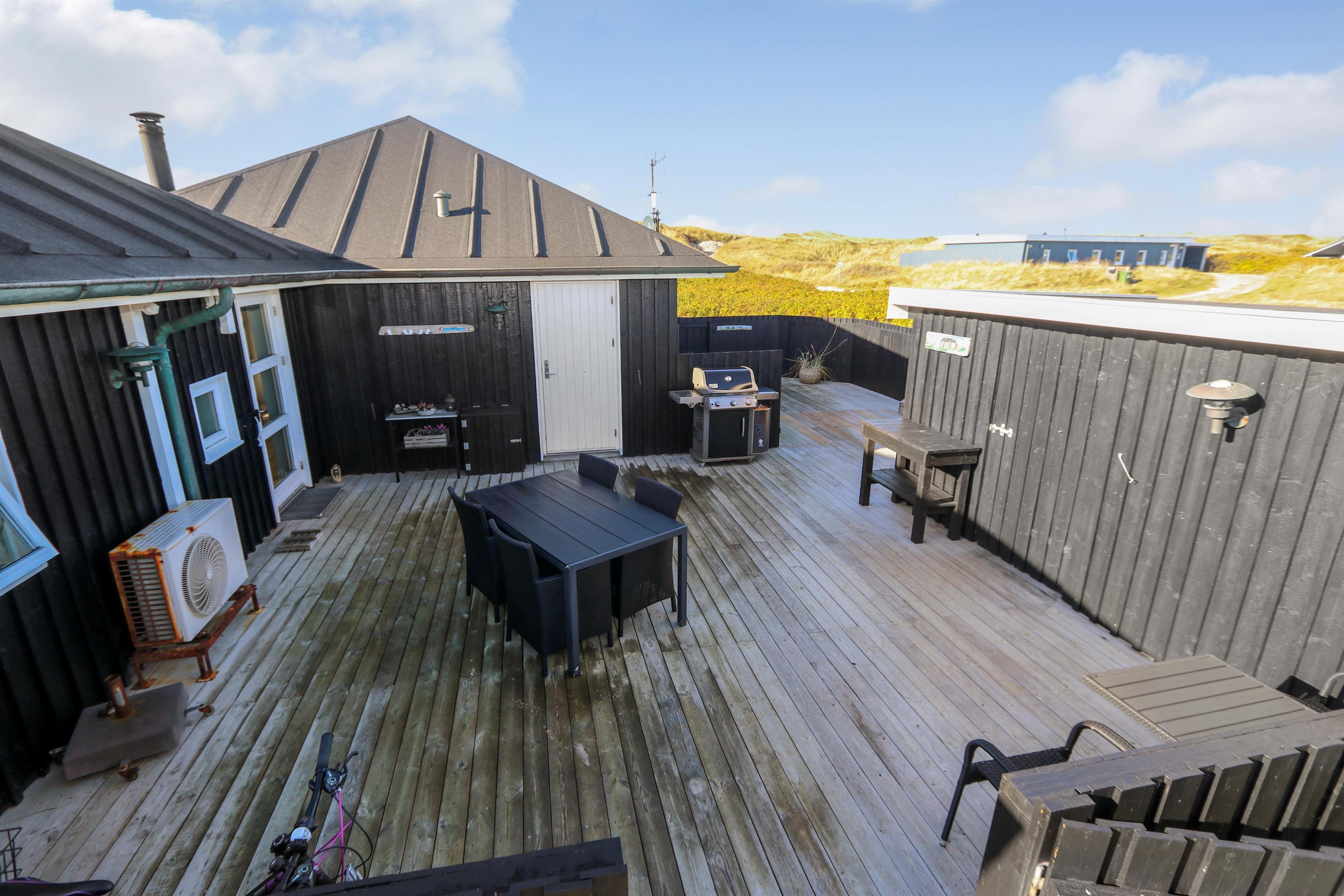 Fra opholdsstuen er der udgang til en dejlig terrasse med parasol, grill, havemøbler, liggestole samt udsigt til de høje klitter. Fra entréen er der udgang til endnu en lukket terrasse, som er det perfekte opholdssted for både børn og voksne. En feriebolig af høj kvalitet som danner den perfekte ramme for en ferie meget tæt på Vesterhavet. Hvad enten du er til aktive gåture ved stranden, tager cyklen efter morgenbrød eller blot ønsker fred og ro i unikke omgivelser, så giver dette feriehus dig alle muligheder. Der er kun ca. 1.500 m til det nærmeste supermarked. Legeplads og boldbane findes blot 100 m fra huset.