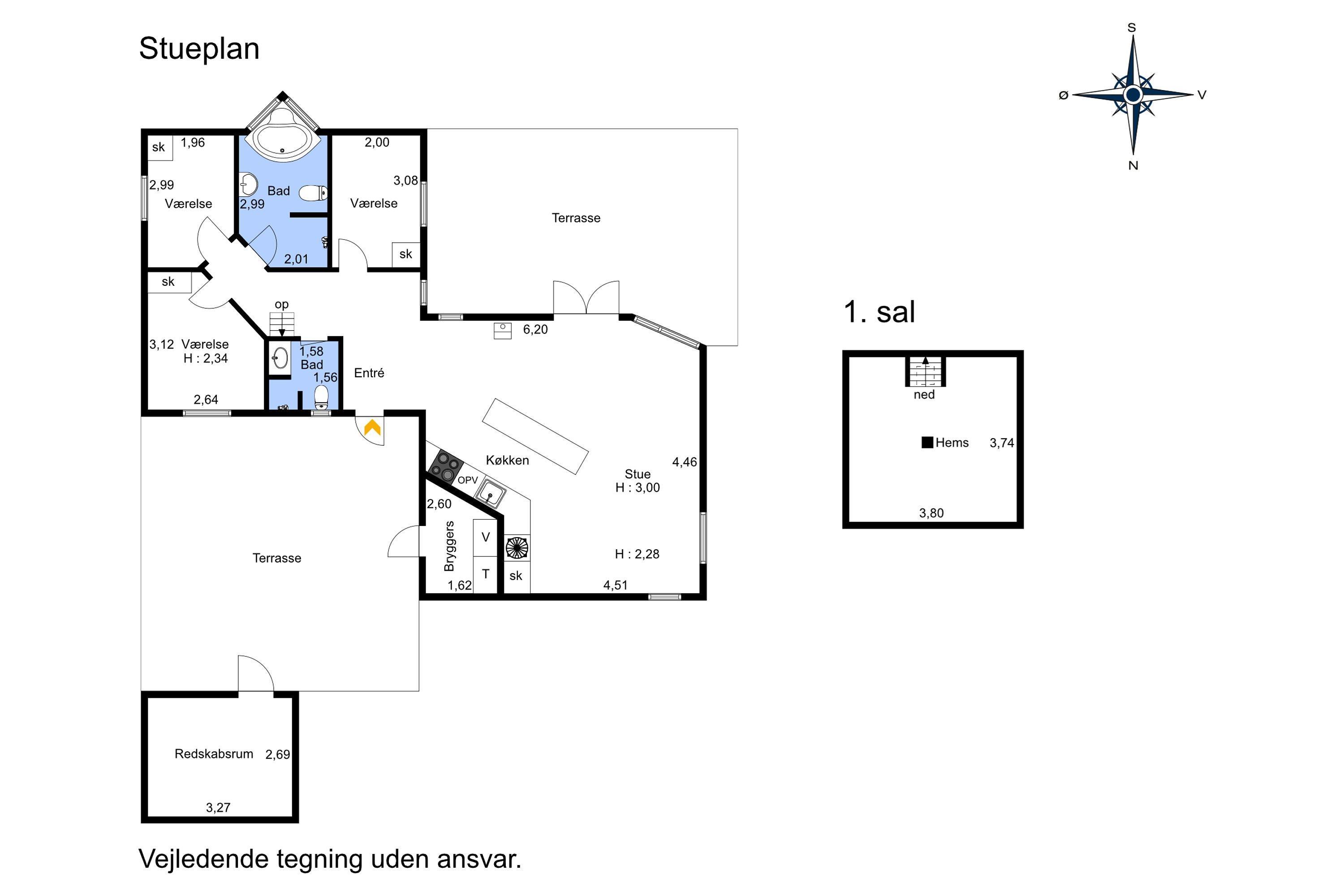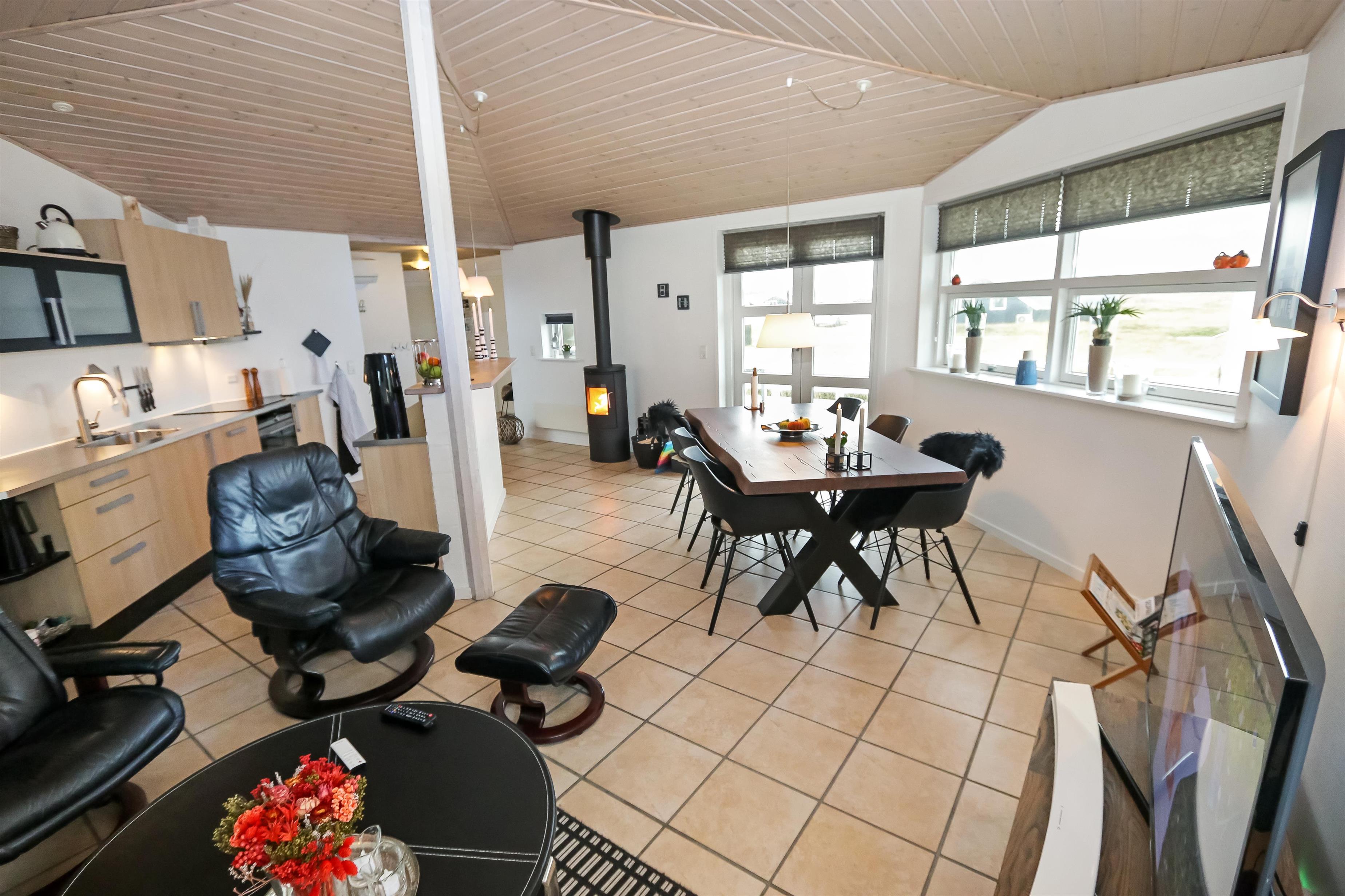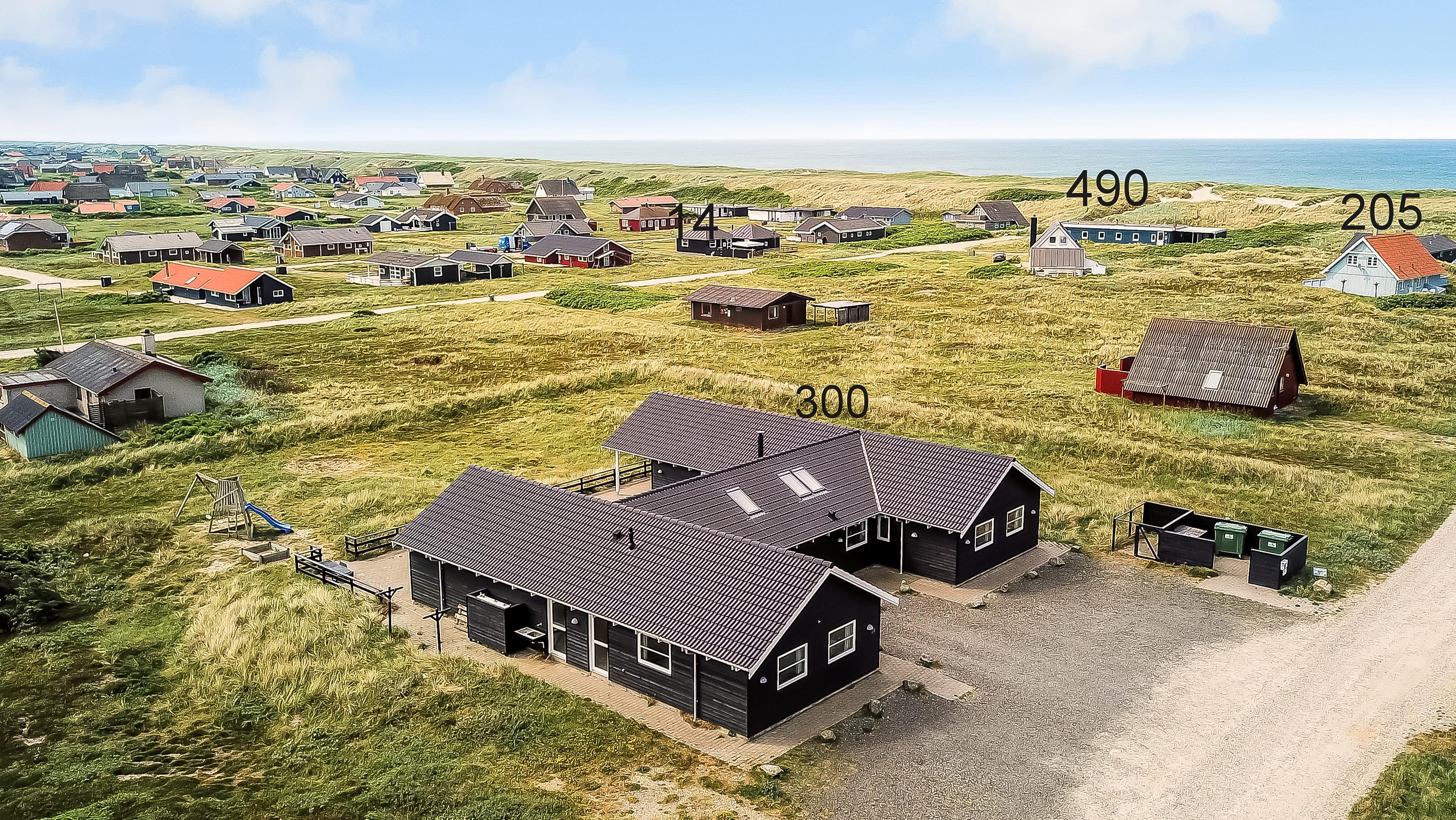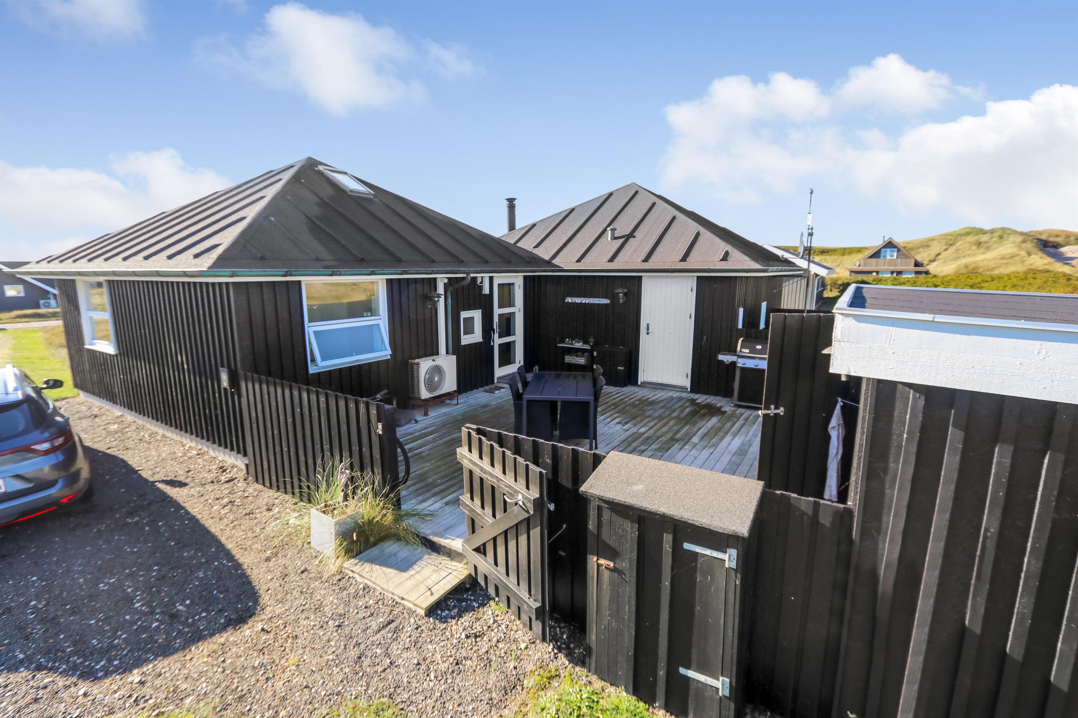 Fra opholdsstuen er der udgang til en dejlig terrasse med parasol, grill, havemøbler, liggestole samt udsigt til de høje klitter. Fra entréen er der udgang til endnu en lukket terrasse, som er det perfekte opholdssted for både børn og voksne. En feriebolig af høj kvalitet som danner den perfekte ramme for en ferie meget tæt på Vesterhavet. Hvad enten du er til aktive gåture ved stranden, tager cyklen efter morgenbrød eller blot ønsker fred og ro i unikke omgivelser, så giver dette feriehus dig alle muligheder. Der er kun ca. 1.500 m til det nærmeste supermarked. Legeplads og boldbane findes blot 100 m fra huset.