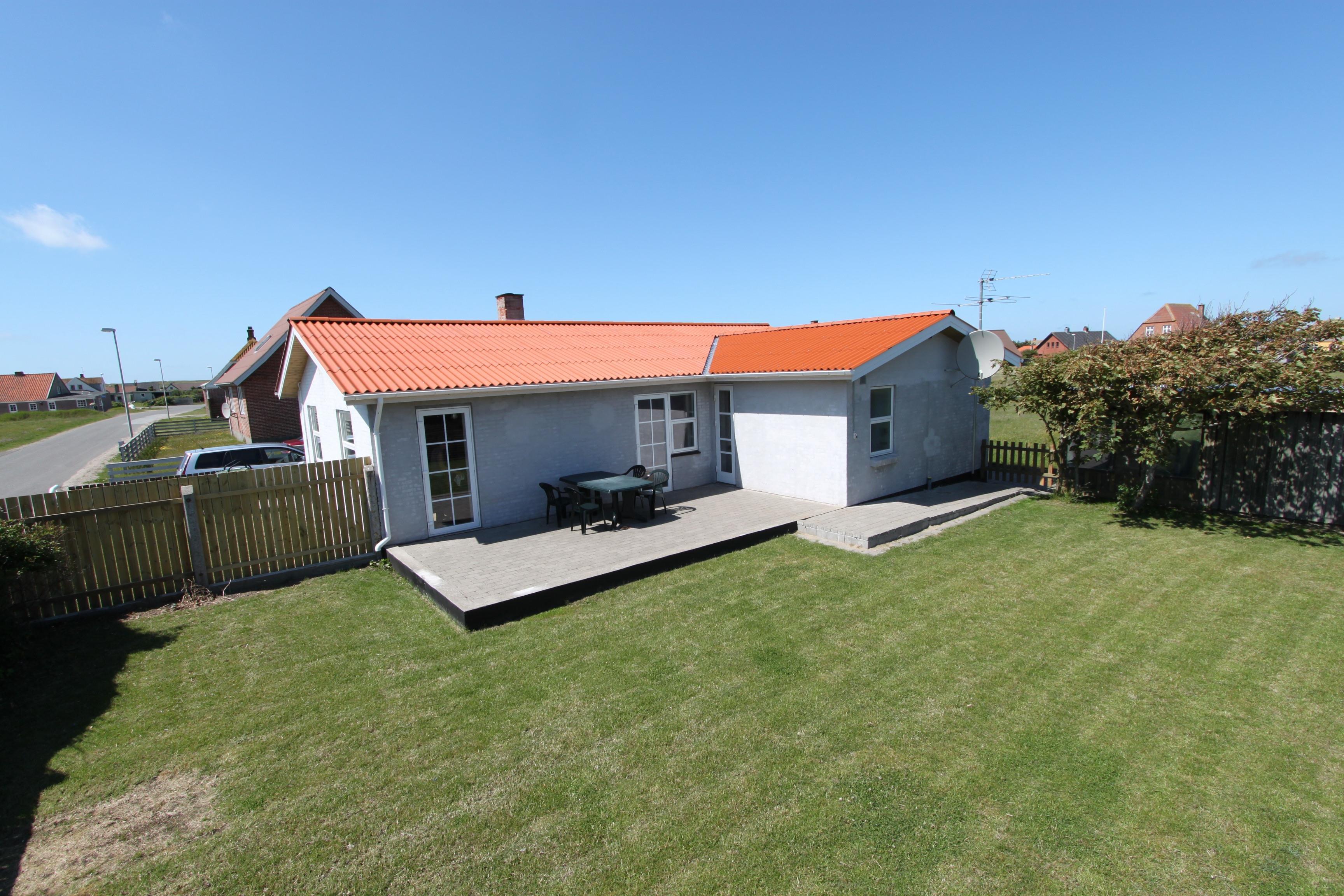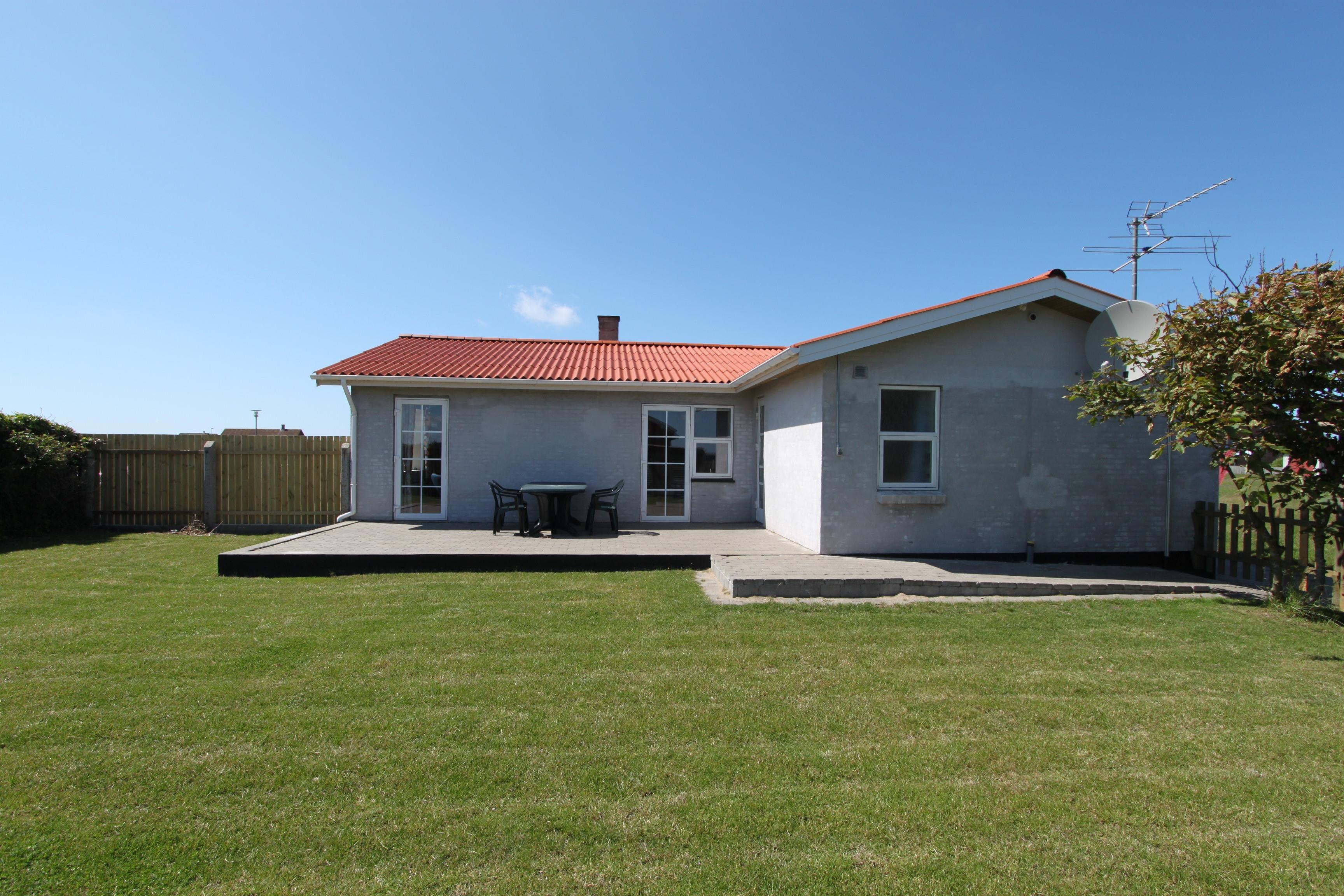 Den velholdte grund er ca. 600 m2 stor. Haven som ligger sydvendt og indhegnet indeholder stor flisebelagt terrasse med havemøbler, grill, græsplæne og gynger til børnene. Fra Stuen er der udgang til den stor terrasse. Fra køkkenet er der også udgang. Der kan altid findes en plads i solen. Et utrolig dejligt hus, hvor der er tænkt på det meste og med masser af muligheder. 10 – 15 min fra huset ligger Vesterhavet, der altid invitere til en frisk gå- eller løbetur. Nyd også at områdets købmand ligger i gåafstand fra huset og som i sæsonen byder på frisk morgenbrød og her kan de daglige indkøb også klares. Indenfor 25-30 minutter kan flere aktiviteter og shoppingmuligheder nås. Så hvad enten I er til aktiv ferie eller total afslapning, danner dette rummelige feriehus en dejlig ramme og jeres ferie.