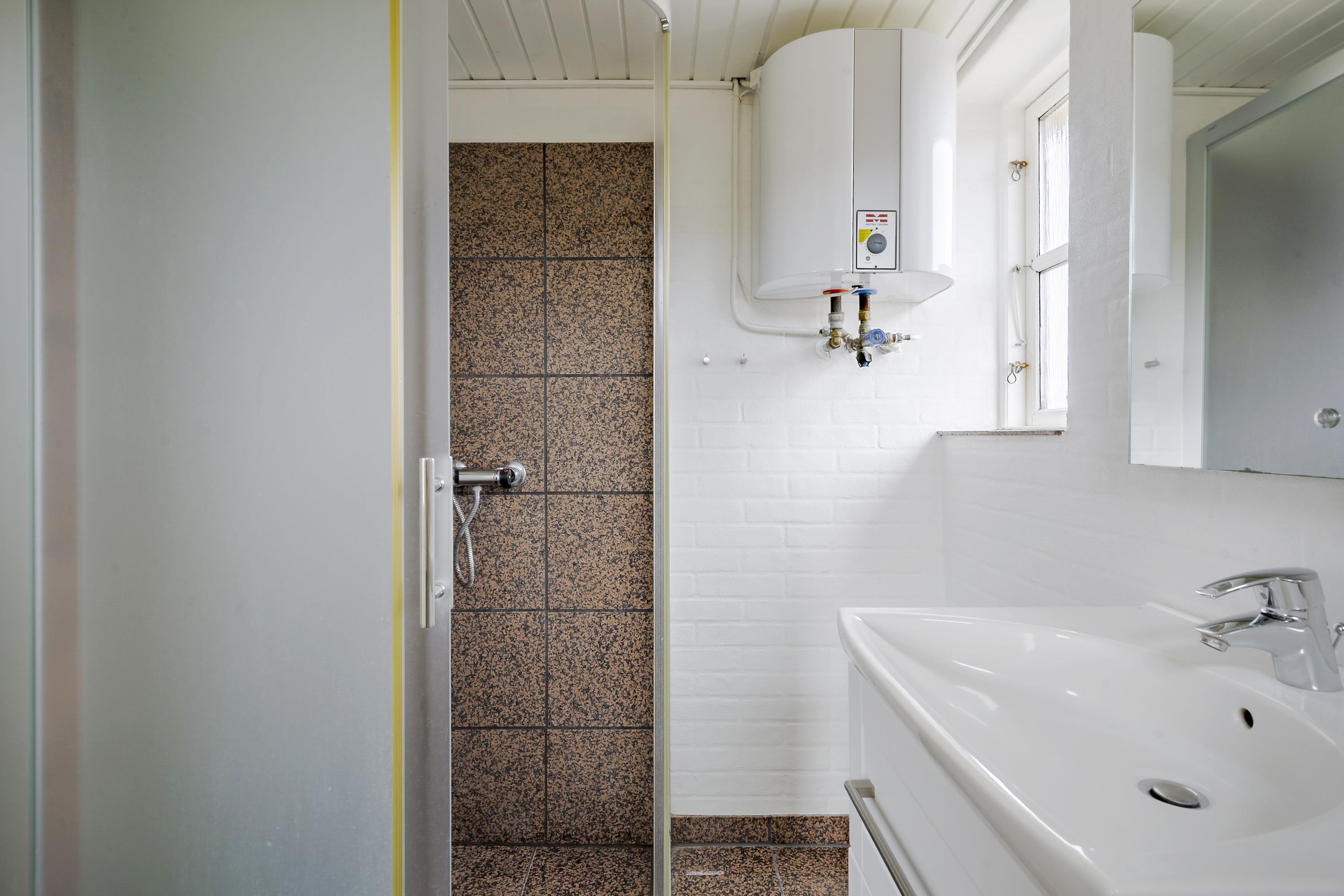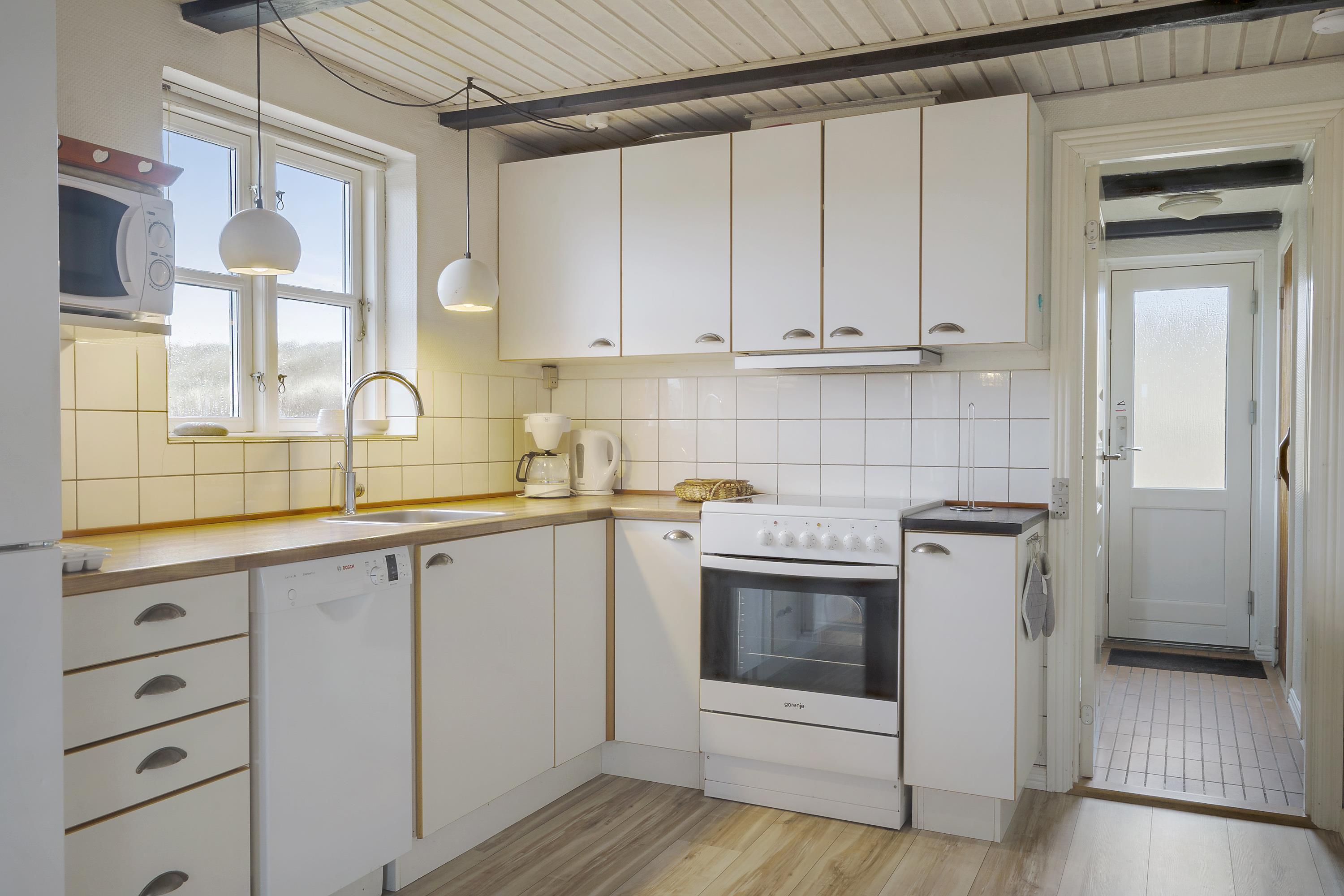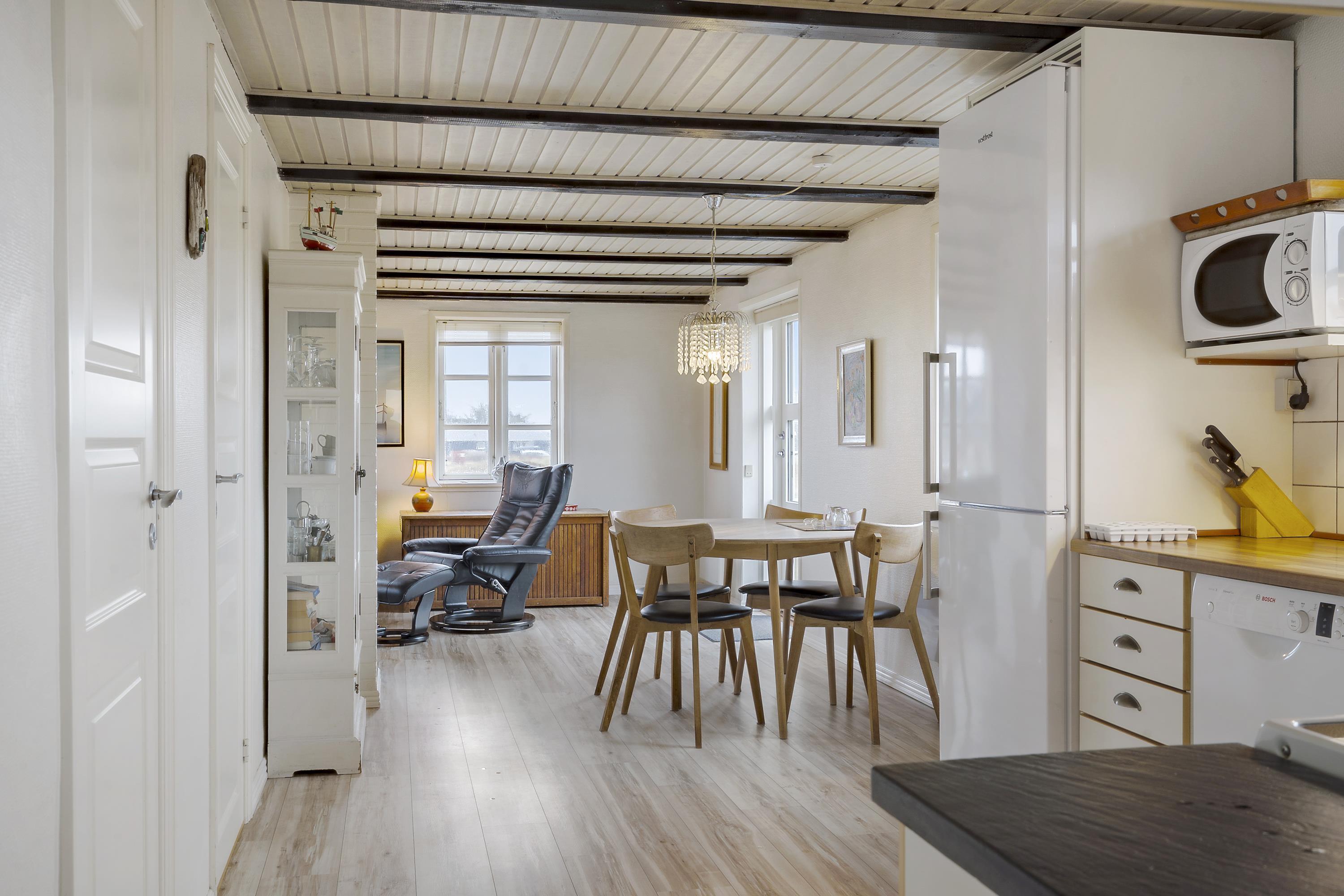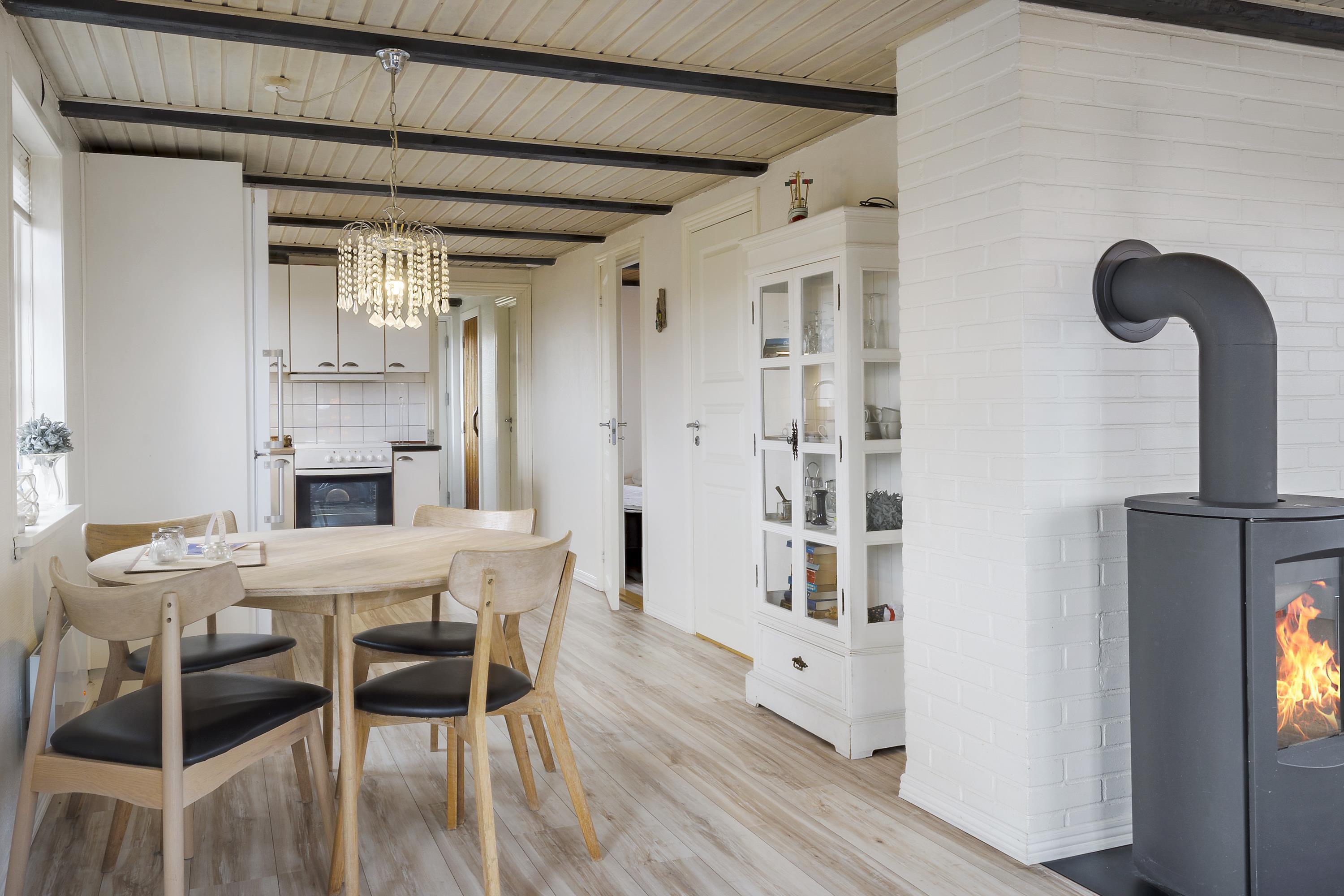 Husets store rum er køkkenet og stuen som går ud i et. I selve køkkenet er der glaskeramisk komfur, mikrobølgeovn, opvaskemaskine samt køleskab og fryser på 80 liter. Ved siden af køkkenet er der en lille spisekrog og i den anden ende af rummet er der brændeovn, sofamøblement, sofabord og fjernsyn. Her er der mulighed for at se både dansk og tysk TV samt der er radio, og CD-afspiller. Fra stuen er der også direkte udgang til den sydvendte terrasse.Badeværelset har både gulvvarme, en brusekabine, toilet og håndvask. Der er sågar også en sauna og huset ligger så tæt på havet at man sagtens nå både ned til havet og tilbage igen uden at være nedkølet efter en tur i saunaen, hvis man har disse lyster. Herudover er der 2 soveværelser hver med 2 dobbeltsenge. Herudover er der også en vaskemaskine i huset.