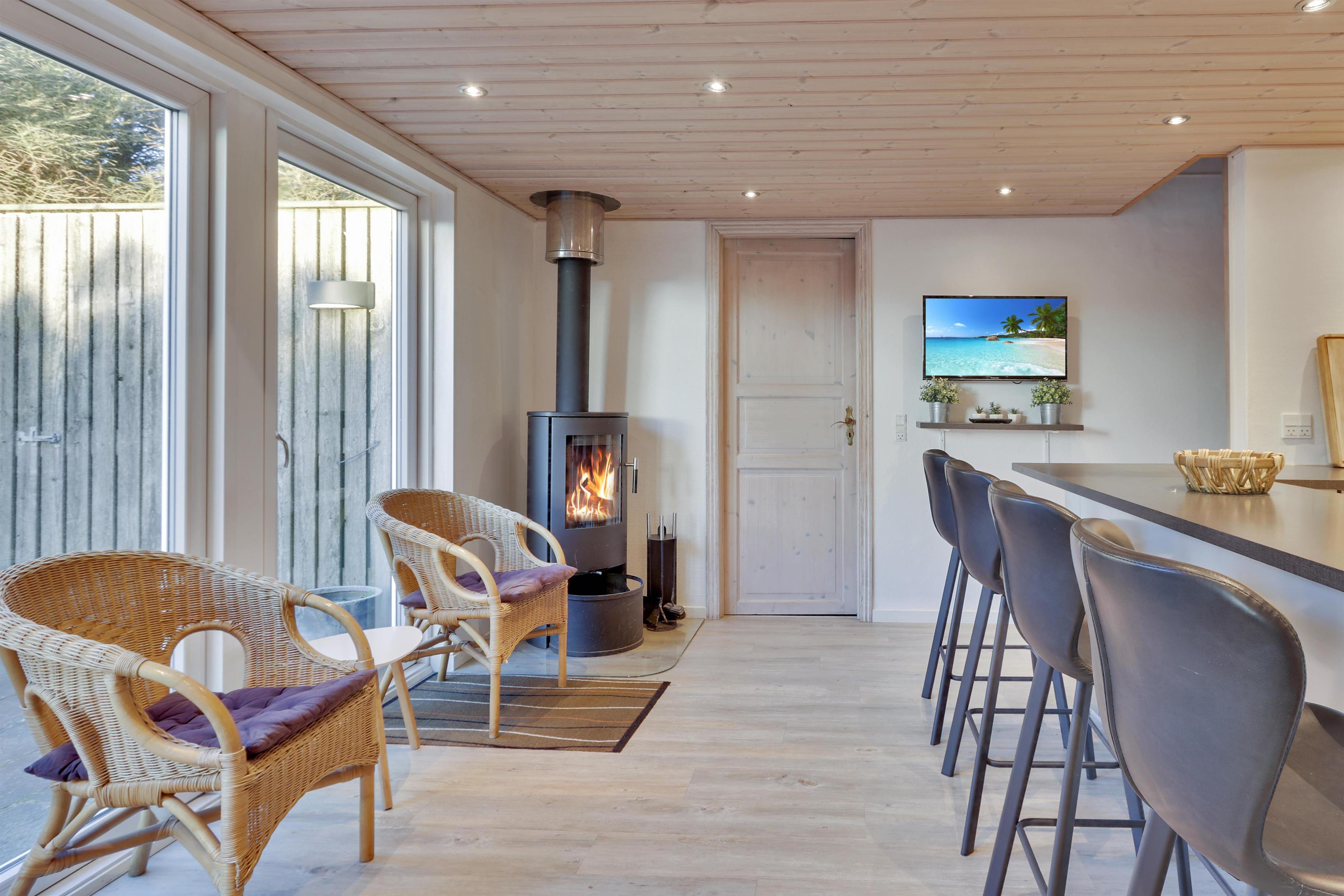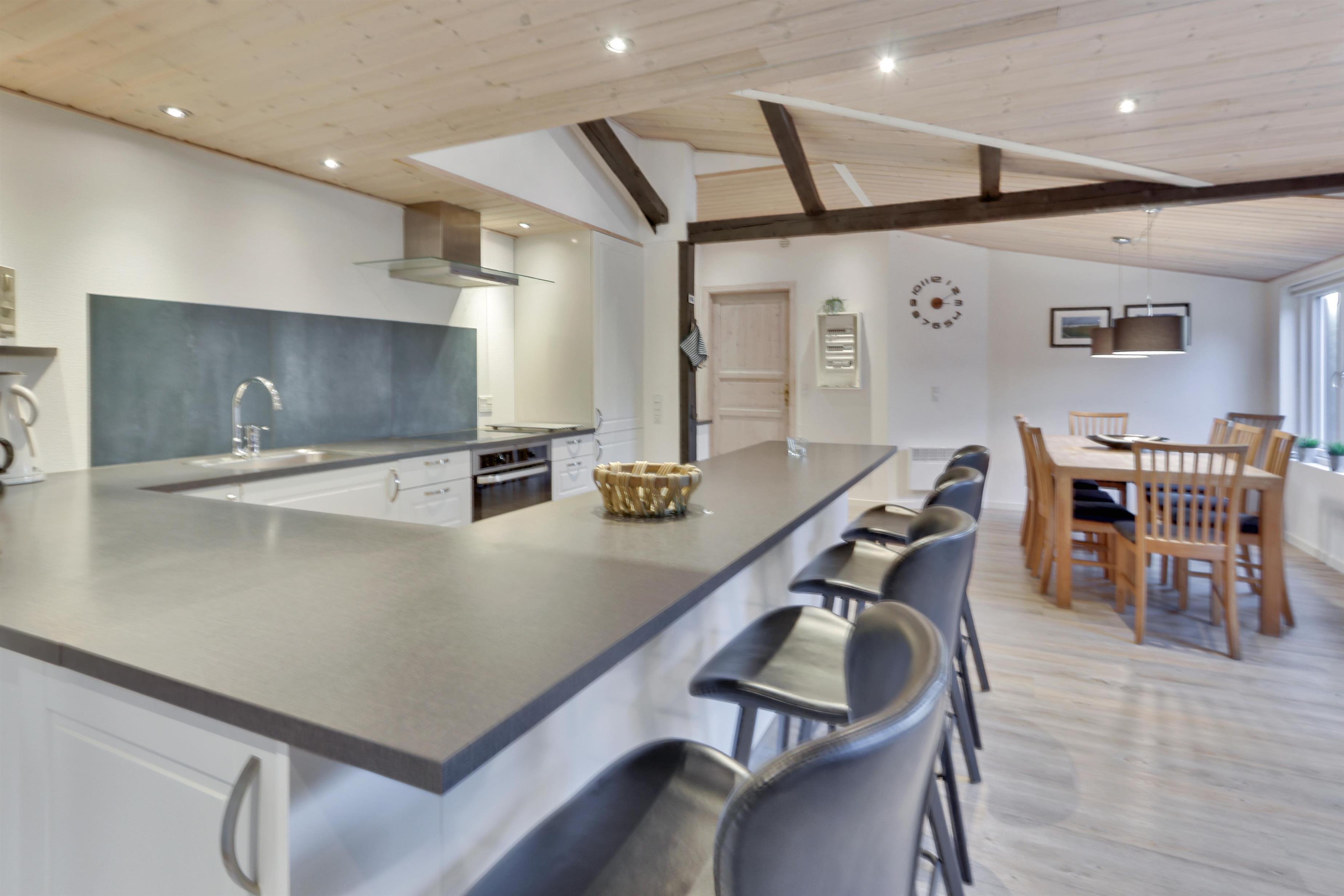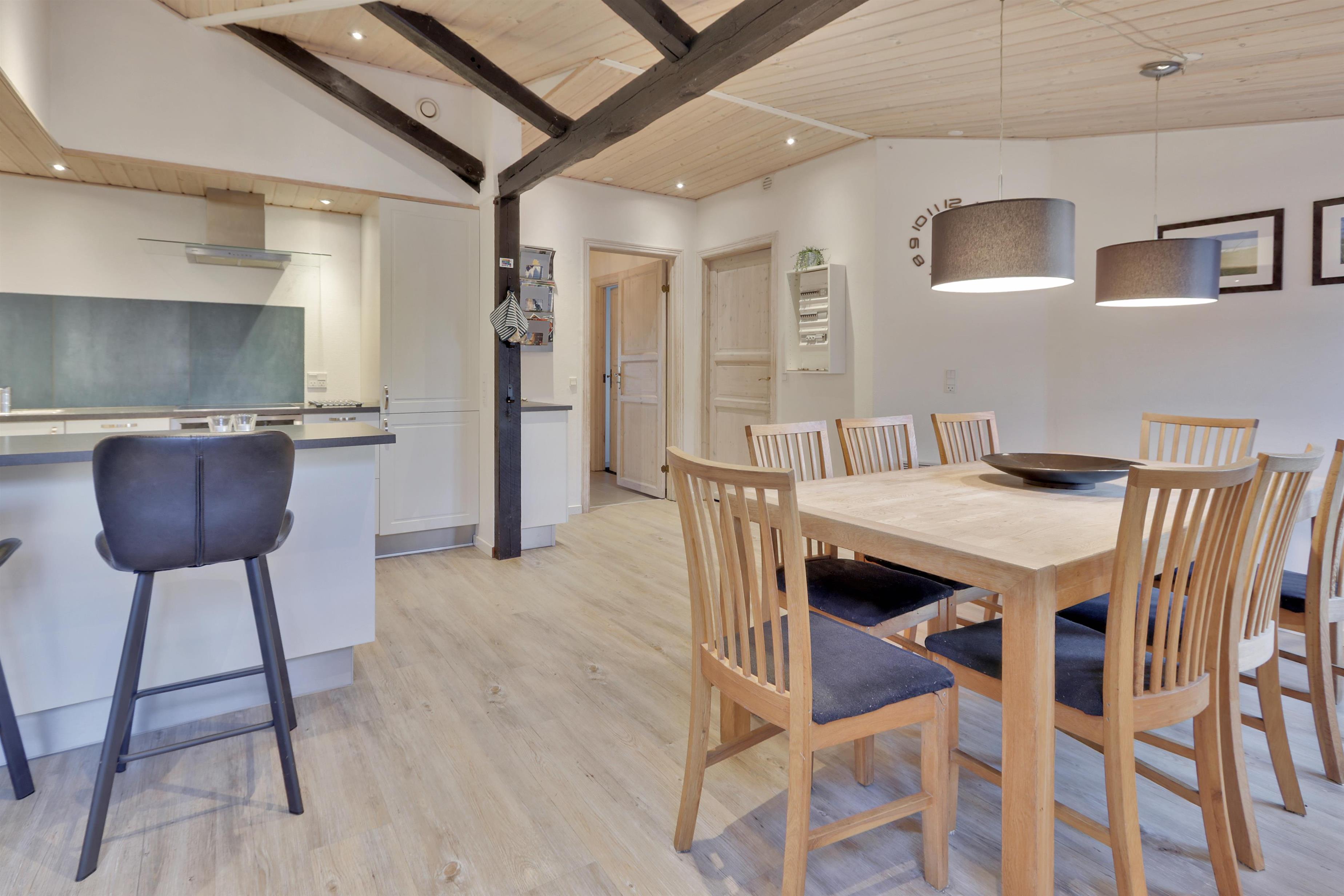 Det åbne køkken- og spiseområde er husets naturlige samlingspunkt, hvor brændeovn og varmepumpe sikrer en behagelig temperatur og hyggelig stemning – uanset årstid. Den store stue byder på loft til kip og et skønt lysindfald fra de store vinduespartier, som giver en luftig og indbydende atmosfære.