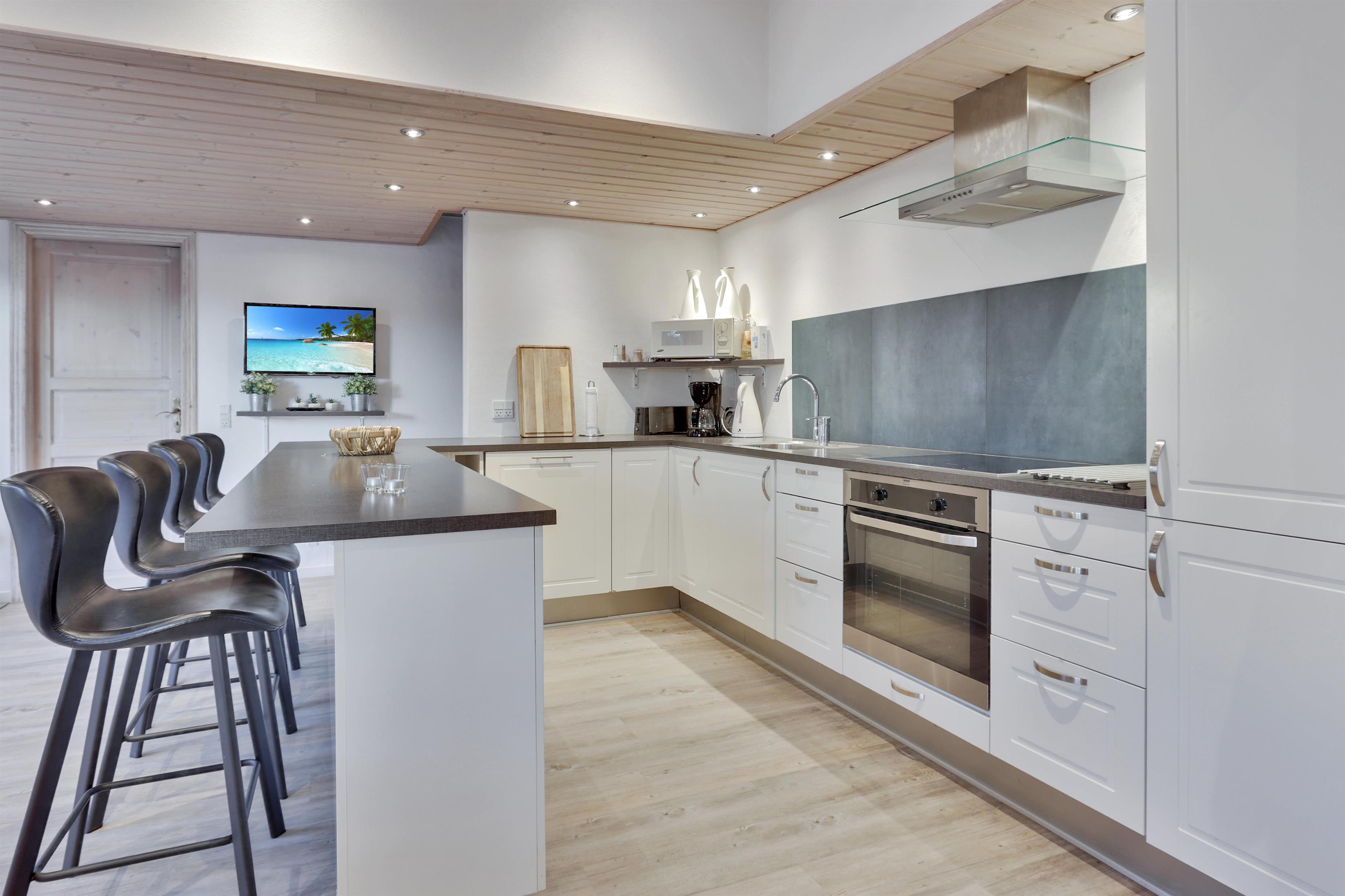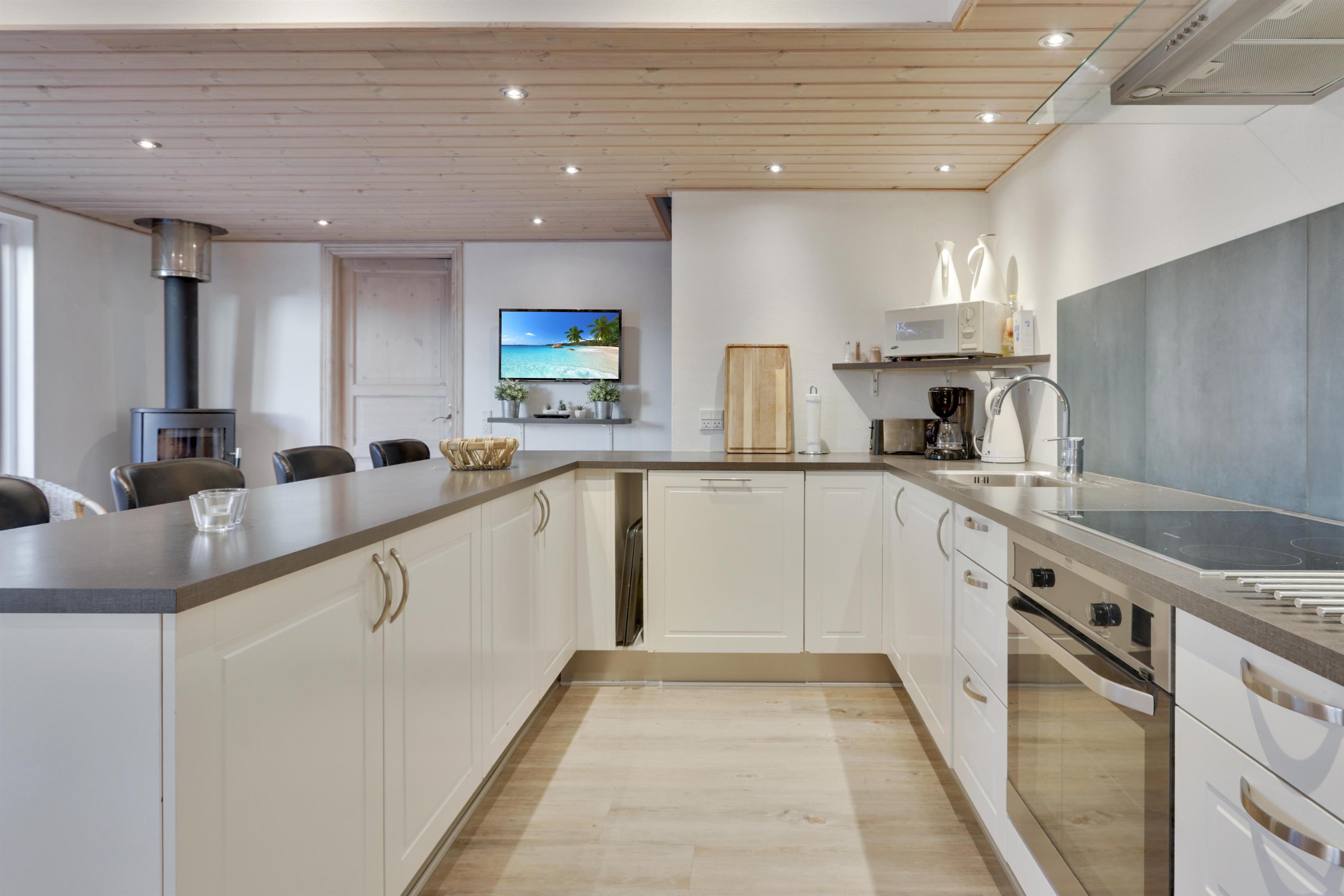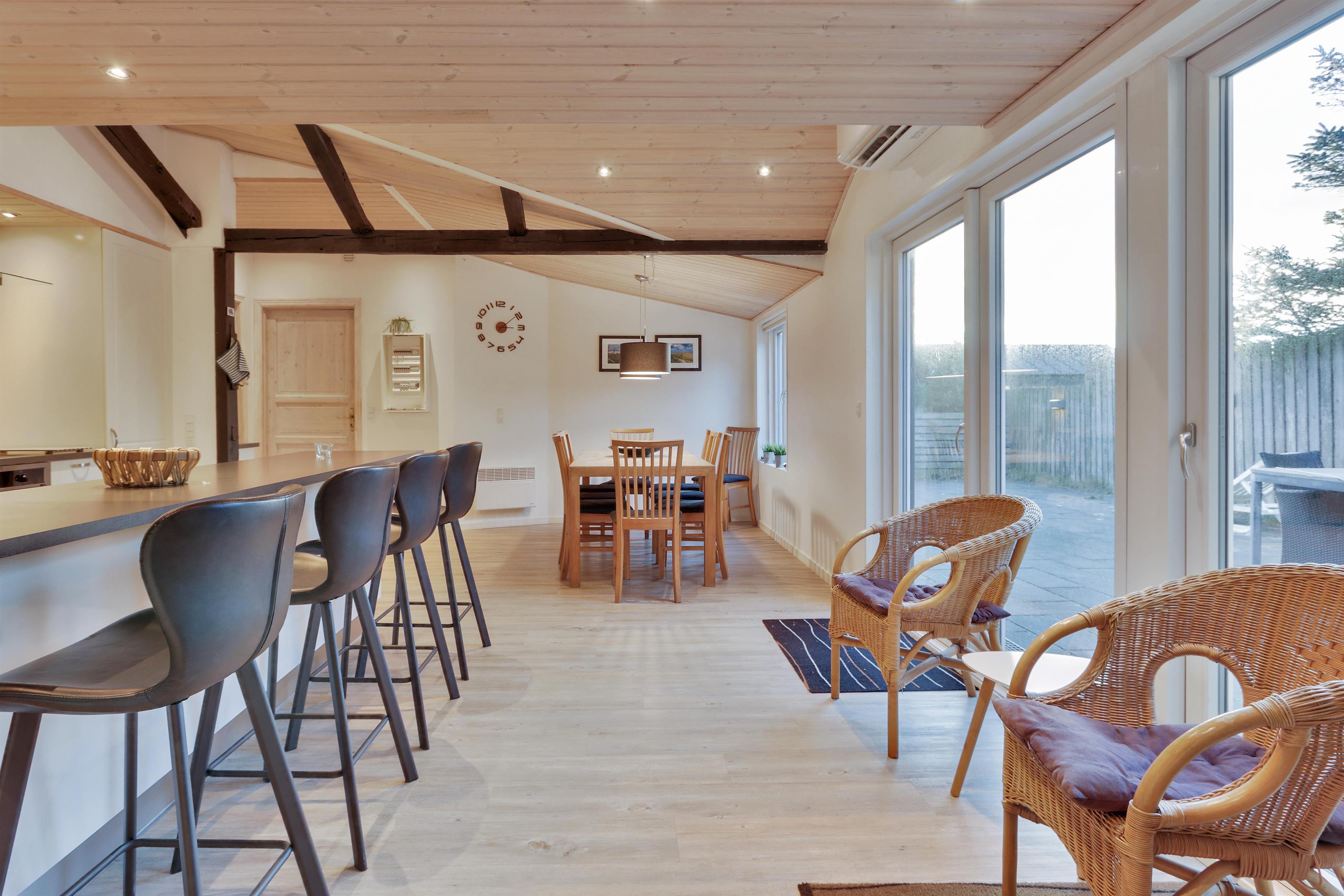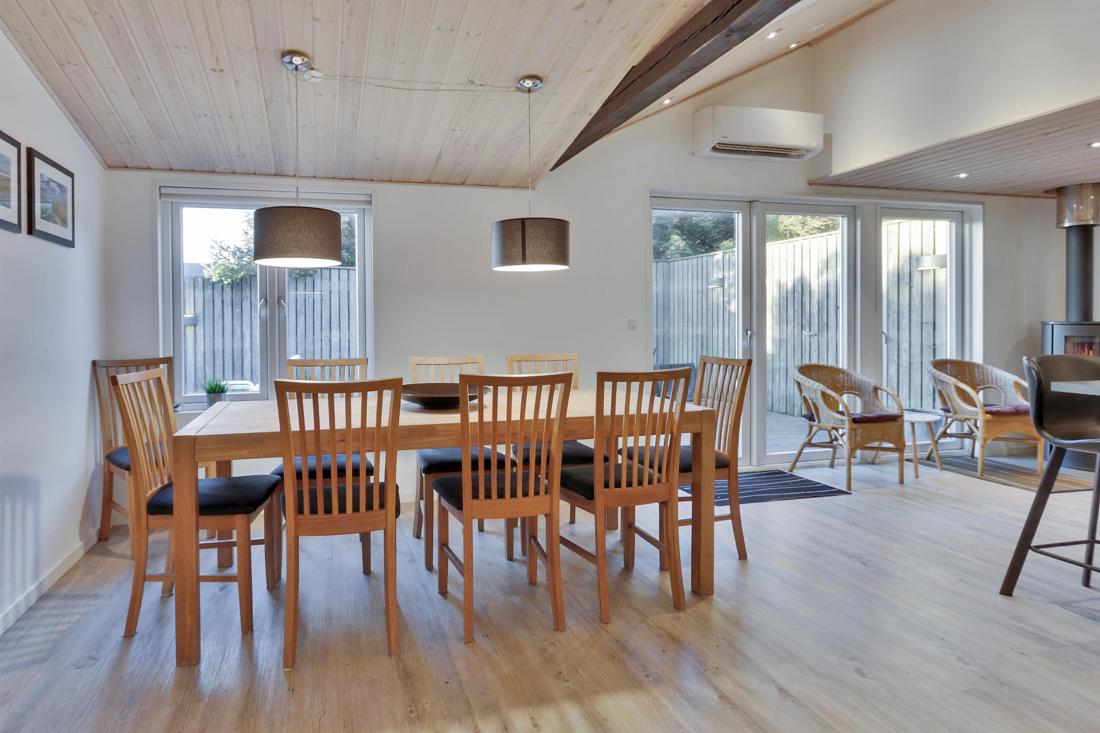 Det åbne køkken- og spiseområde er husets naturlige samlingspunkt, hvor brændeovn og varmepumpe sikrer en behagelig temperatur og hyggelig stemning – uanset årstid. Den store stue byder på loft til kip og et skønt lysindfald fra de store vinduespartier, som giver en luftig og indbydende atmosfære.